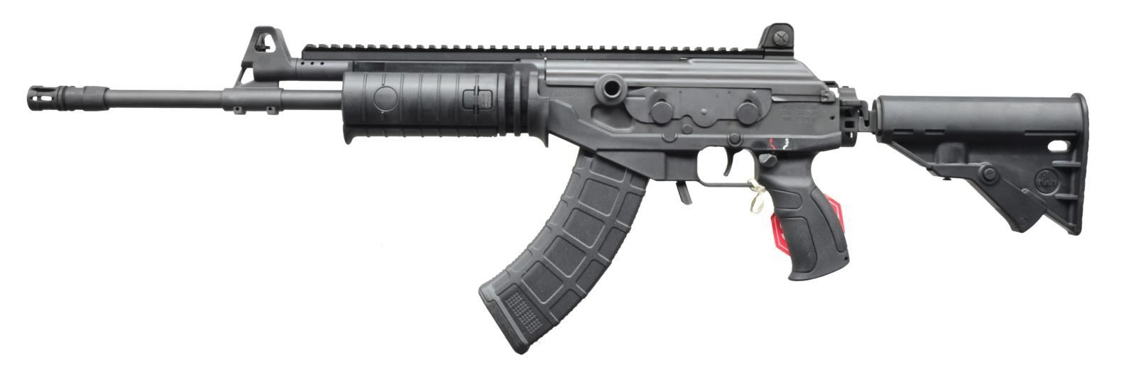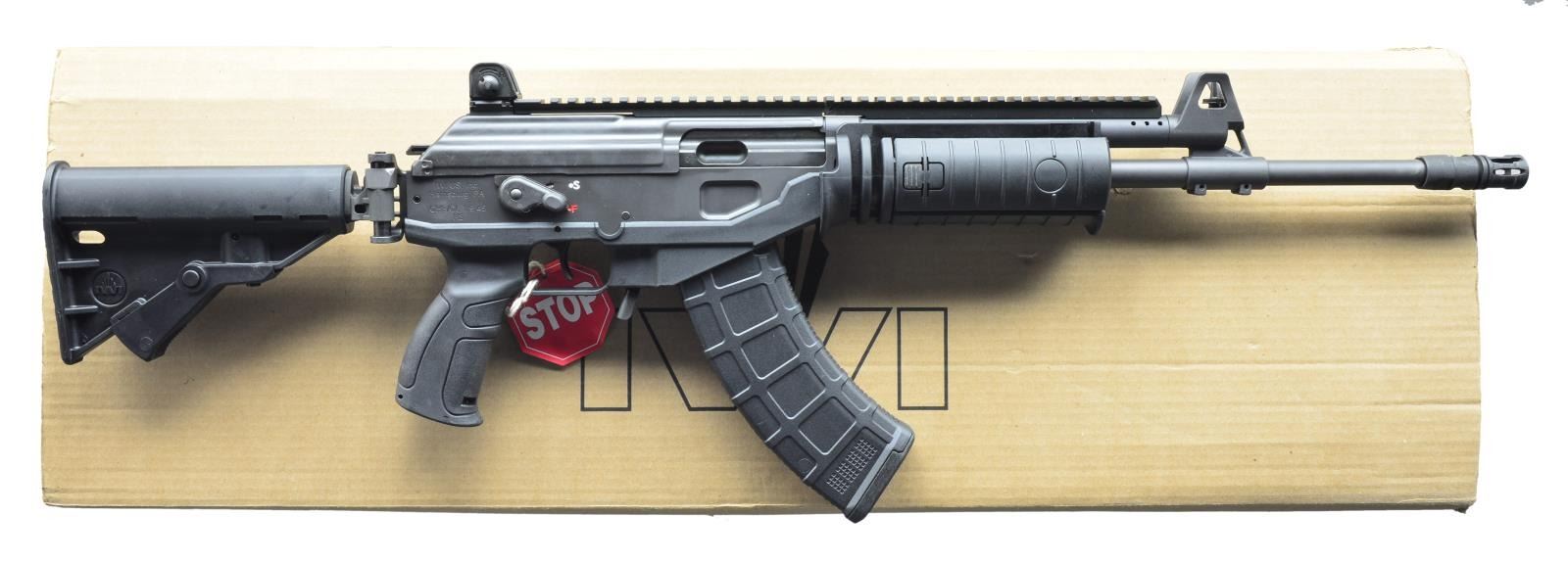 STOCK IN FACTORY BOX. Cal. 7.62x39. S# G0010456. Bbl. 16". The latest offering in the famous & battle proven line of firearms after over 25 years in hiatus. The Galil Ace is the latest evolution of the original Galil mfg. by IMI. The Ace mfg. by IWI consists of numerous improvements over the original while retaining the fundamentals that made it so popular. Dark black finish on all exposed surfaces is contrast only by a sm. splash of red & white, determining the position of the ambidextrous safety/selector. W/ 15" of regulated rail space, there are several options for optic mounting. The forend is comprised of 3 more 5" rail sections at 3, 6, 9 o’clock concealed w/ hard plastic covers when not in use. The sights composed of a protected post that’s elevation adj. in front & a windage adj. variable peep in the rear & have a radius of 17". Paddle style mag. release synonymous w/ traditional AK designs. The 6 position collapsible buttstock also functions as a right side folder that at no point interferes w/ the function of the firearm so it may be utilized comfortably in either position. The charging handle has been moved from a top hold on the right side to the left side & remains fully reciprocating like the original. The weight typically associated w/ a milled steel receiver is offset by the use of numerous polymers, such as in the stock assembly & grip area. It utilizes a familiar top cover assembly similar to the original Galil & several guns that have been inspired by the AK47 design. It remains a rotating bolt, gas piston driven system. Bbl. is a 1 in 9.45" right hand twist w/ 4 grooves. It utilizes the popular & readily available AK47 mag. MAGS: 1-30 rd. Magpul P-Mag. UNATTACHED ACCESSORIES: factory cheek riser utilized w/ optic mounting to maintain a low profile for open sights, factory styrofoam lined cardboard box, gunlock, owner’s manual. CONDITION: finish on all exposed metal surfaces appears unblemished, all outward aspects point towards extremely low use if any at all. Factory safety hang tag still remains on trigger guard. Bore is shiny w/ strong rifling & fire control mechanism appears to function correctly when cycled by hand. (21-730/JZ). MODERN. $900-1,400.