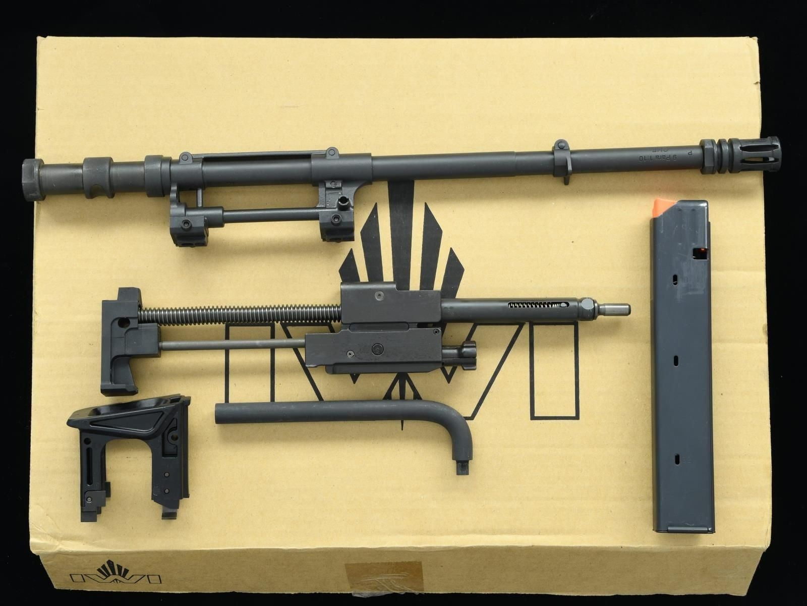 Cal. 9mm. S# 112723. Bbl. 17". Pistol caliber conversion to convert a 5.56x45mm Tavor SAR to 9x19mm. Kit includes all parts necessary to run 9mm Parabellum including a 1:10 threaded barrel w/ flash hider, bolt & magazine. Black, parkerized. MAGS: 1 factory 32rd. UNATTACHED ACCESSORIES: Factory box & paperwork. CONDITION: All aspects indicate as new. (02-20847-8/JZ). NON-GUN. $550-750.