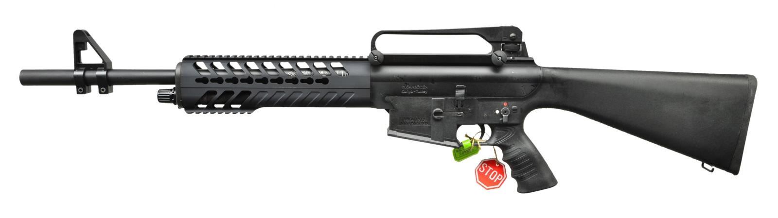Cal. 12 Ga. S# E1502811. Bbl. 19.7". Magazine fed, self loading shotgun styled heavily on the AR-15. 10" Rail system w/ picatinny rail on top & keymod sides w/ 4" picatinny rail on bottom. Matte black finish on all exposed areas. Protected post front sight w/ removable carry handle & E2 adjustable rear sight, providing over 18" of regulated top rail when removed. Ambidextrous safety / selector. Right side reciprocating charging handle. 1 piece polymer lower receiver, pistol grip & full length shoulder stock. MAGS: 2 steel 5 rd. UNATTACHED ACCESSORIES: original box, choke set & wrench, paperwork. CONDITION: all aspects indicate as new. No outwardly visible sign of use. Bright, shiny bore. (22-3484/JZ). MODERN. $200-400.