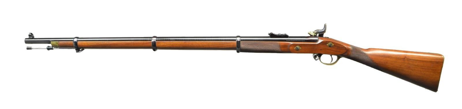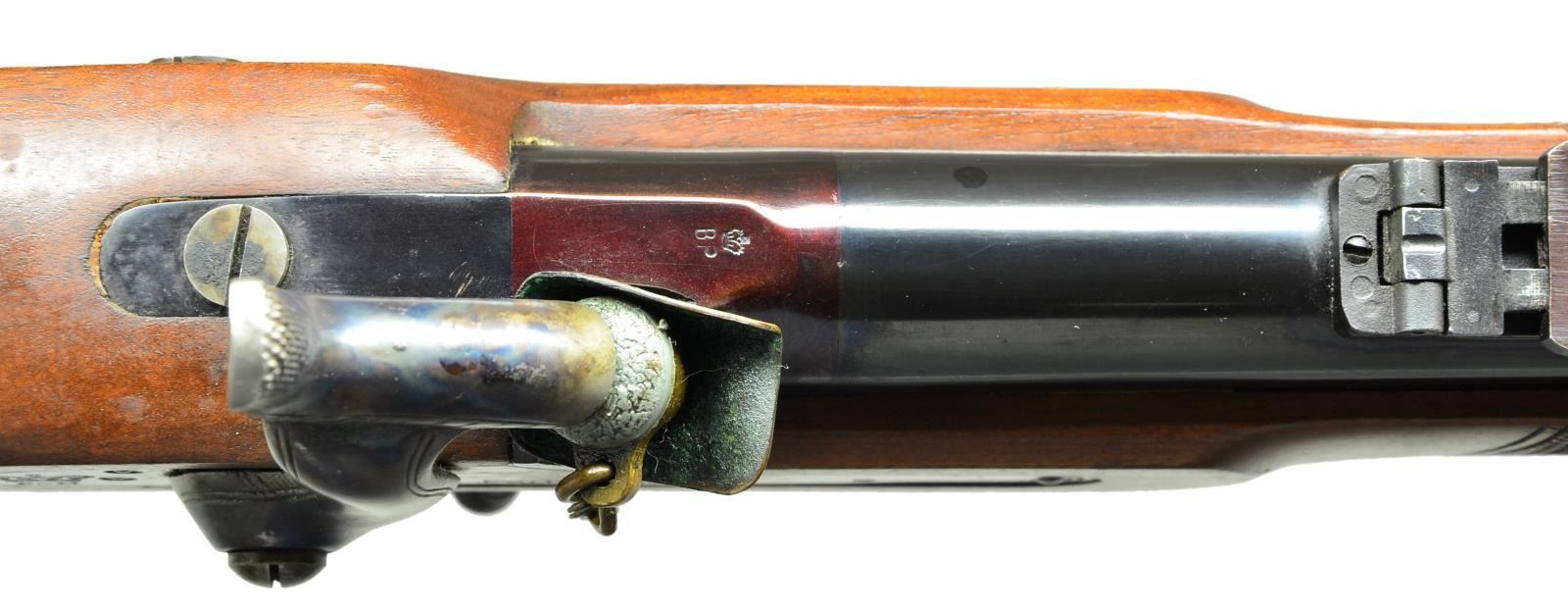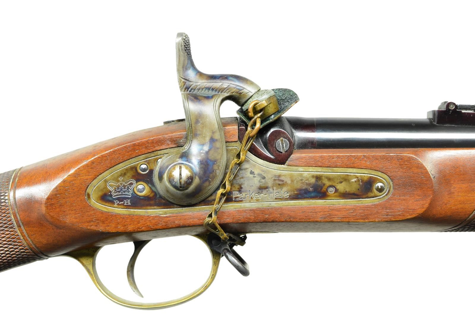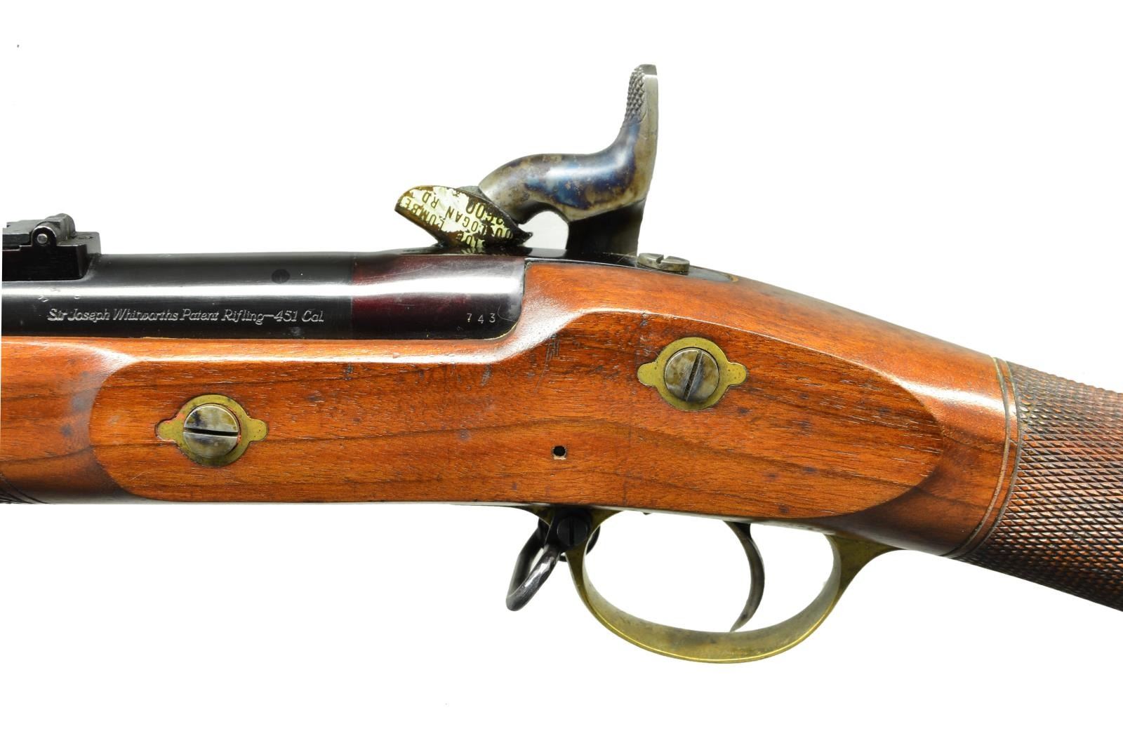 Cal. 451. S# 743. Bbl. 36”. This rifle appears new and unfired, dates from 1970s, made in Birmingham, England, not the more recent Italian made copies. Breech “Sir Joseph Whitworth Patent Rifling-451 Cal”, top of barrel “PARKER HALE LIMITED. BIRMINGHAM ENGLAND” , proofed “crown / BP”, checked stock, 3 blued steel clamping bands, brass furniture just like the Civil War era version, long range ladder rear sight & hooded pin front sight. CONDITION: Excellent, barrel retains virtually all original bright blue, lock retains most all it case hardened colors, appears unfired, crisp action, bright mirror like hexagonal bore. (01-22912/JS). ANTIQUE. $1,500-2,000.