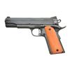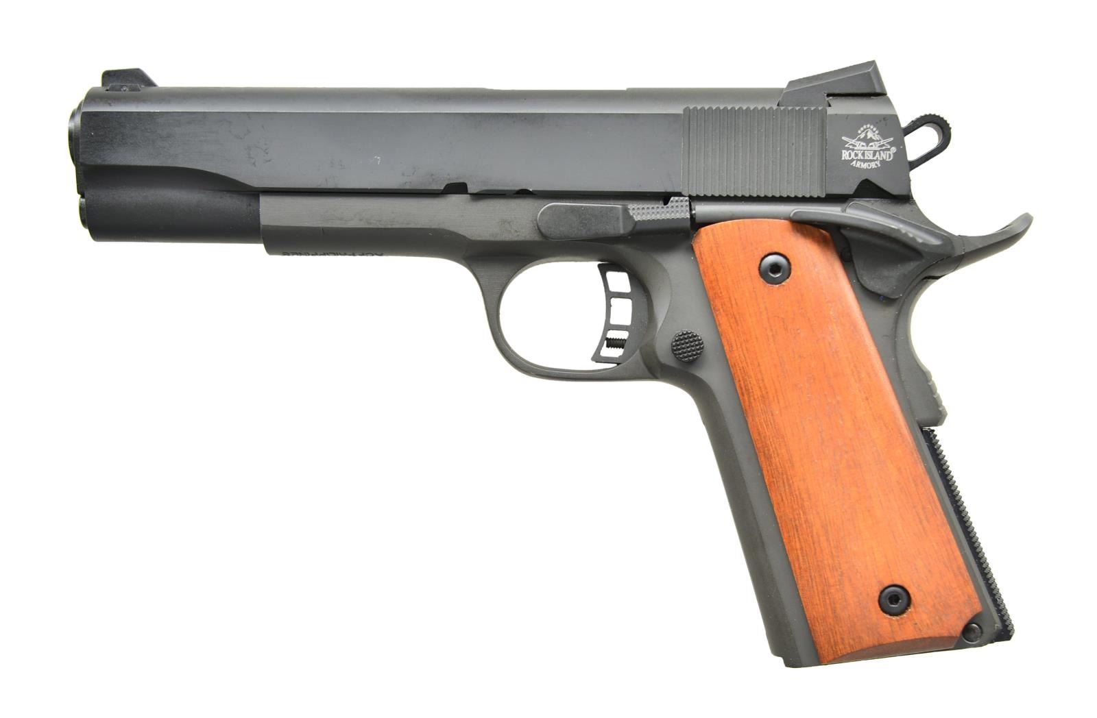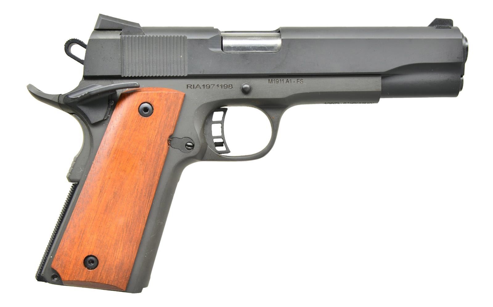 Cal. 45 ACP. S# RIA1971198. Bbl. 5". A Rock Island Armory variant of the popular 1911 A1 series. All exposed metal surfaces are black matte finished. Serrated slide w. dovetail sights. Skeletonized, serrated hammer. Skeletonized, adjustable trigger. Ambidextrous extended thumb safety. Extended beavertail / grip safety. Checkered slide & magazine release. Checkered rear mainspring housing. Serrated front strap. Lightly beveled magazine well. Wood grips. MAGS: 1 factory 8 rd. UNATTACHED ACCESSORIES: black plastic factory foam lined case w/ lock & paperwork. 1 Spare set of black checkered, double diamond grips. CONDITION: all aspects indicate very little use, if any. No obvious finish degradation. Bright bore w/ strong rifling. Fire control mechanism appears to function correctly when cycled by hand. (22-3423/JZ). MODERN. $400-600.