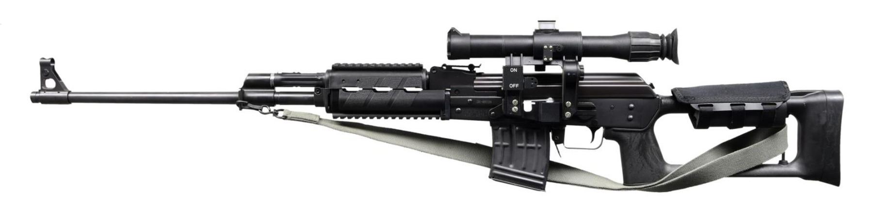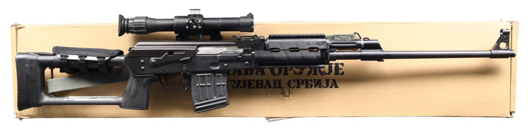 Cal. 7.62x54R. S# Z91-002298. Bbl. 24". Hammer forged, 1:9 chrome lined, 14x1 threaded barrel, w/ spot welded thread protector. Dark black finish on all exposed metal surfaces. Black plastic furniture. Picatinny rails for accessory mounting on forend at 12 O'clock & 6 O'clock w/ ladder rail covers. Hooded post front sight. Rear tangent sight marked 100 meters to 1000 meters w/ CQB setting. 1.5mm stamped receiver w/ left side scope rail. Sporting POSP 4x24 scope. Adjustable gas flow regulator. Full length skeletonized stock w/ pistol grip & cheek riser. Sling attachment points front & rear, currently sporting green canvas sling. MAGS: 2 matching numbered 10 rd. UNATTACHED ACCESSORIES: Factory cardboard box & paperwork for rifle & scope. CONDITION: Very little sign of prior use. Finish coverage complete & consistent w/ almost no outward sign of prior use. Dope card for S&B 180 gr. FMJ taped to stock, Bright bore w/ strong rifling. Fire control mechanism appears to function correctly when cycled by hand. PROVENANCE: From the Working Reference Collection of Military Arms Instructor, Master Sergeant Vincent Pestilli. (23-7497/JZ). MODERN. $2,000-3,000.