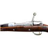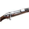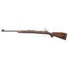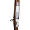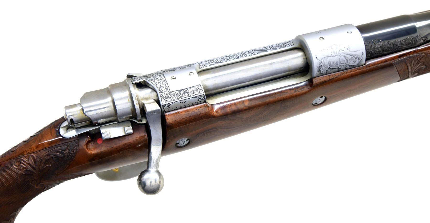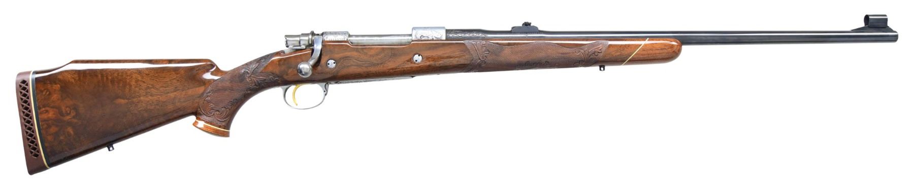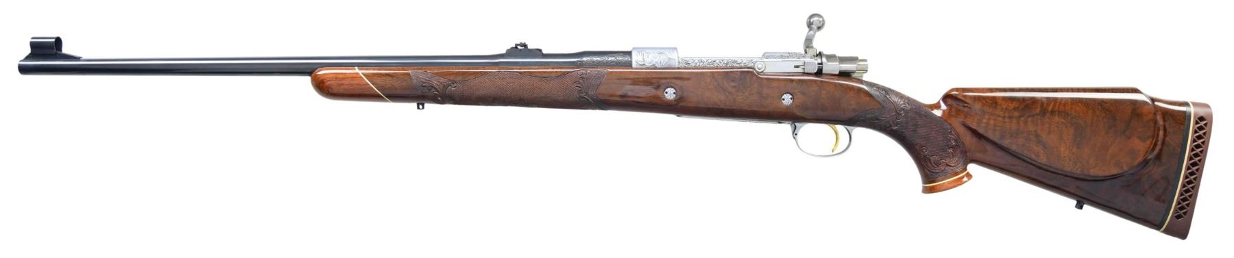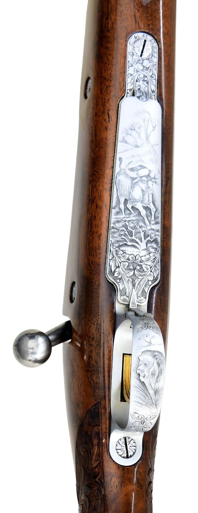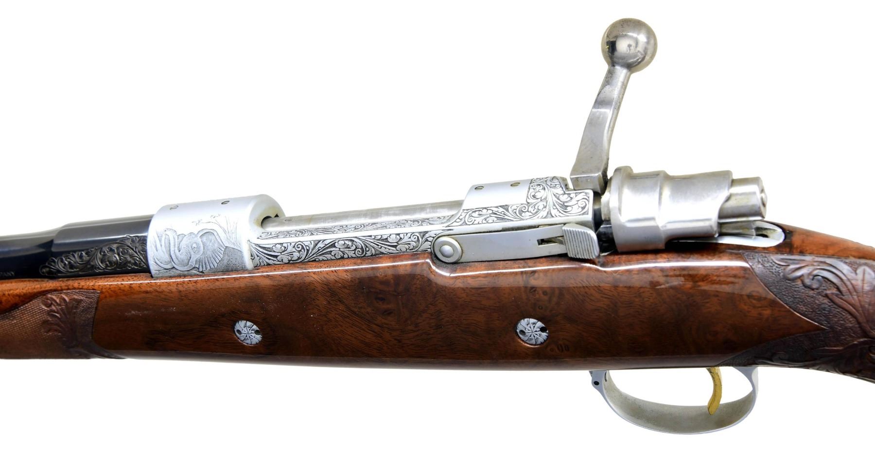 OLYMPIAN GRADE BOLT ACTION RIFLE IN 458 WIN MAG. Cal. 458 Win. Mag. S# 55963L70. The 24" medium weight round barrel is fitted with open sights and has all correct factory markings. Foliate scroll engraving is at breech end. French gray action is engraved with matching scroll on side wall and bridge. Receiver ring is engraved with scenes of trumpeting elephant on left and running rhino on right. Both of theses scenes are signed "L. Cortis" (only visible when metal is removed from stock). Bottom metal with hinged floorplate is engraved with matching scroll surrounding a charging buffalo on floorplate and head of a roaring lion on trigger guard bow. Buffalo scene is signed "L. Lambert" and lion is signed "L. Cortis". Pistol grip buttstock of stump and fiddle figured Claro walnut measures 13-3/4" over brown Browning pad. Stock features Monte Carlo comb with swept right hand cheek piece, recoil bolts, sling eyes and rosewood grip cap and forend tip, both of which have white line spacers. A gold diamond is on bottom of grip cap. Fancy pattern closely spaced checkering at grip and around forend is flanked by relief carved acanthus scroll and stippling. CONDITION: very fine showing light use. Metal retaining nearly all factory blue and gray finishes. Wood finish shows some minor marks and some light rubs. No salt damage is noted (not tested). Bore is bright and shiny. Mechanically fine. (24-2220/MGM). CURIO. $6,000-8,500.