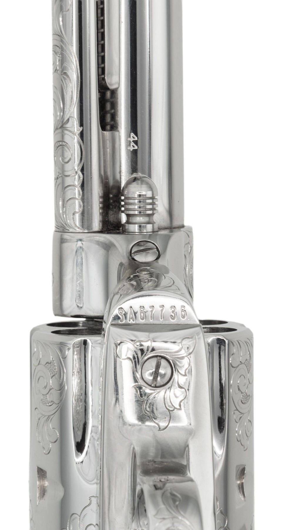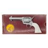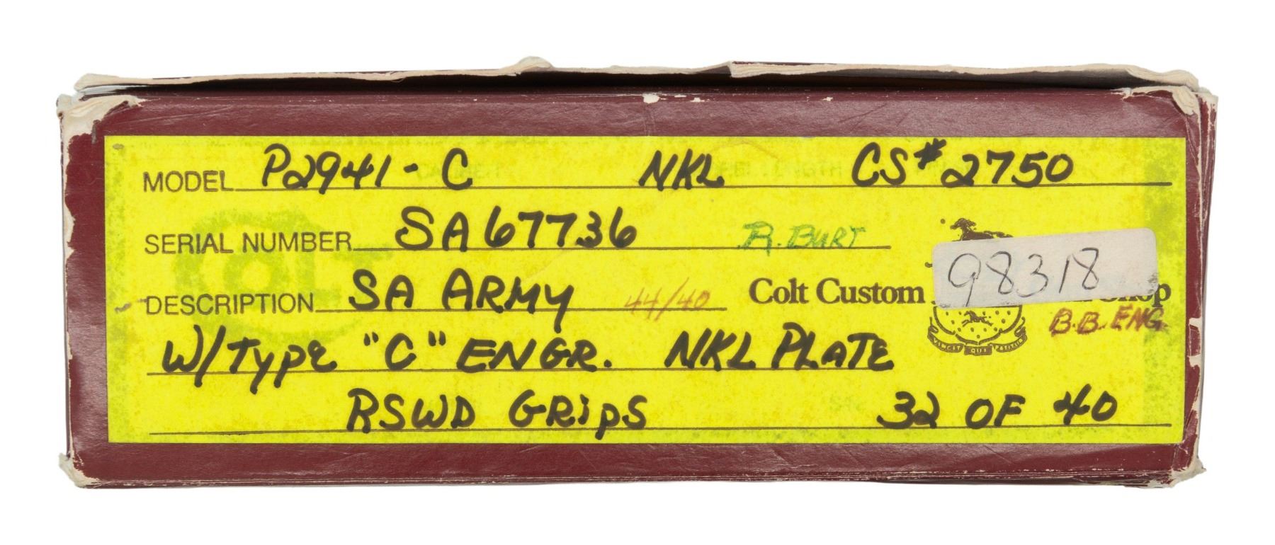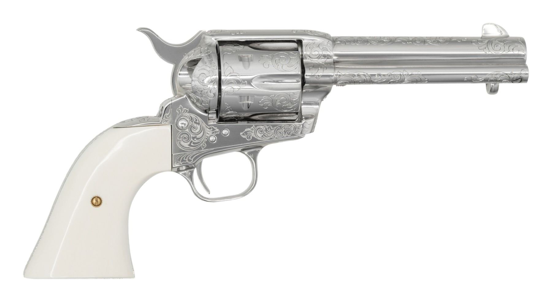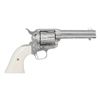 3RD GEN FRONTIER SIX SHOOTER SAA REVOLVER. Cal. 44-40. S# SA67736. Bbl. 4 3/4". Mfg. 1986 with "blackpowder" frame and full nickel finish. Frame, 6 shot fluted cyl., bbl. & grip frame have type "C" factory floral scroll engraving over punch dot background. Old style bullseye ejector head. Replacement smooth white 1 piece grip with 2 raised relief stallion busts on left side. UNATTACHED ACCESSORIES: original matching numbered smooth 2 piece rosewood grips with silver Colt medallions. Original box containing styrofoam inserts, paperwork and hang tag. Custom shop end label reads "w/ type "C" engr. NKL Plate RSWD Grips and 32 of 40". CONDITION: all aspects near excellent; appears new. (25-1507/BH). CURIO. $4,000-6,000.
