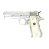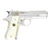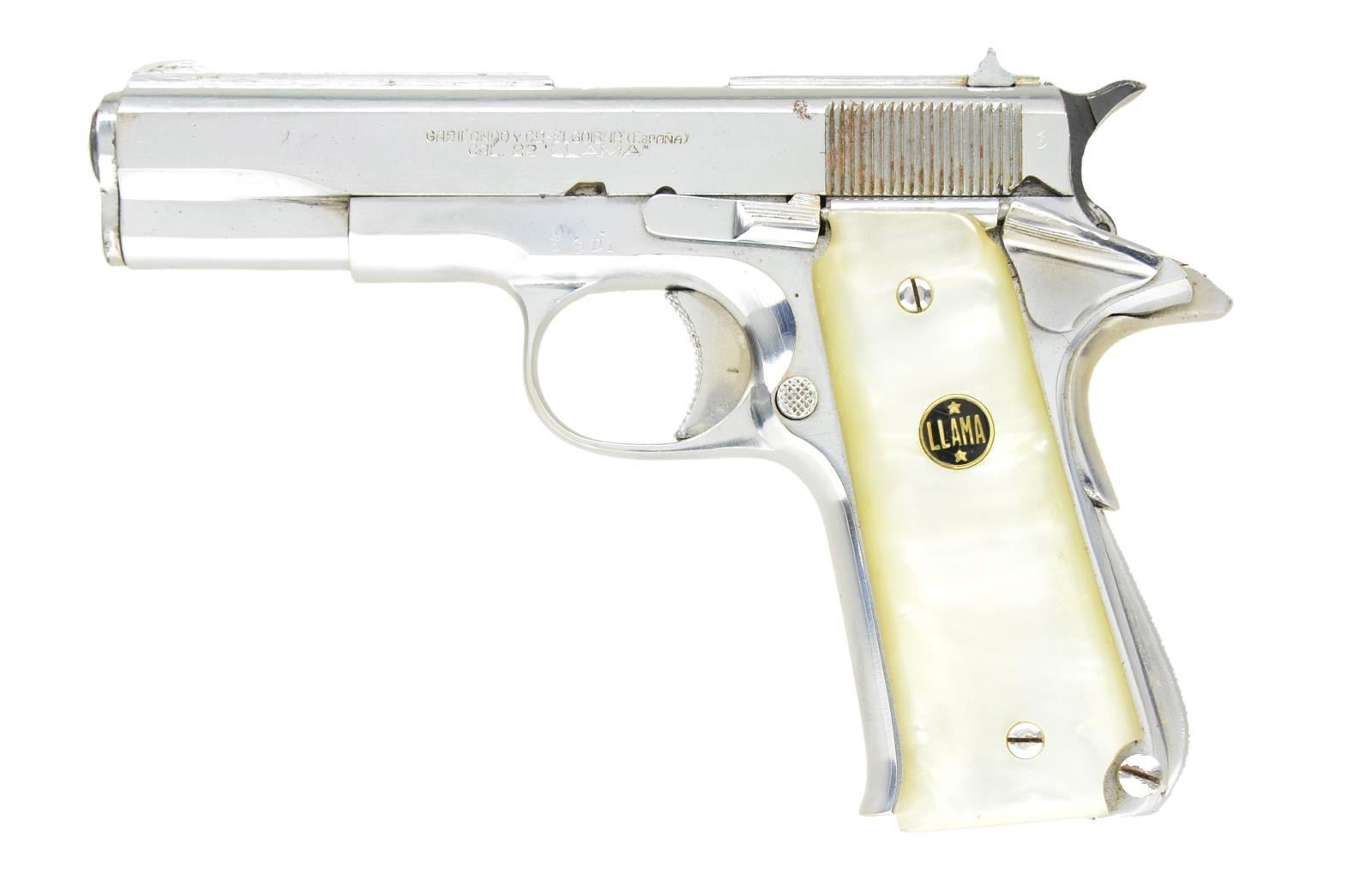 Cal. 22 LR. S# 208062. Manufactured 1958; date code D1. Bbl. 3 1/2". Square notch rear sight. Ramped blade front sight. Chrome finish w/ blued hammer. Imitation pearl grips w/ Llama logo. MAGS: none present. CONDITION: right grip panel shows a chip at front & a few cracks. Grips otherwise show some staining, dings & handling marks. Metal retains 85% chrome finish w/ a few small spots of light pitting, scattered scratches & flaking. Good bore w/ some light pitting near muzzle. (22-4857/MJC). CURIO. $150-250.