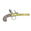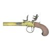 FLINTLOCK PISTOL. Cal. 45. NSN. Smoothbore 3 3/4" screw on bbl. Brass bbl. & boxlock frame. Center hammer has sliding safety. Bag type walnut grip. CONDITION: Brass has pleasing mustard patina w/ dark patina along edges. Missing flint. Hammer & frizzen show pitting. Good grip w/ impressions & repaired gouge. Screws show distortion. Fair pitted bore. (01-23086/MD). ANTIQUE. $300-500.