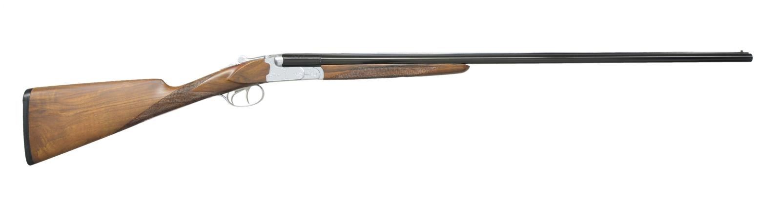 Cal. 410 Ga. S# 01C2866. The 28" monobloc bbls. are marked w/ Huglu Rigby Idaho address on right & "MADE IN TURKEY" on left. Coin finished action w/ nonautomatic safety & dbl. triggers features gas vents & side clips. Action engraved w/ sprays of scroll in line borders. Huglu logo is on trigger plate. Straight grip buttstock of attractive lightly streaked & figured European walnut measures 14 5/8" over thin black sporting clays type pad. Point pattern checkering is at grip. Matching full splinter forend has Deeley type release. MEASUREMENTS: bbls.: bore diameter: right: .390", left: .390". STOCK: DAH: 2 3/16". DAC: 1 9/16". LOP: 14 5/8". CAST: 0. WEIGHT: 5 lbs. 8 oz. CONDITION: very fine w/ only a few minor marks & rubs in all factory finishes. Bright shiny bores. Mechanically good. (21-3997/MGM). MODERN. $500-800.