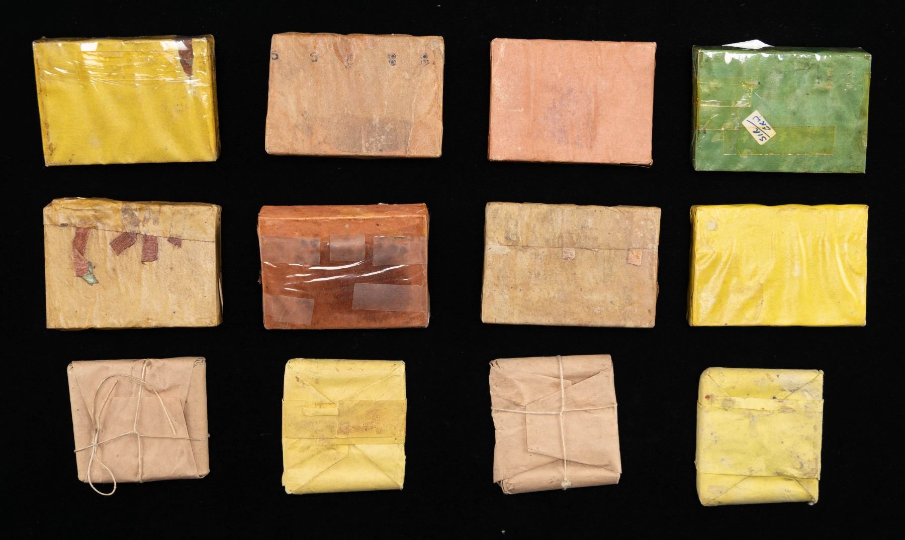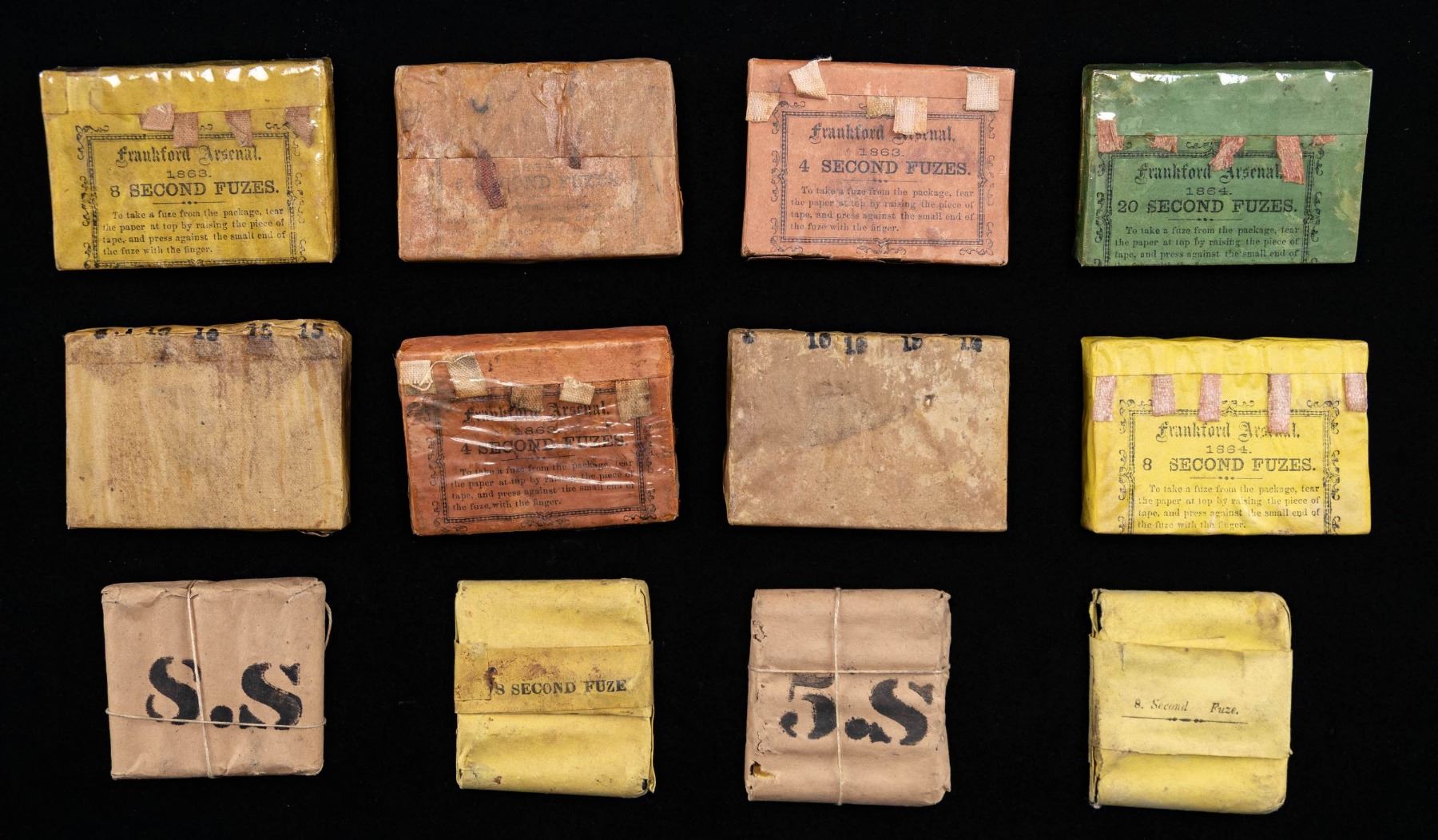 Lot of 12 assorted Civil War era artillery fuses, including: 1) x2 5-count packs of Frankford Arsenal 4 second artillery fuses dated 1863. 2) x2 5-count packs of Frankford Arsenal 8 second artillery fuses (x1 dated 1863, x1 dated 1864). 3) x1 5-count pack of Frankford Arsenal 20 second artillery fuses dated 1864. 4) x3 5-count packs of unknown (presumably Frankford Arsenal, as all timed fuse production was shifted to Frankford Arsenal in 1862) artillery fuses. x1 box retains faint markings indicating 1864 production and a 5 second fuse, with x2 packs exhibiting no identifying markings other than "8", "10", "10", "15", and "15" (presumably fuse times) along the upper edge. 4) x1 5-count pack of 5 second artillery fuses. Fuses are in their original brown paper and twine packaging, with packaging marked "5.S" on front face. 5) x2 5-count packs of 8 second artillery fuses. Fuses are housed within their original yellow paper packaging, simply marked "8 Second Fuze" in different fonts on their front faces. 6) x1 5-count pack of 8 second artillery fuses. Fuses are housed within their original brown paper and twine packaging marked "8.S" on the front face. CONDITION: packs show varying degrees of wear and age related discoloration, with paper packaged packs exhibiting some tears. PROVENANCE: Norman Olliff Estate. (02-25677/MLW). NON-GUN. $100-150.