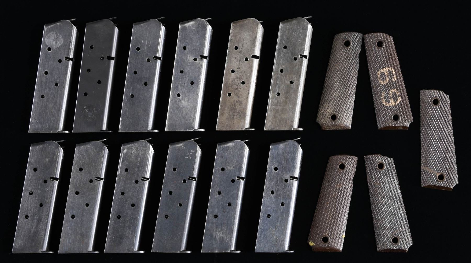 SETS OF GRIPS. Lot of 12 assorted U.S. M1911 mags. and 2 sets of grips, including: 1) 4 blued M1911 mags. mfg. by M.S. Little Co. (marked "L" on top of floorplate toe). 2) 4 blued M1911 mags. mfg. by Risdon Mfg. Co. (all marked with an "R" on the top of the floorplate toe, 2 marked "C-R' on bottom of floorplate toe). 3) 2 blued M1911 mags. mfg. by Scovill Mfg. Co. (mags. are marked with an "S" on the top of the floorplate toe, with "C-S" marked on the bottom of the floorplate toe. 4) 1 unmarked M1911 mag. with pinned floorplate. 5) 1 blued contemporary M1911 mag. (faintly marked "1911 Cal. 45 ACP" on the left side of the body, with an "S" marked on the top of the floorplate toe). 6) 2 sets of checkered brown synthetic grips, and 1 checkered brown synthetic left grip panel. Interior of grip sets are marked with a "K" within a star. 1 grip exhibits a painted "69" in white paint on the exterior of the panel. CONDITION: mags. exhibit varying degrees of wear, thinning, and scattered superficial handling marks, with most remaining very good overall. 2 mags. retain a mottled gray patina. Grips show varying degrees of smoothing and scattered marks from handling and storage, but otherwise remain sturdy and serviceable. (02-24271-8/MLW). $400-800.