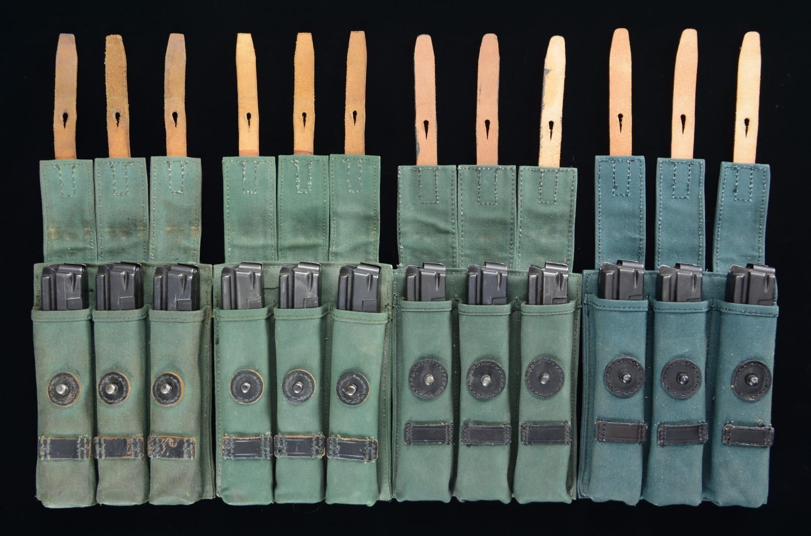 3-CELL POUCHES. Lot consists of 12 desirable Heckler & Koch produced MP5 straight mags. 1st pouch with 3 "SD" marked mags. dated "4/79" and "11/84", 2nd pouch with "8/67", "11/67". and "4/68" marked mags., 3rd pouch with 3 "IG" (86) dated mags., and last pouch with "2/74", "IH" (87), and "IJ" (89) dated mags. 3 pouches are comprised of green canvas, with 1 comprised of gray canvas, all with black leather fittings. CONDITION: mags. are very good to excellent overall, exhibiting some superficial marks from handling and storage, with a couple showing some light to mild wear from use. Pouches exhibit some wear, but otherwise remain sturdy and serviceable. A desirable assortment of Heckler & Koch MP5 straight mags. PROVENANCE: Lifelong Collection of Terrence McCarty. (02-21799-3/MLW). $1,200-1,800.