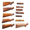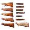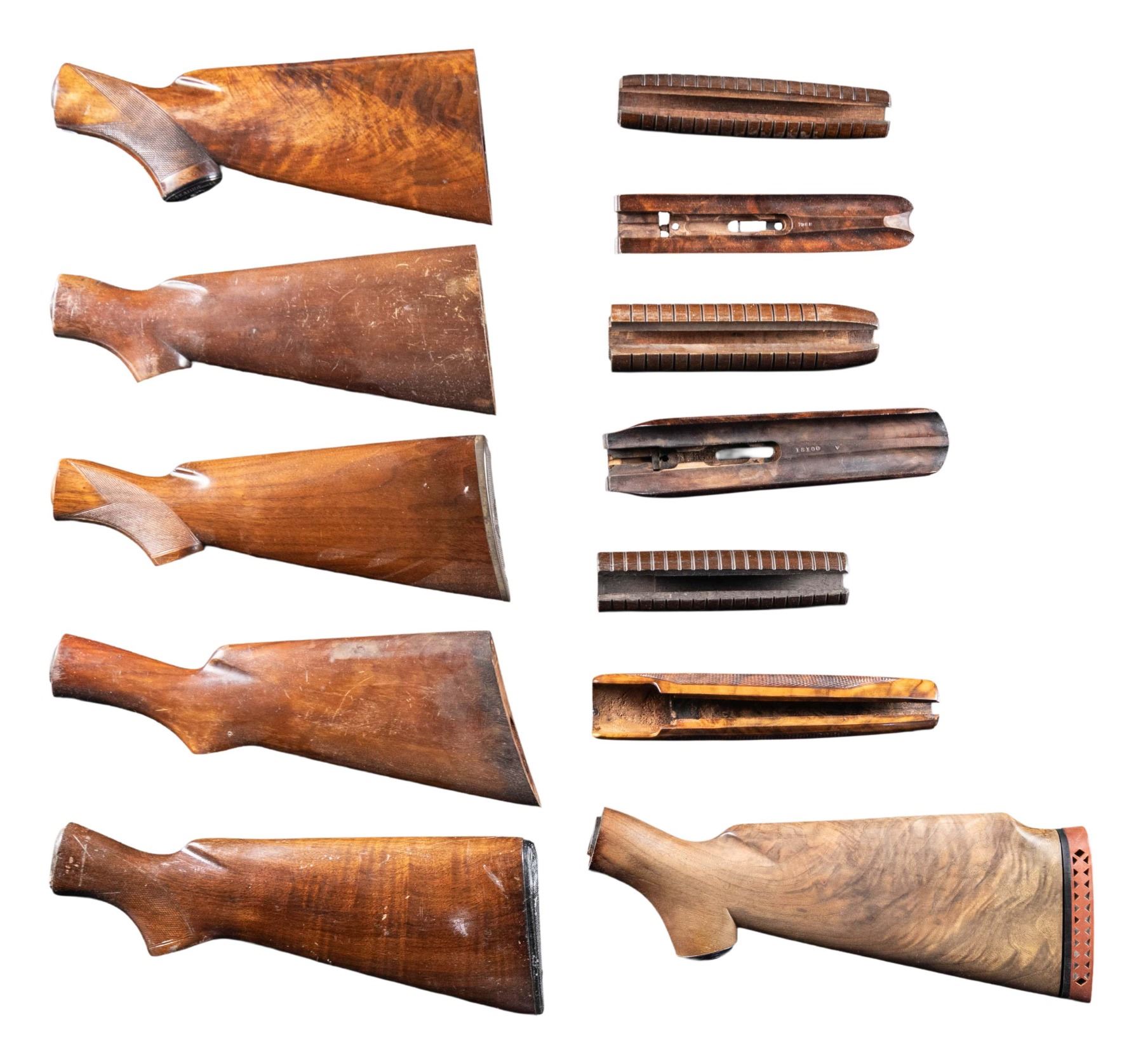 No.1: Winchester Model 42 Pre-WWII Skeet stock with uncapped pistol grip. LOP: shortened to approximately 12 1/4" with refit original buttplate. Stock has good original finish and checkering showing scattered marks. / No.2: Winchester Model 42 Field stock shortened to LOP of approximately 12". No buttplate is present. Worn original finish showing numerous scratches and marks. / No.3: Winchester 1912 Style buttstock, full length without buttplate. Original finish shows wear and handling marks with water staining around the butt. / No.4: Winchester Model 12 Skeet stock with hard rubber grip cap and standard skeet checkering. Stock is shortened to approximately 12 3/4" LOP with no buttplate or pad present. Original finish shows wear with scratches and marks. / No.5: Aftermarket Winchester Model 12 Monte Carlo Trap stock with steel grip cap and red ventilated Winchester pad. Stock has no checkering. Right side of stock shows an area of spotted finish, remainder is steel wooled to open wood with dull appearance. / No.6: Winchester Model 50 stock. LOP is approximately 13 5/8" with a slightly undersize buttplate. Stock has added finish over heavy checkering wear with scratches and marks. / No.7: Winchester Model 42 small round grooved forearm retaining approximately 50% original finish. Balance has a dark worn appearance. / No.8: Winchester Model 42 Flat Bottom grooved forearm with 80% lightly worn finish showing some handling marks. / No.9: Winchester Model 42 Custom Aftermarket Beavertail forearm of fancy walnut with hand checkering and gloss finish. / No.10: Winchester Model 12 small round grooved forearm with worn and peeling finish. Left side at rear has 1 1/4" crack. / No.11: Winchester Model 21, 16 gauge splinter forearm. S# 7088. Includes the forearm latch plate. Lightly worn finish with very good checkering. / No.12: Winchester Model 21 20 gauge beavertail forearm with kidney checkering. S# 18100. Moderately worn finish and checkering showing handling marks. Left side shows a small crack with a 3/4" chip at the tip. PROVENANCE: Estate of Lloyd Robinson. (02-26051-1/DS). NON-GUN. $350-700.