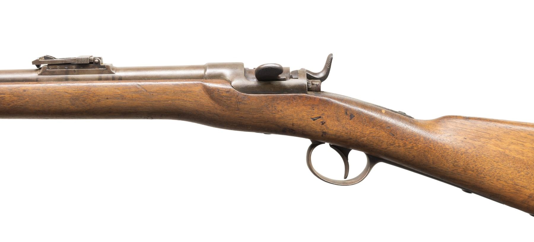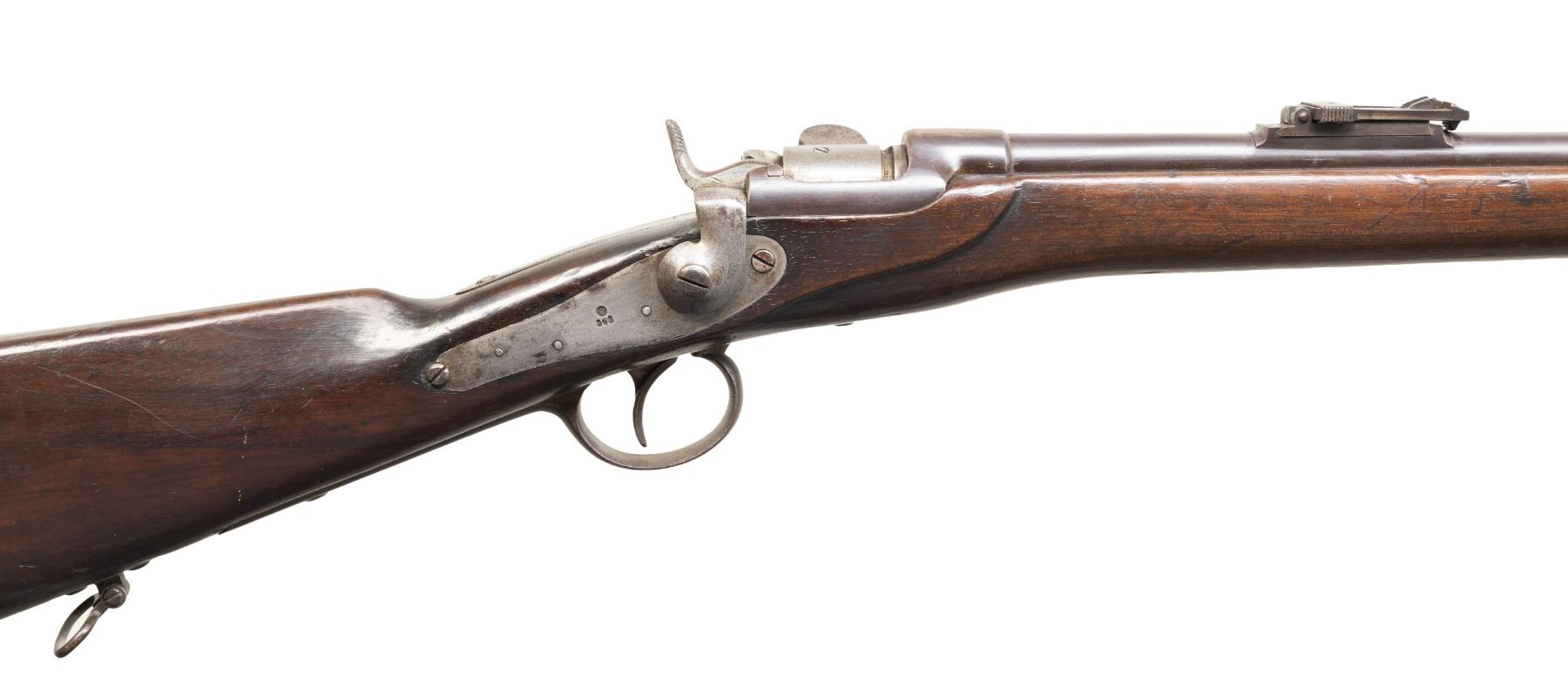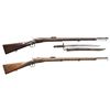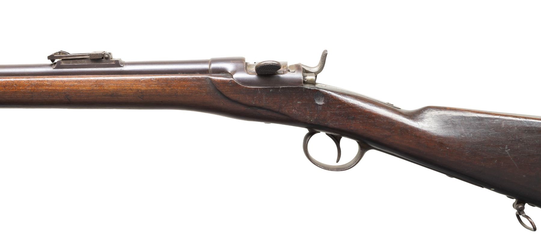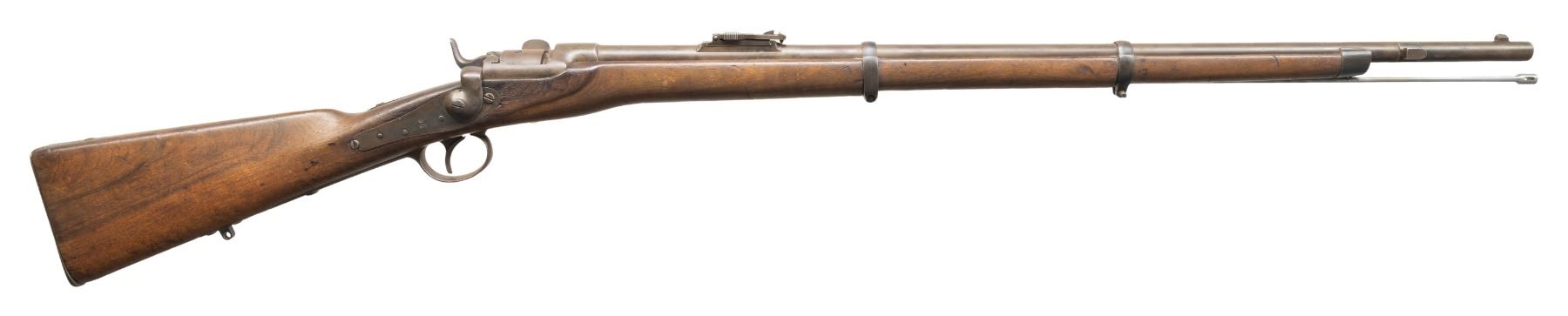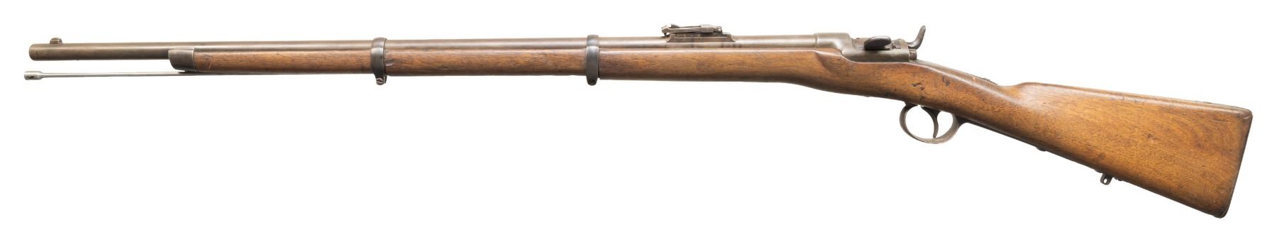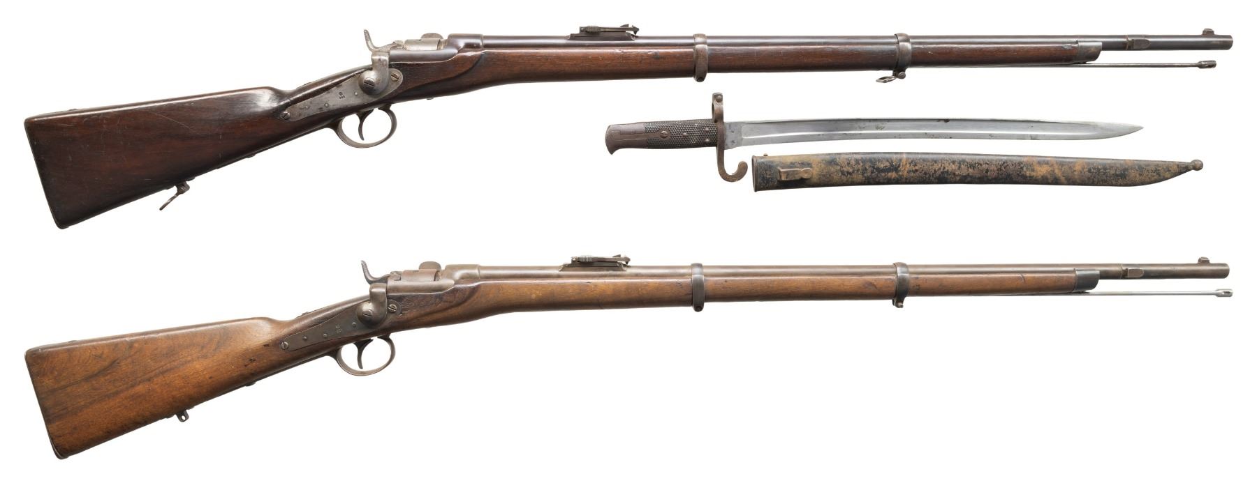 2) Werndl 1867 Rifle. NSN. Bbl. 33". Blade front sight. Ladder rear sight graduated to 1400 Schritt. Lock has 1871 date. Top of action marked "WERNDL". Tang of buttplate has " 57. LSTB/771/" unit marking. Hardwood stock set with bottom mounted sling hardware. Ramrod present that appears to be a later replacement. CONDITION: stock appears to have an old light sanding with some small cracks around cock, scattered dings, light chips & handling marks. Metal is a dull gray color possibly from faded old touch up with a few spots of light pitting, scattered oxidation, traces of bluing & handling marks. Action functions properly when hand cycled. Poor bore with several large patches of oxidation & pitting. PROVENANCE: From the PMRB Collection. (01-28394/MJC). BOTH ANTIQUE. $800-1,200 for pair.
