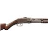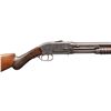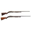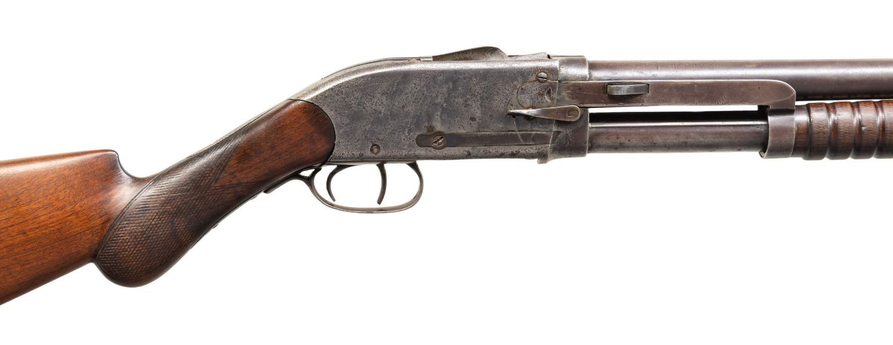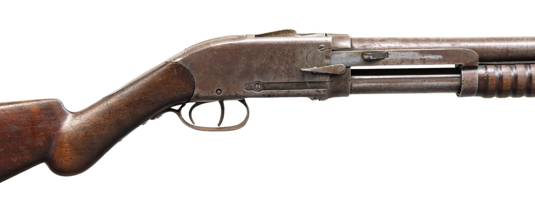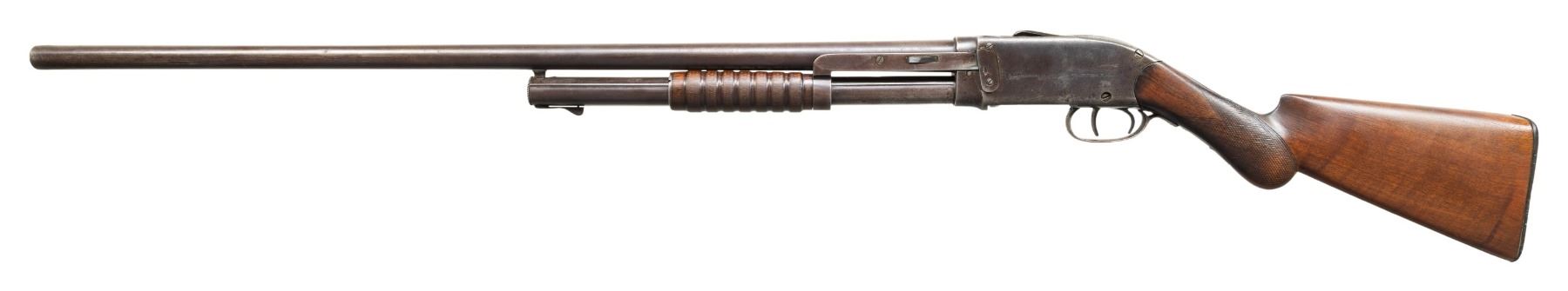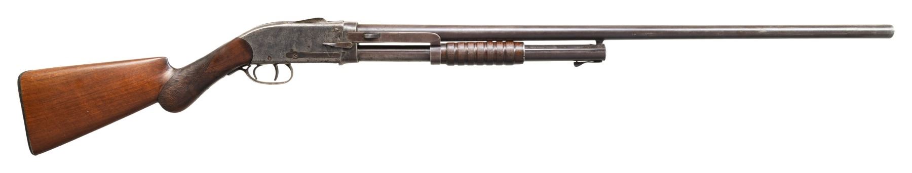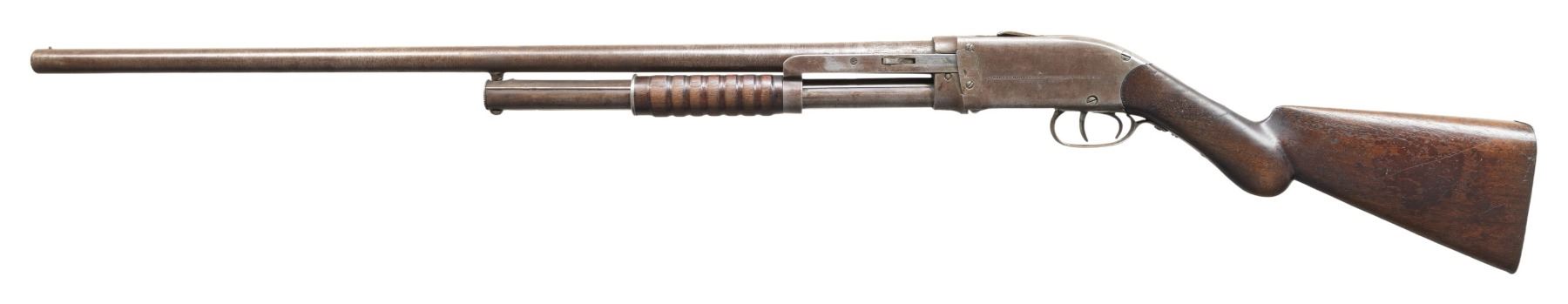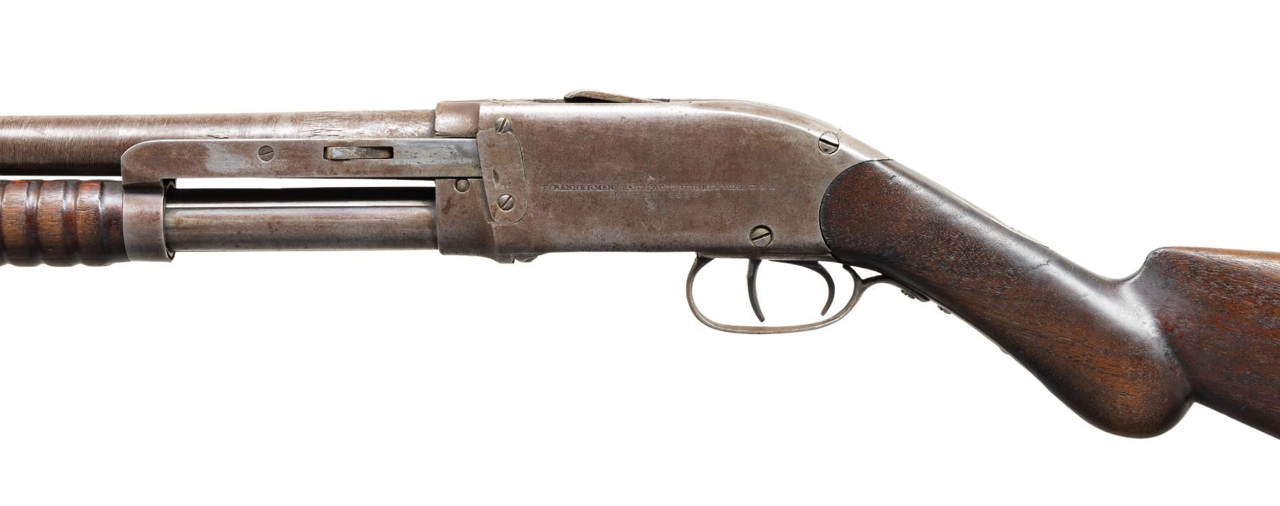 SHOTGUNS. 1) Cal. 12 GA. S# 18711. Bbl. 30". Model 1900 pump action shotgun mfg. Banner. Top of the rnd. damascus bbl. is marked with a mostly legible "SPENCER RPTG.SHOT GUN PAT.APL.1882". Left side of the receiver is marked "F. BANNERMAN MANUFACTURER NEW YORK USA/ MODEL 1900". Grooved wood pump and plain wood rnd. knob buttstock with checkered steel buttplate. Brass bead front sight. CONDITION: metal components have faded to a gray patina, exhibiting scattered handling marks, as well as scattered spots and patches of light to mild surface oxidation and pitting. Rear section of bbl. exhibits marring at and around the patent marking. Dark bore, exhibiting consistent moderate pitting throughout. Proper manual mechanics, although the action occasionally gets stuck. Wood furniture shows scattered marks and impressions from handling and storage, with flaking to added varnish. (25-5906/MLW). 2) Cal. 12 GA. S# 18777. Bbl. 32 1/8". Model 1900 pump action shotgun mfg. by Bannerman. Top of the rnd. damascus bbl. is marked "SPENCER RPTG.SHOT GUN PAT.APL.1882". Left side of the receiver is marked "F. BANNERMAN MANUFACTURER NEW YORK U.S.A./ MODEL 1900". Sanded and refinished checkered and grooved wood pump with checkered rnd. knob buttstock and black hard rubber buttplate. Bead front sight is absent. CONDITION: metal components have faded to a gray patina, exhibiting consistent light to mild pitting overall. Action does not function properly, with the breechblock having to be manually pushed down. Wood furniture shows some scattered marks and impressions from handling and storage, but otherwise remains sound. PROVENANCE: From the PMRB Collection. (25-5907/MLW). BOTH CURIO. $400-600.