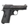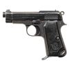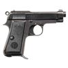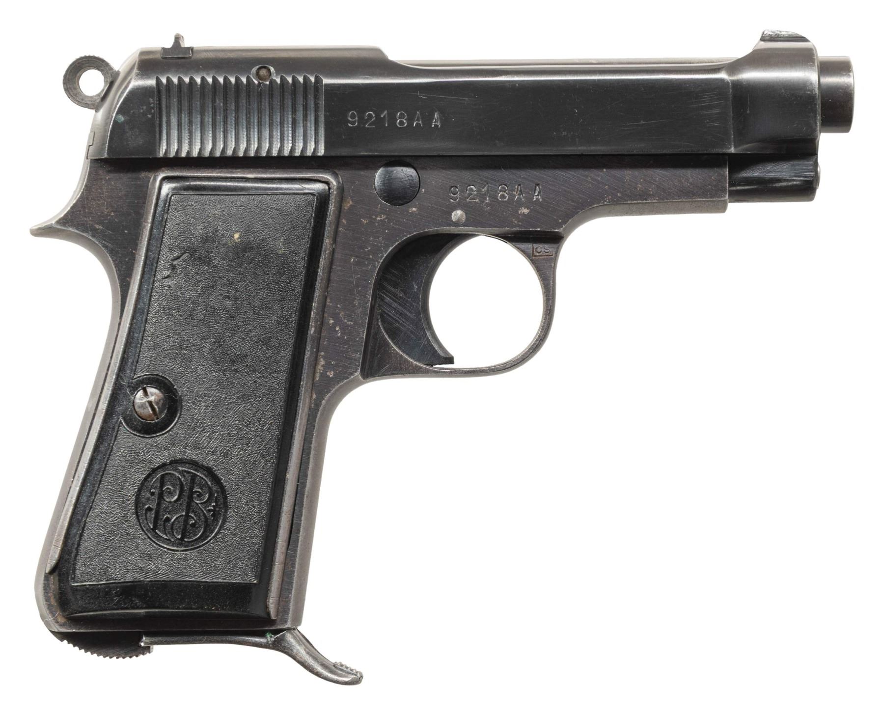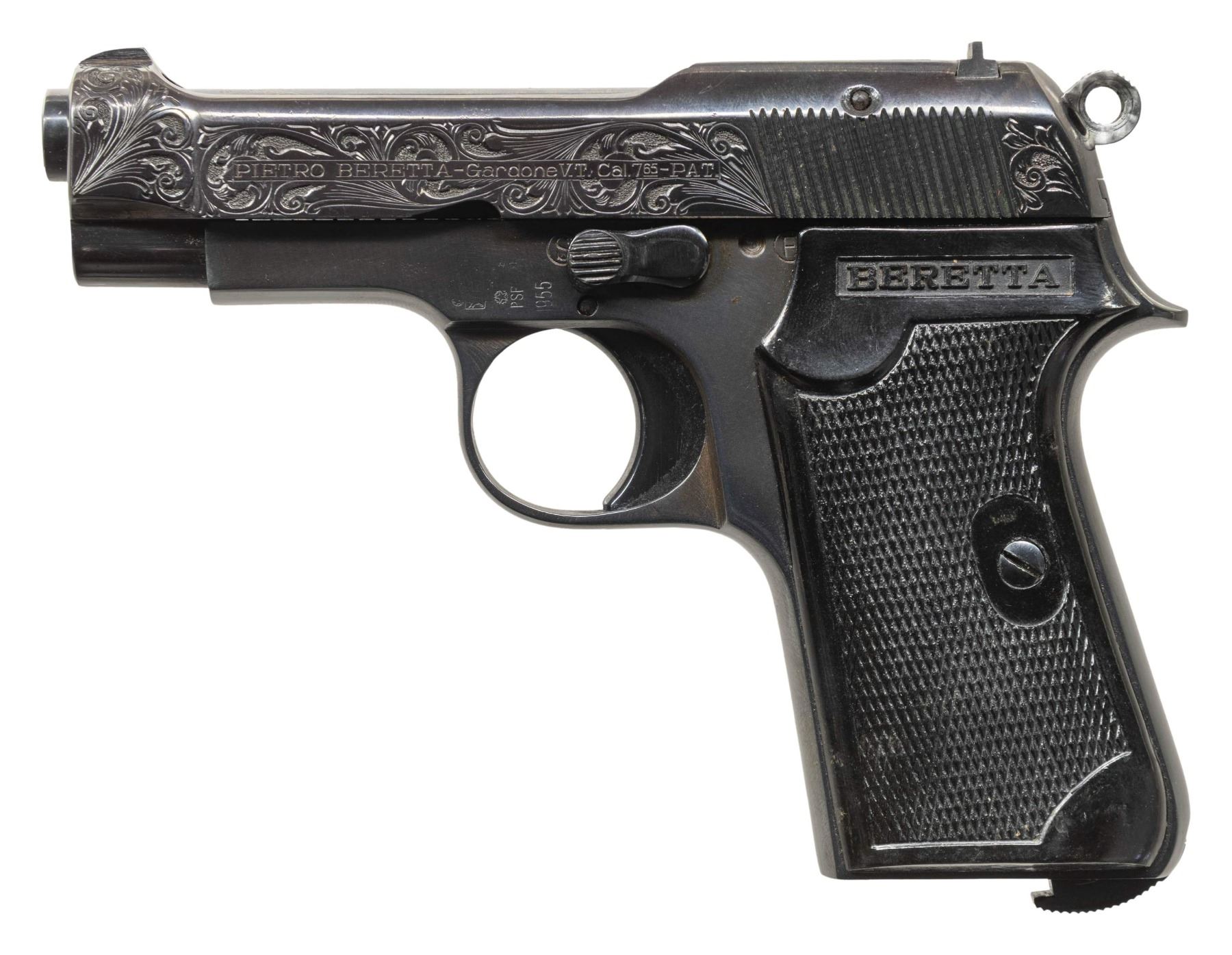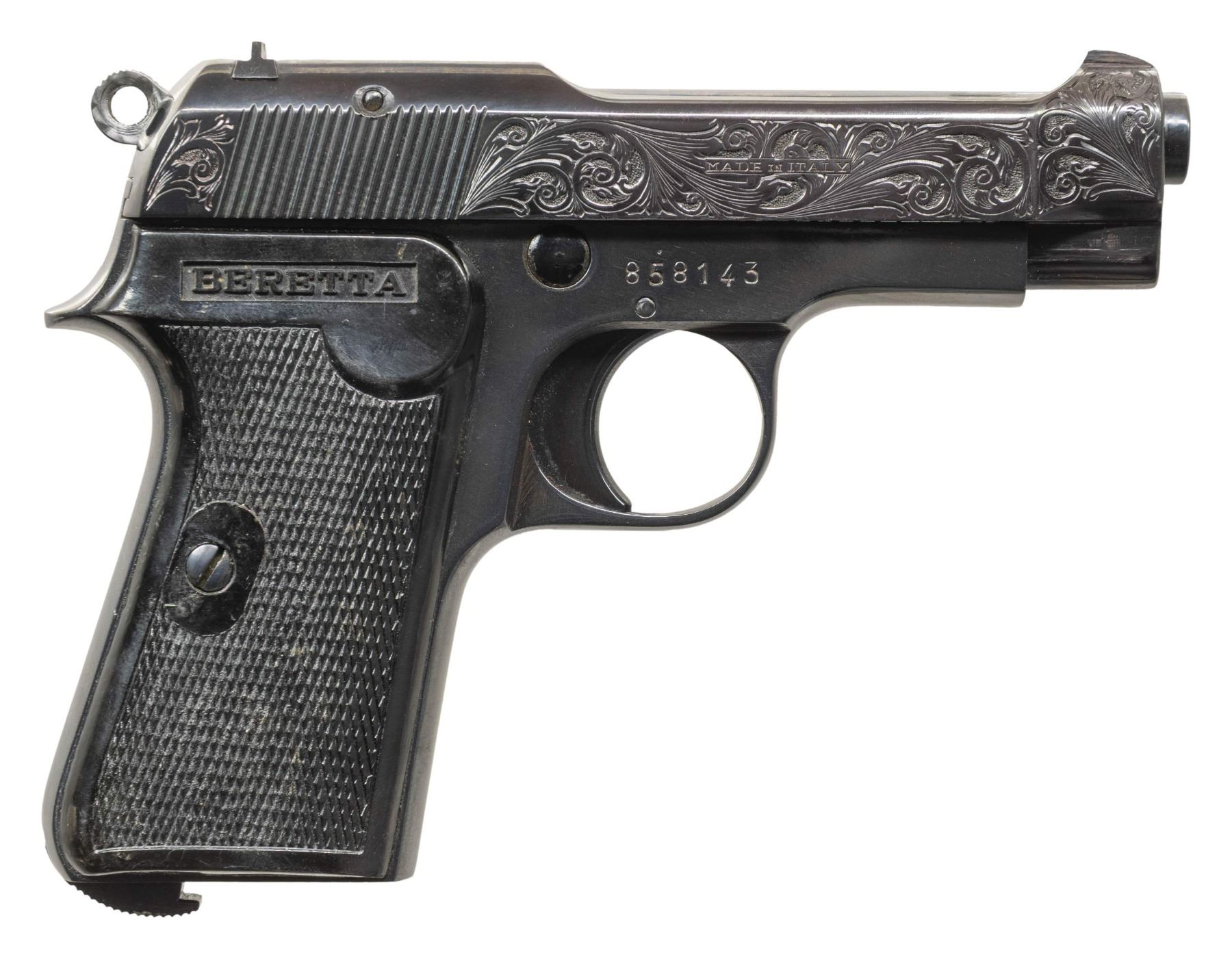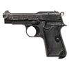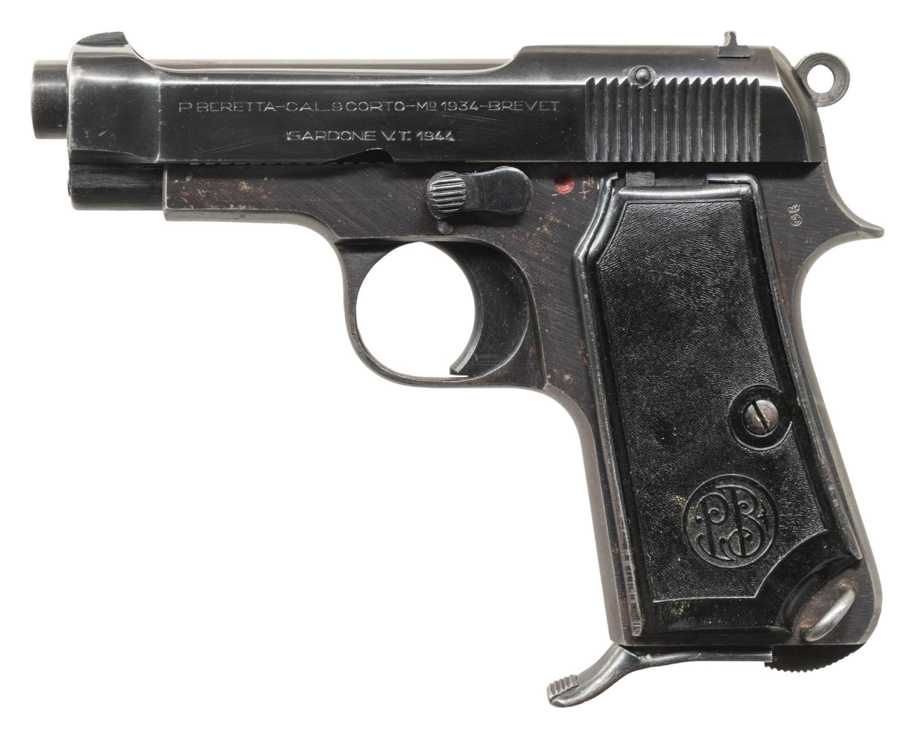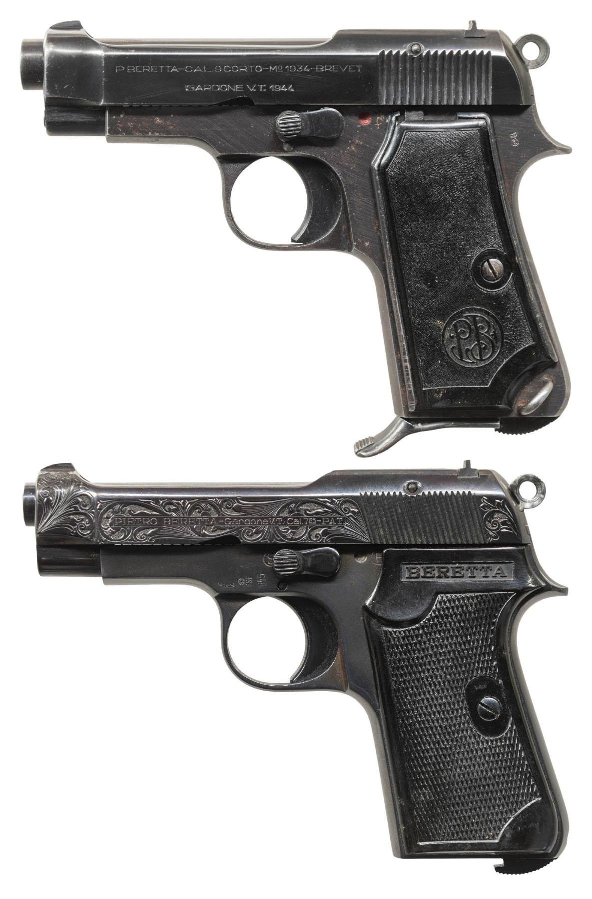 PISTOLS. 1) GERMAN OCCUPATION BERETTA MODEL 1934 SEMI-AUTOMATIC PISTOL. Cal. 9mm Corto (.380 ACP). S# 9218AA. Bbl. 3 3/8". 1 of approx. 19,000 Model 1934 semi-automatic pistols mfg. by Beretta while under German occupation between 1943-1945. This example, mfg. in 1944 exhibits standard factory markings denoting the model and cal. designations above "GARDONE V.T. 1944" on the left side of the slide. Left side of frame tang is stamped with what appears to be a crowned encircled Rampant Lion proof, with a boxed "CS" proof marked on the right side of the forward trigger guard web. Metal components exhibit a blue finish overall. Frame is mounted with 2-piece blued steel and textured black synthetic encircled "PB" logo grips. Standard integral blade front sight and dovetailed U-notch rear sight. All serialized parts are matching and include the frame, slide, and bbl. MAGS: x1 blued steel 7-rd. with blued steel grip extension. CONDITION: metal components retain the majority of their original factory blue finish, exhibiting some light to mild edge wear, with some superficial handling marks and spots of light surface oxidation present overall. Grip straps exhibit mild wear and thinning that is fading to gray patina, with scattered spots of light surface oxidation. Bright bore, exhibiting some light surface oxidation and pitting, while retaining well defined rifling throughout. Proper manual mechanics. Grips show some light wear and a few superficial marks from handling and storage, but otherwise remain sound. (25-5429/MLW). 2) CUSTOM ENGRAVED BERETTA MODEL 1935 SEMI-AUTOMATIC PISTOL. Cal. 7.65mm. S# 858143. Bbl. 3 5/16". Model 1935 semi-automatic pistol mfg. by Beretta for commercial sales in 1955. Left side of the slide is marked with Beretta's mfg. information and the cal. designation, with "MADE IN ITALY" marked on the right. Left side of frame exhibits Italian proofs, followed by "1955". Sides of slide feature professionally executed foliate scroll engraving on small stippled backgrounds. Metal components exhibit a reapplied blue finish overall, with the sides of the hammer being polished and jeweled in-the-white. Frame is mounted with 2-piece "BERETTA" checkered black synthetic grips. Standard integral blade front sight and dovetailed U-notch rear sight. All serialized parts are matching and include the frame, slide, and bbl. Mag. is absent. CONDITION: metal components retain the virtually all of their reapplied blue finish overall. Near mirror bore, exhibiting some spots of light surface oxidation and pitting, while retaining well defined rifling throughout. Proper manual mechanics. Grips show some superficial marks from handling and storage, but otherwise remain very good overall. (25-5431/MLW). BOTH CURIO. $700-1,100.