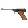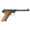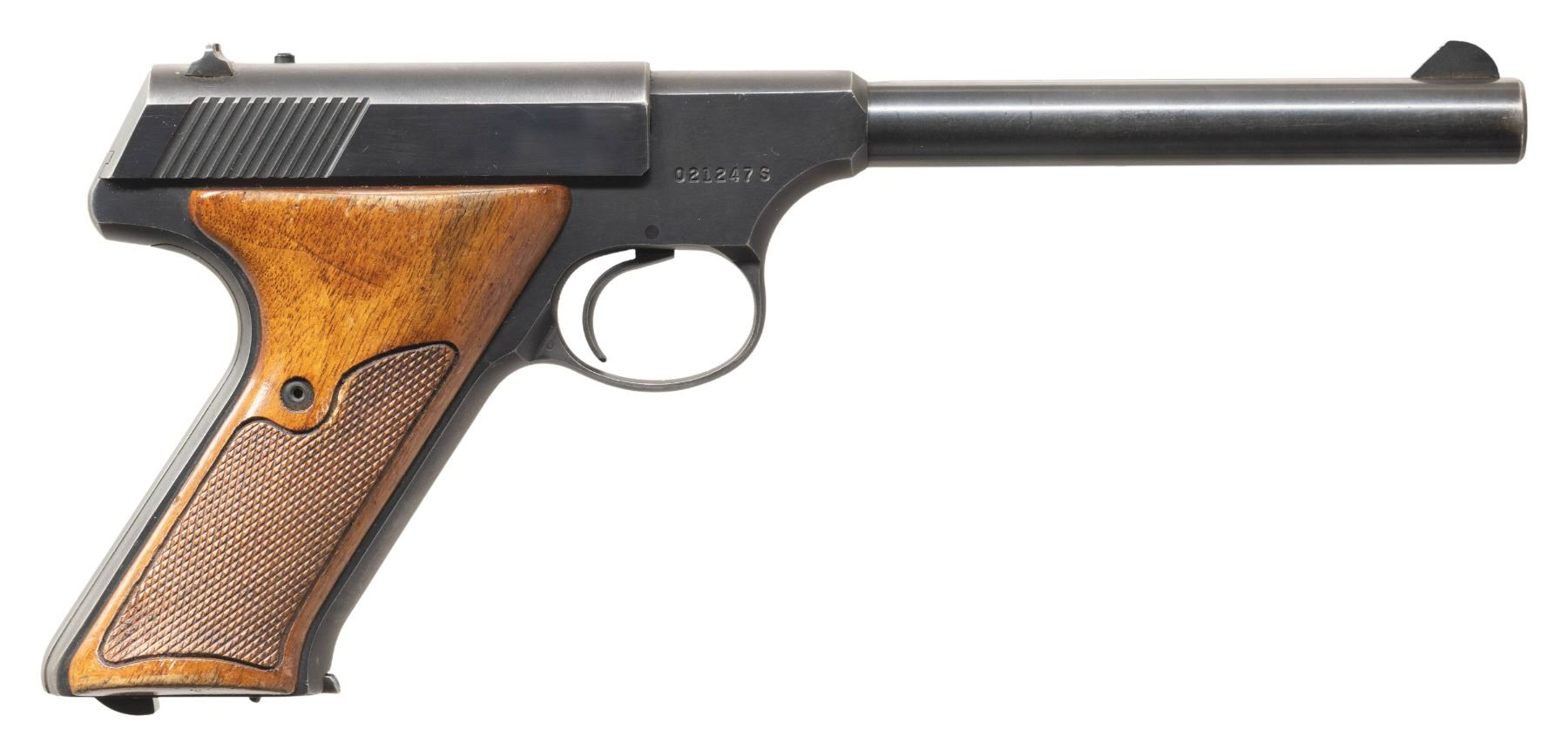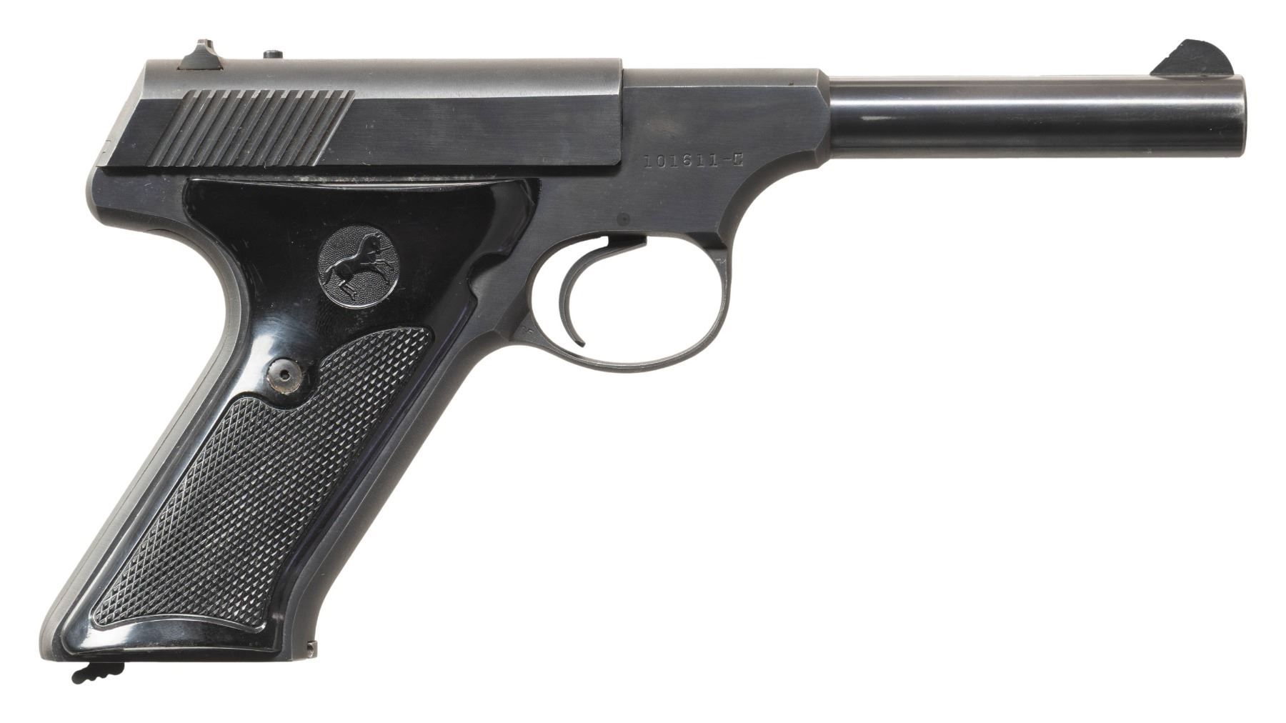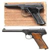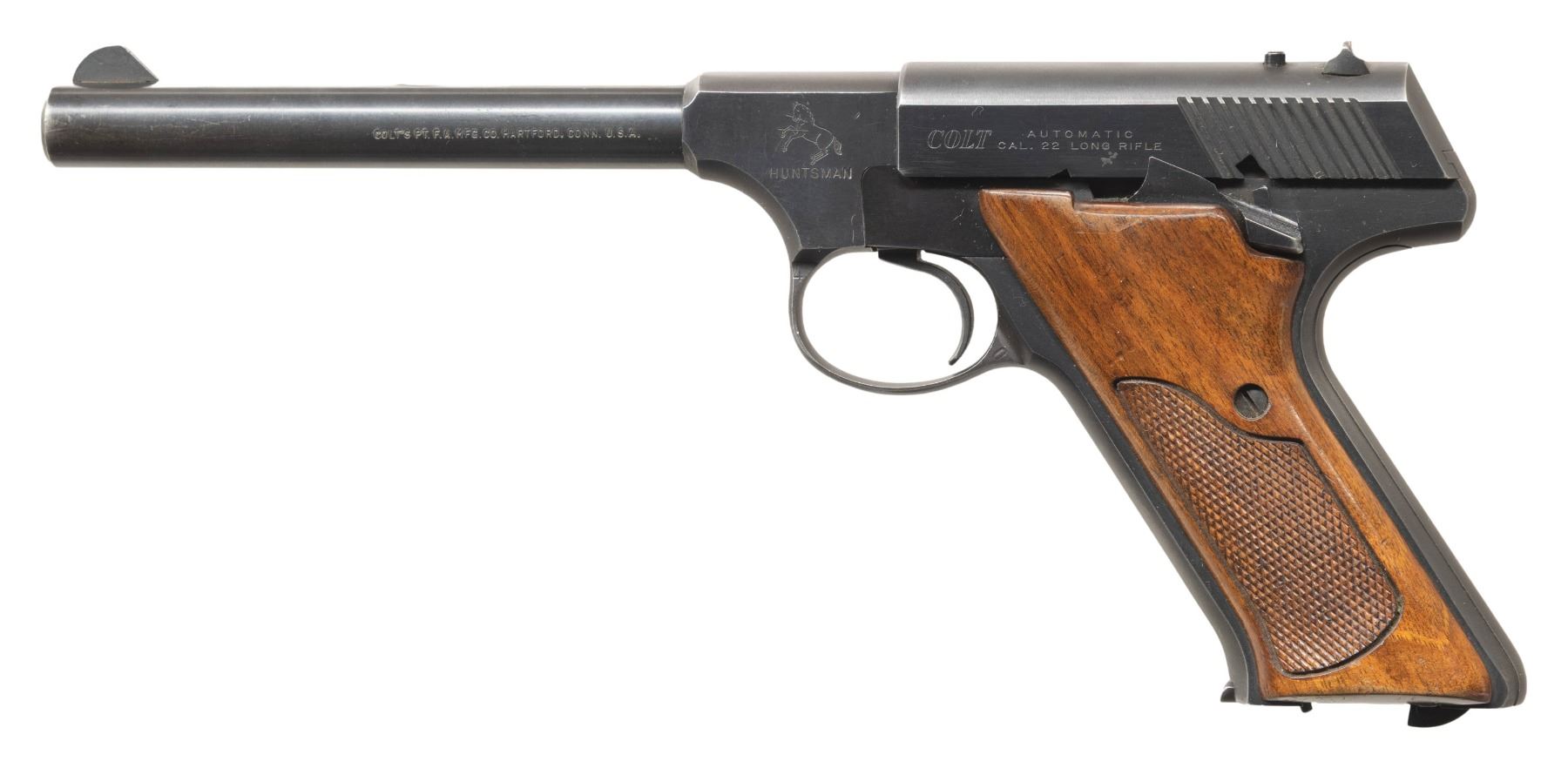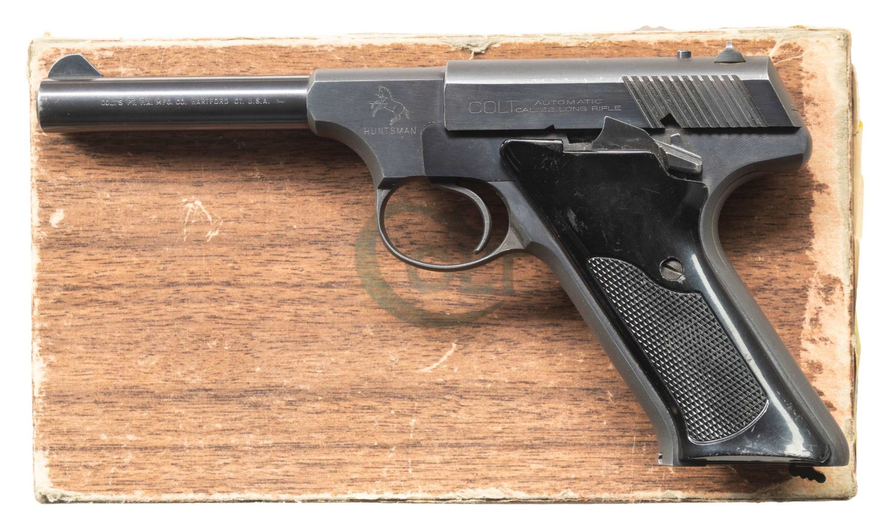 1) Cal. 22 LR. S# 101611-C. Bbl. 4 9/16". Huntsman semi-automatic pistol mfg. by Colt in 1956. Left side of the bbl. is marked with Colt's single line address, with the Rampant Colt logo above "HUNTSMAN" marked on the left side of the frame. Slide is marked "COLT", followed by "AUTOMATIC/ CAL. .22 LONG RIFLE". Metal components exhibit a blue finish overall, with the top, rear, and underside of the frame and slide exhibiting a matte blue finish. Frame is mounted with 2-piece checkered black synthetic grips, the right panel embossed with the Rampant Colt logo. Standard fixed blade front sight and dovetailed square notch rear sight. MAGS: x1 blued steel 10-rd. UNATTACHED ACCESSORIES: Colt factory wood grain cardboard box (unnumbered), containing unsigned warranty card and a Huntsman instruction pamphlet. CONDITION: metal components retain the vast majority of their original factory blue finish, exhibiting some spots of light to mild edge wear, some scattered spots of light surface oxidation and superficial handling marks, as well as some light thinning on the grip straps. Mirror bore, exhibiting some scattered spots of light pitting, while retaining well defined rifling throughout. Proper manual mechanics. Grips show some superficial handling marks, but otherwise remain sound. Box shows moderate wear overall, but otherwise remains intact. (25-5391/MLW). 2) Cal. 22 LR. S# 021247S. Bbl. 6 1/8". Huntsman semi-automatic pistol mfg. by Colt circa. 1968-1970. Left side of the bbl. is marked with Colts single line address, with the Rampant Colt logo above "HUNTSMAN" marked on the left side of the frame. Left side of the slide is marked "COLT", followed by "AUTOMATIC/ CAL. 22 LONG RIFLE". Metal components exhibit a blue finish overall, with the top, rear (on slide), and underside of the frame exhibiting a matte blue finish. Frame is mounted with 2-piece checkered wood grips. Standard fixed blade front sight and adj. square notch rear sight. MAGS: x1 blued steel 10-rd. CONDITION: metal components retain the majority of their original factory blue finish, showing light to mild edge wear, some light thinning, as well as some superficial handling marks overall. Mirror bore, retaining well defined rifling throughout. Proper manual mechanics. Grips show scattered marks and minor impressions from handling and storage, but otherwise remain sound. (25-5439/MLW). BOTH CURIO. $800-1,200.
