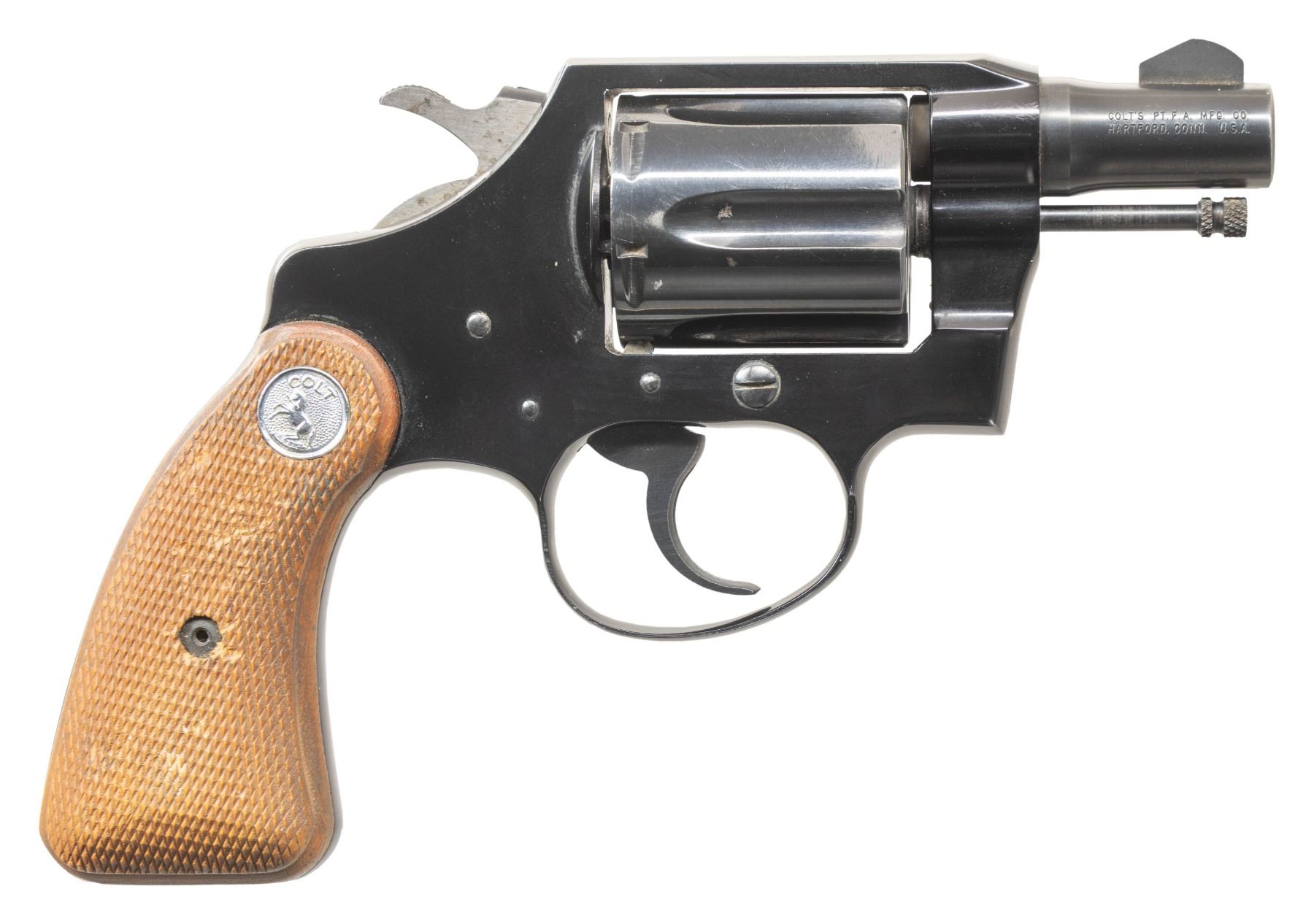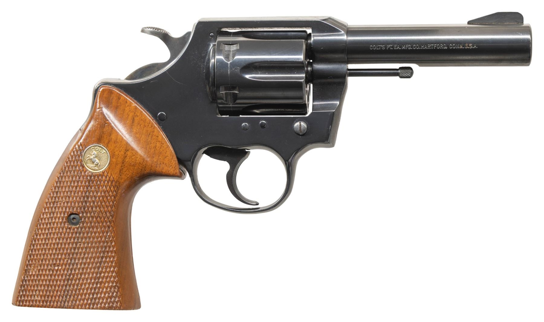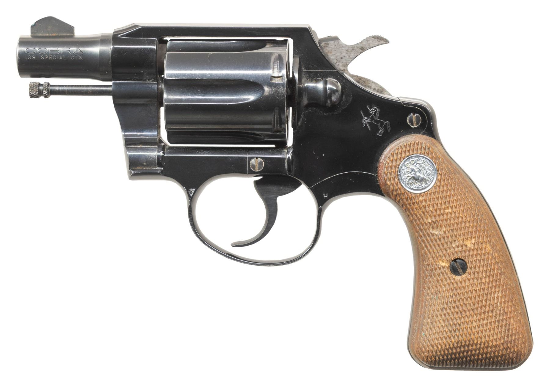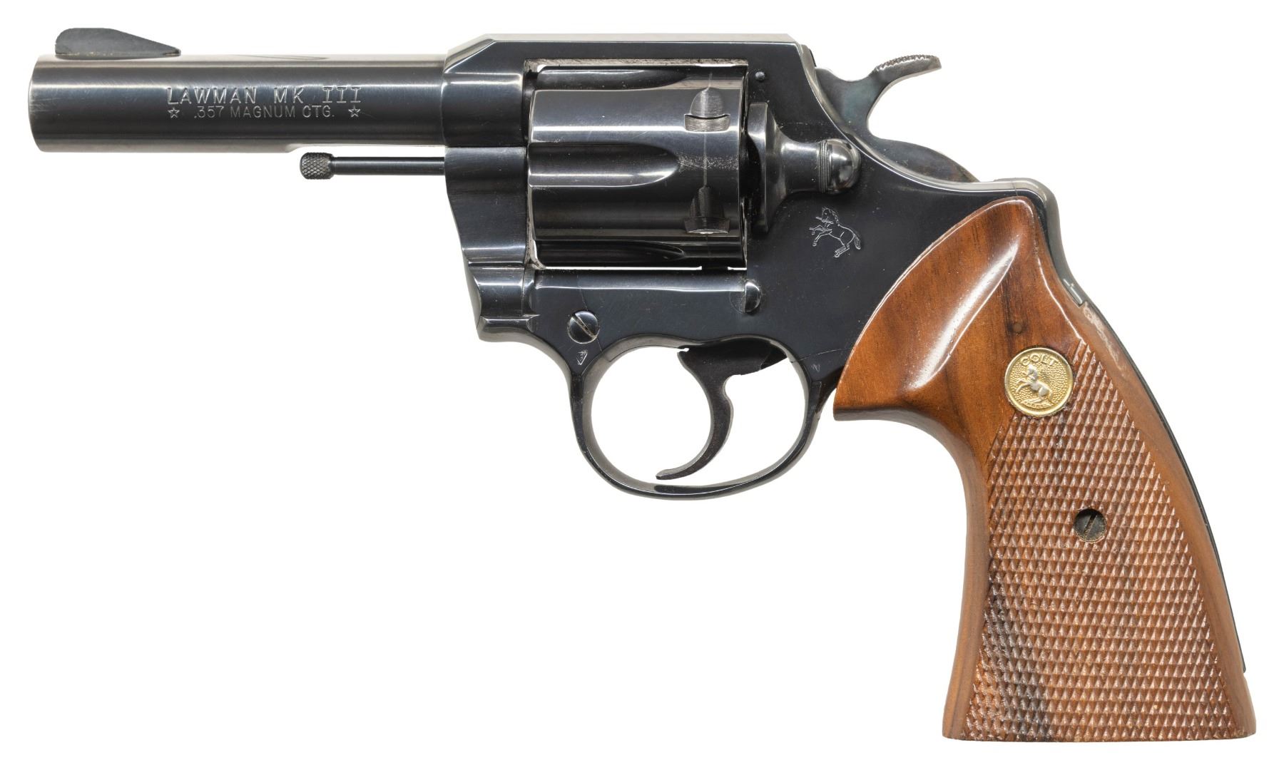 REVOLVERS. 1) COLT LAWMAN MK III DOUBLE ACTION REVOLVER. Cal. 357 Mag. S# 48439L. Bbl. 4". Lawman Mk III double action revolver mfg. by Colt. Left side of the bbl. is marked with the model and cal. designations, with Colt's single line address marked on the right. Left side of the frame is marked with the Rampant Colt logo. Metal components exhibit a blue finish overall, save for on the hammer, which exhibits a case colored finish. Frame is mounted with 2-piece Colt gold medallion checkered wood grips. Standard fixed blade front sight and square notched frame rear sight. CONDITION: metal components retain the vast majority of their original factory blue finish, exhibiting some light edge wear overall. Mirror bore, exhibiting well defined rifling throughout. Proper manual mechanics. Grips show some superficial marks from handling and storage, but otherwise remain sound. (25-5417/MLW). MODERN. 2) COLT COBRA DOUBLE ACTION REVOLVER. Cal. 38 Spl. S# 166824-LW. Bbl. 2". Cobra double action revolver mfg. by Colt in 1965. Left side of the bbl. is marked with the model and cal. designations, with Colt's 2-line address marked on the right. Left side of the frame is marked with the Rampant Colt logo. Alloy frame exhibits a black anodized finish, with steel parts exhibiting a blue finish. Sides of hammer are polished in-the-white. Frame is mounted with 2-piece Colt silver medallion checkered wood grips. Standard fixed blade front sight and square notched frame rear sight. CONDITION: metal components retain the majority of their original factory finishes, exhibiting some light edge wear and some superficial handling marks overall. Sides of hammer exhibit scattered spots of light oxidation and age related discoloration. Bright bore, exhibiting some spots of carbon and light oxidation, while retaining strong rifling throughout. Proper manual mechanics. Grips show some scattered marks and impressions, but otherwise remain sound. (25-5455/MLW). CURIO. $700-1,100.