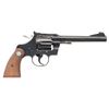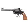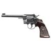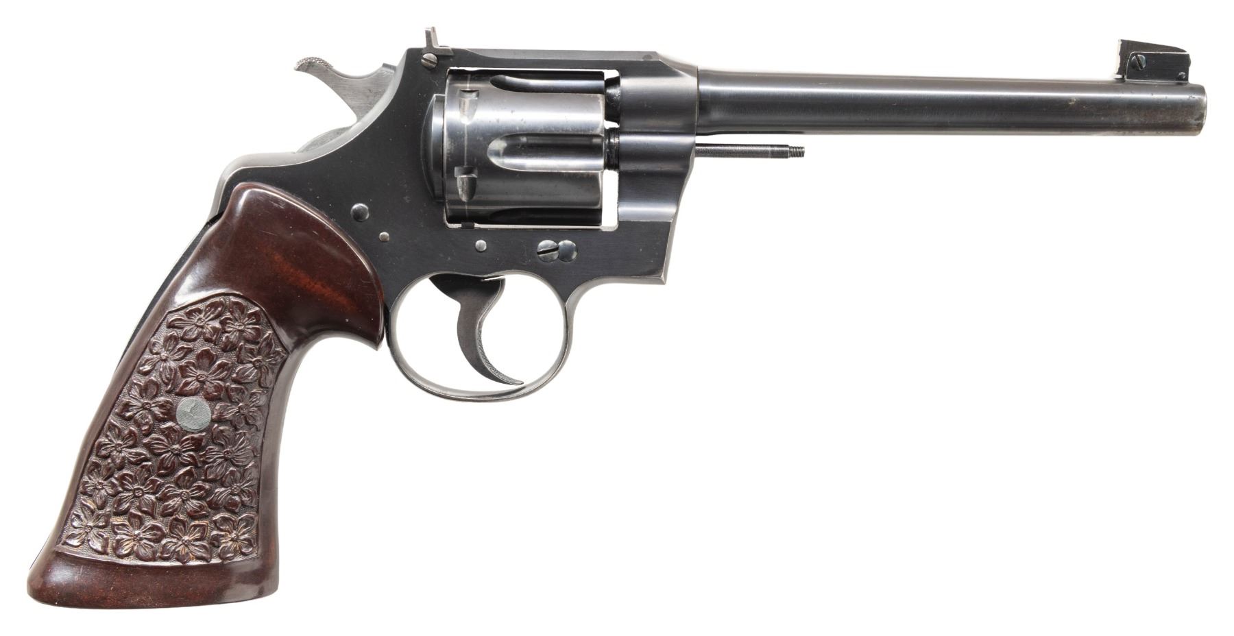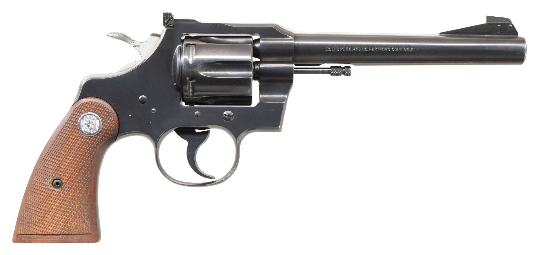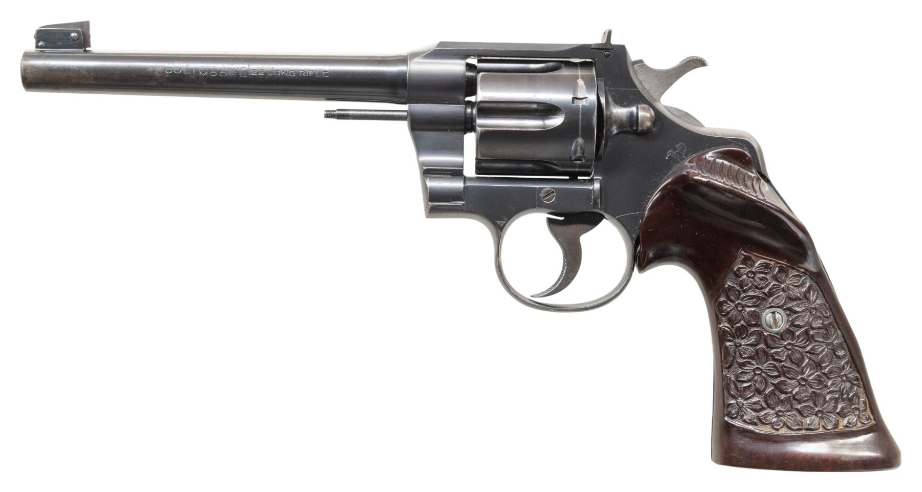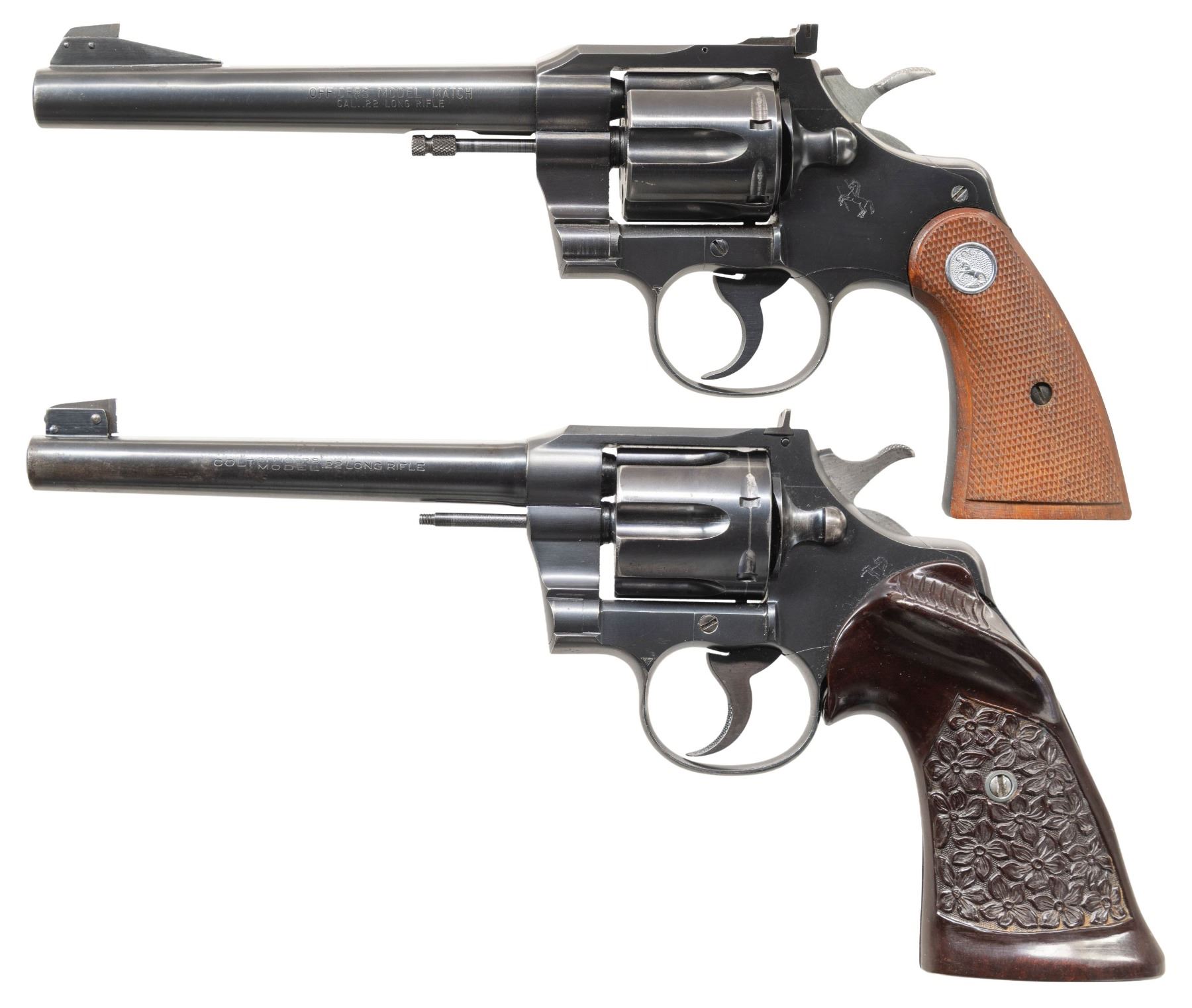 REVOLVERS. 1) COLT OFFICERS MODEL MATCH .22 LR DOUBLE ACTION REVOLVER. Cal. 22 LR. S# 77393. Bbl. 6". Officers Model Match double action revolver mfg. by Colt in 1959. Left side of the bbl. is marked "OFFICERS MODEL MATCH/ CAL. .22 LONG RIFLE", with Colt's single line address marked on the right. Left side of the frame is marked with the Rampant Colt logo. Metal components exhibit a blue finish overall, save for on the sides of the hammer, which are polished in-the-white. Frame is mounted with 2-piece Colt silver medallion checkered wood grips. Ramped and pinned blade front sight with adj. square notch rear sight. Grooved trigger and back strap. Matching numbers are present on the frame and cyl. CONDITION: metal components retain the vast majority of their original factory blue finish, exhibiting some light edge wear and a few superficial handling marks overall. Mirror bore, retaining well defined rifling throughout. Proper manual mechanics. Grips show some light smoothing, as well as a few superficial marks from handling and storage, but otherwise remain very good overall. (25-5370/MLW). 2) COLT OFFICERS MODEL TARGET .22 LR DOUBLE ACTION REVOLVER. Cal. 22 LR. S# 26772. Bbl. 5 15/16". Officers Model Target double action revolver mfg. by Colt in 1942. Left side of the bbl. is marked "COLT", followed by "OFFICERS/ MODEL" and "22 LONG RIFLE", with Colt's 2-line mfg. and patent information marked across the top. Left side of the frame is marked with the Rampant Colt logo. Metal components exhibit a blue finish overall, with the top and rear straps of the frame exhibiting a matte blue finish. Sides of the hammer are polished in-the-white. Frame is mounted with 2-piece brown synthetic grips, featuring embossed floral panels on a textured background on either panel, with the left panel featuring a grooved thumbrest. Pinned patridge blade front sight (rear face painted white) with dovetailed adj. square notch rear sight. Checkered trigger and back strap. Ejector rod head is absent. CONDITION: metal components retain the majority of their original factory blue finish, exhibiting some spots / small patches of light to mild wear fading to gray patina, with scattered spots of light surface oxidation present overall. Bbl. exhibits scattered spots of light to mild surface oxidation, as well as some light pitting. Sides of the hammer exhibit scattered spots of age related discoloration. Mirror bore, exhibiting some very light pitting, while retaining well defined rifling throughout. Proper manual mechanics. Grips show some superficial handling marks, with the right panel exhibiting cracking stemming from the screw slot cover. (25-5430/MLW). BOTH CURIO. $800-1,200.