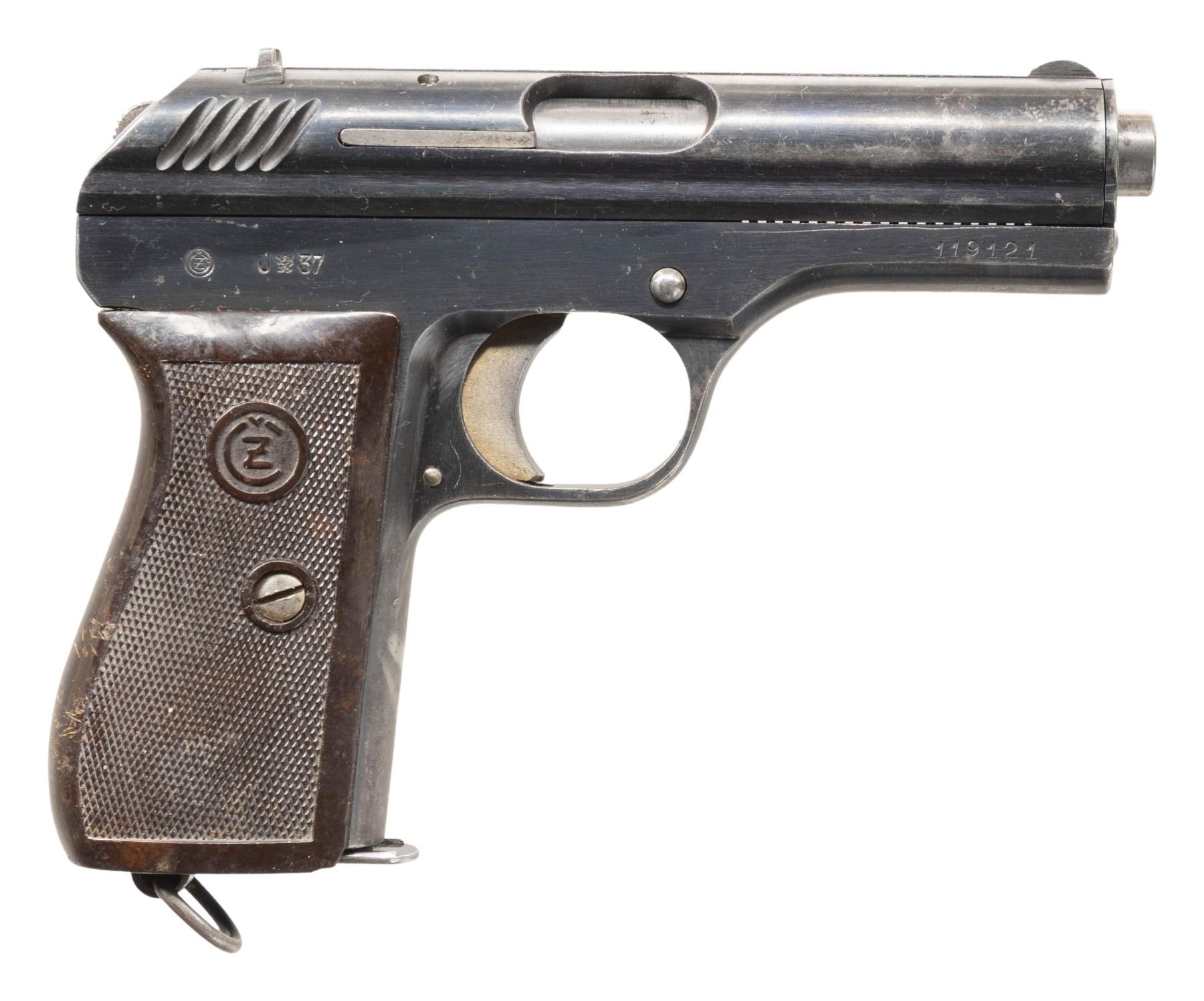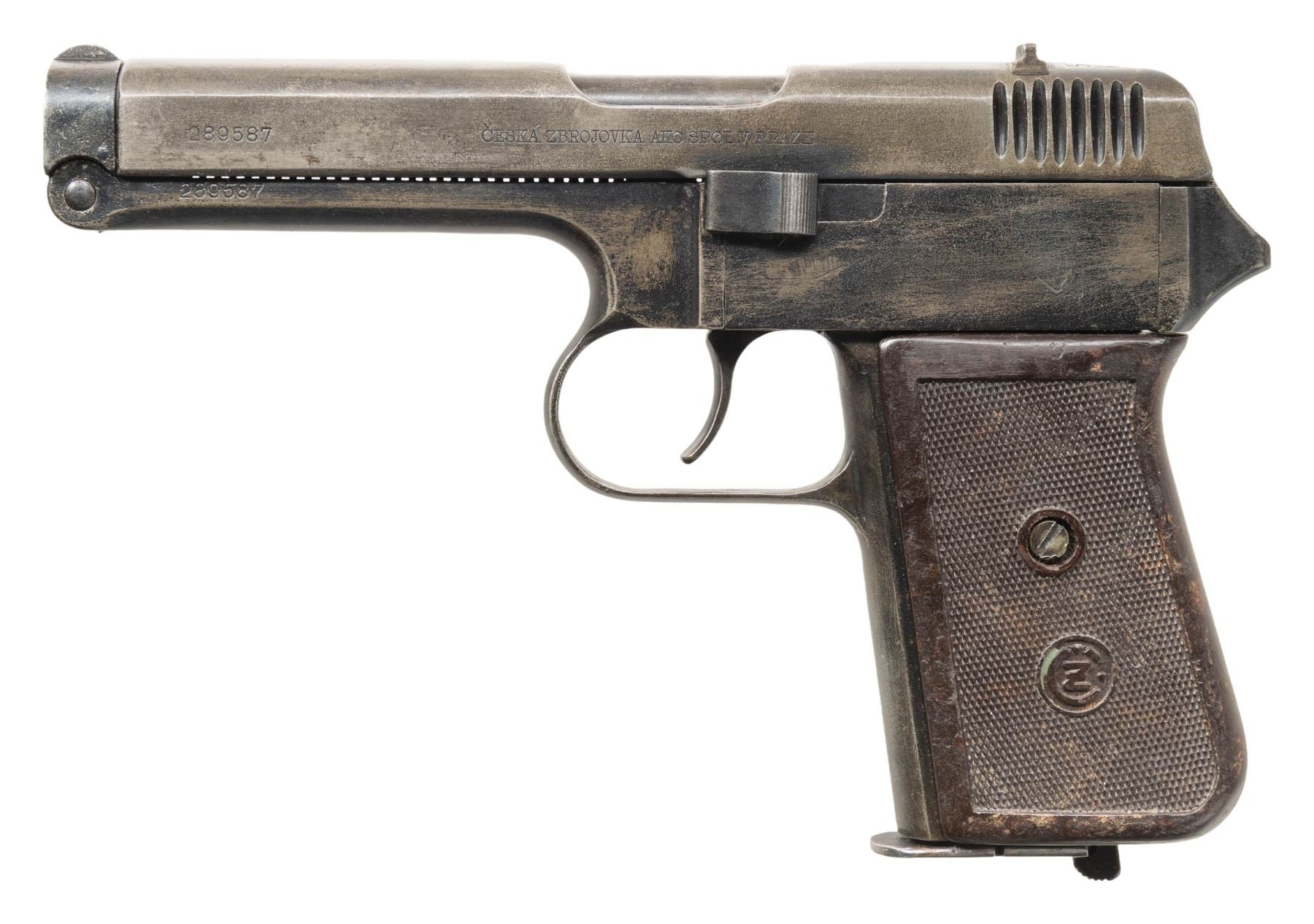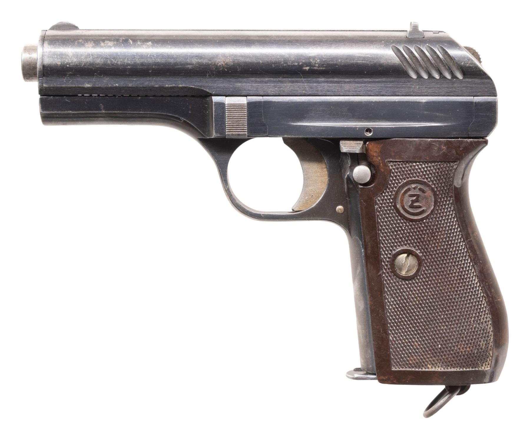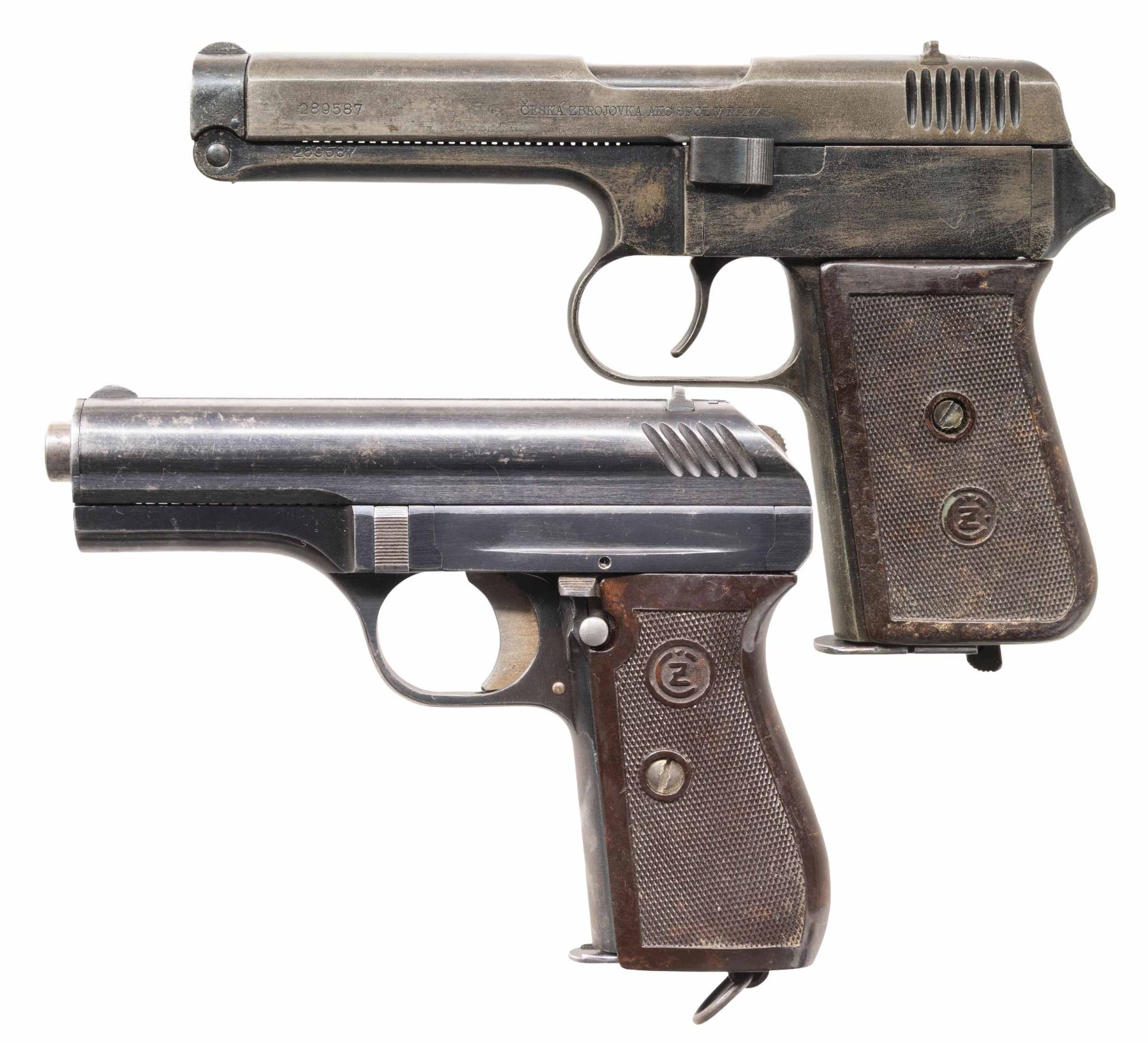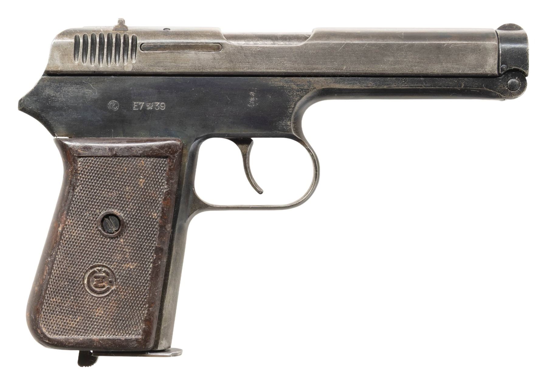 PISTOLS. 1) CZECH MILITARY ACCEPTED CZ VZ. 38 SEMI-AUTOMATIC PISTOL. Cal. 380 ACP. S# 289587. Bbl. 4 11/16". vz. 38 semi-automatic pistol mfg. by CZ circa. 1939. Left side of the slide is marked with the S#, followed by CZ's mfg. information, with a Czech rampant lion proof marked on the top. Right side of the frame is marked with the encircled "CZ" logo and a Czech "E7 (CZECH RAMPANT LION) 39" military acceptance proof marked on the right. Metal components exhibit a old reapplied blue finish overall. Frame is mounted with a 1-piece CZ logo checkered brown pressed resin wrap around grip. Fixed half-moon blade front sight and dovetailed V-notch rear sight. Matching numbers are present on the frame and slide. MAGS: 1 9-rd. CONDITION: metal components retain fair amounts of their reapplied blue finish, exhibiting areas of wear and thinning fading to gray patina, with of mild pitting overall. Relatively bright bore, exhibiting consistent light to mild pitting, while retaining good, albeit worn rifling throughout. Proper manual mechanics. Grip shows some superficial marks from handling and storage, but otherwise remains sound. (25-5367/MLW). 2) CZECH MILITARY ACCEPTED CZ VZ. 24 SEMI-AUTOMATIC PISTOL. Cal. 380 ACP. S# 119121. Bbl. 3 9/16". vz. 24 semi-automatic pistol mfg. by CZ. Top of the solid matte slide rib is marked "CESK ZBROJOVKA A.S. V. PRAZE", followed by the S# and a Czech rampant lion proof. Right side of the frame is marked with the encircled "CZ" logo, followed by a Czech military "J (RAMPANT LION) 37" acceptance proof and the S#. Metal components exhibit a blue finish overall, save for on the trigger and hammer, which are strawed. Bbl. is polished in-the-white. Frame is mounted with a 1-piece checkered pressed resin grip featuring an embossed encircled "CZ" logo on either side. Heel mag. release is fitted with a lanyard "D" ring. Integral blade front sight with dovetailed V-notch rear sight. All serialized parts are matching and include the frame, slide, and bbl. MAGS: x1 8-rd. CONDITION: metal components retain the majority of their original arsenal blue finish, exhibiting scattered spots, patches, and areas of wear that are fading to gray patina, with some scattered superficial handling marks and spots of light surface oxidation. Strawed parts are good, showing wear on contact points that is fading to gray patina with scattered spots of age related discoloration. Mirror bore, exhibiting a couple of small spots of light pitting, while retaining well defined rifling throughout. Proper manual mechanics. Grip shows some superficial marks from handling and storage, as well as a small chip on the interior edge at the bottom right corner on the right side, but otherwise remains sound. (25-5411/MLW). BOTH CURIO. $700-1,100.