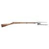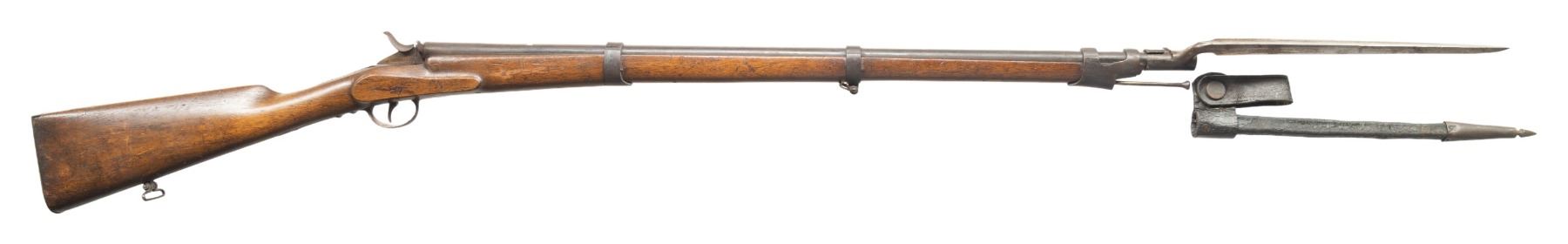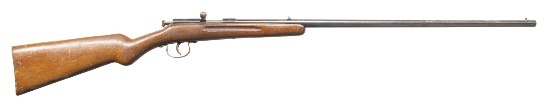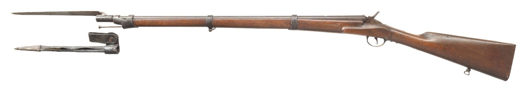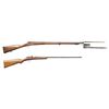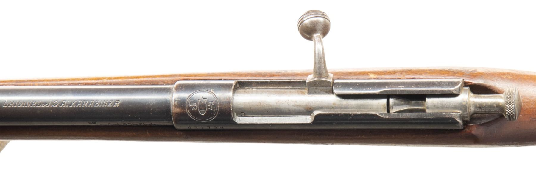 1) BELGIAN SINGLE SHOT BREECHLOADING CADET STYLE MUSKET WITH BAYONET. Cal. 8mm Rimfire. S# 3893. Bbl. 28". Cadet style single shot breechloading musket produced by an unknown mfg. in Belgium. Left side of the receiver / bbl. is marked with the S# "3893" above assorted Belgian commercial proofs and "FL.8m.1.L". 3-band fastened musket pattern 1-piece straight grip stock with flat iron buttplate and iron ramrod. Lower buttplate screw has broken on one half of the head. Toeline of stock and underside of center bbl. band feature sling swivels. Fixed musket pattern blade front sight with empty rear sight dovetail. UNATTACHED ACCESSORIES: triangular socket bayonet marked "3900" on the top flat. Bayonet is complete with its leather scabbard featuring a belt swivel and brass pointed drag. CONDITION: metal components retain trace to fair amounts of their original blue finish, exhibiting wear fading to gray and brown patinas, as well as light to mild surface oxidation overall. Bright bore, exhibiting scattered spots of light to mild pitting, while retaining good rifling throughout. Proper manual mechanics. Stock shows scattered marks and impressions from handling and storage, with 2 small cracks and a small chip present on the wrist stemming from the receiver tang. Bayonet has been partially cleaned at one time, exhibiting a gray patina, with scattered spots/patches of light to mild surface oxidation and pitting present overall. Leather scabbard has dried and stiffened, exhibiting moderate age related cracking and losses to its exterior, with stitching no longer remaining present. (25-5874/MLW). 2) JGA KARABINER SINGLE SHOT BOLT ACTION RIFLE. Cal. 6mm Flob. S# 431794. Bbl. 23 5/8". Karabiner single shot bolt action rifle mfg. in Germany by JGA. Top of the bbl. is marked "ORIGINAL J.G.A. KARABINER", with German proofs and the cal. designation marked on the left. Top of the receiver is marked with the encircled "J/ G/ A" logo, with the S# marked on the left. Metal components exhibit a blue finish overall, save for on the bolt assembly, which is polished in-the-white. 1-piece plain wood pistol grip buttstock with grasping grooves. Dovetailed blade front sight and U-notch rear sight. CONDITION: metal components retain the majority of their original factory blue finish, exhibiting areas of wear and thinning fading to gray and brown patinas, as well as some scattered spots and patches of light to mild pitting. Mirror bore, exhibiting a couple of small scattered spots of light pitting, while retaining strong rifling throughout. Proper manual mechanics. Stock shows scattered marks and impressions from handling and storage, but otherwise remains sound. PROVENANCE: From the PMRB Collection. (25-5879/MLW). BOTH CURIO. $400-650.