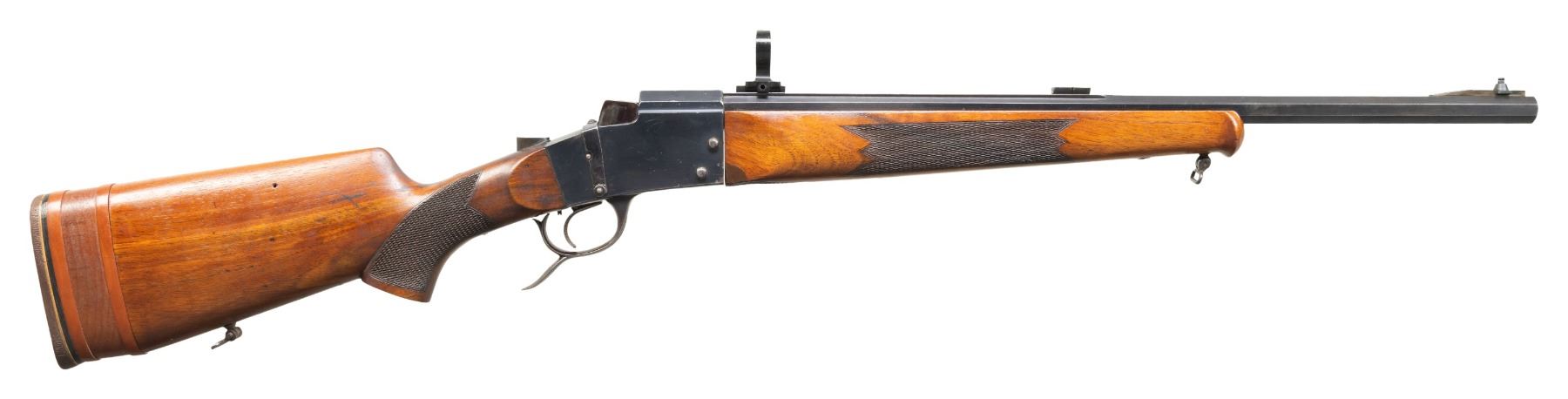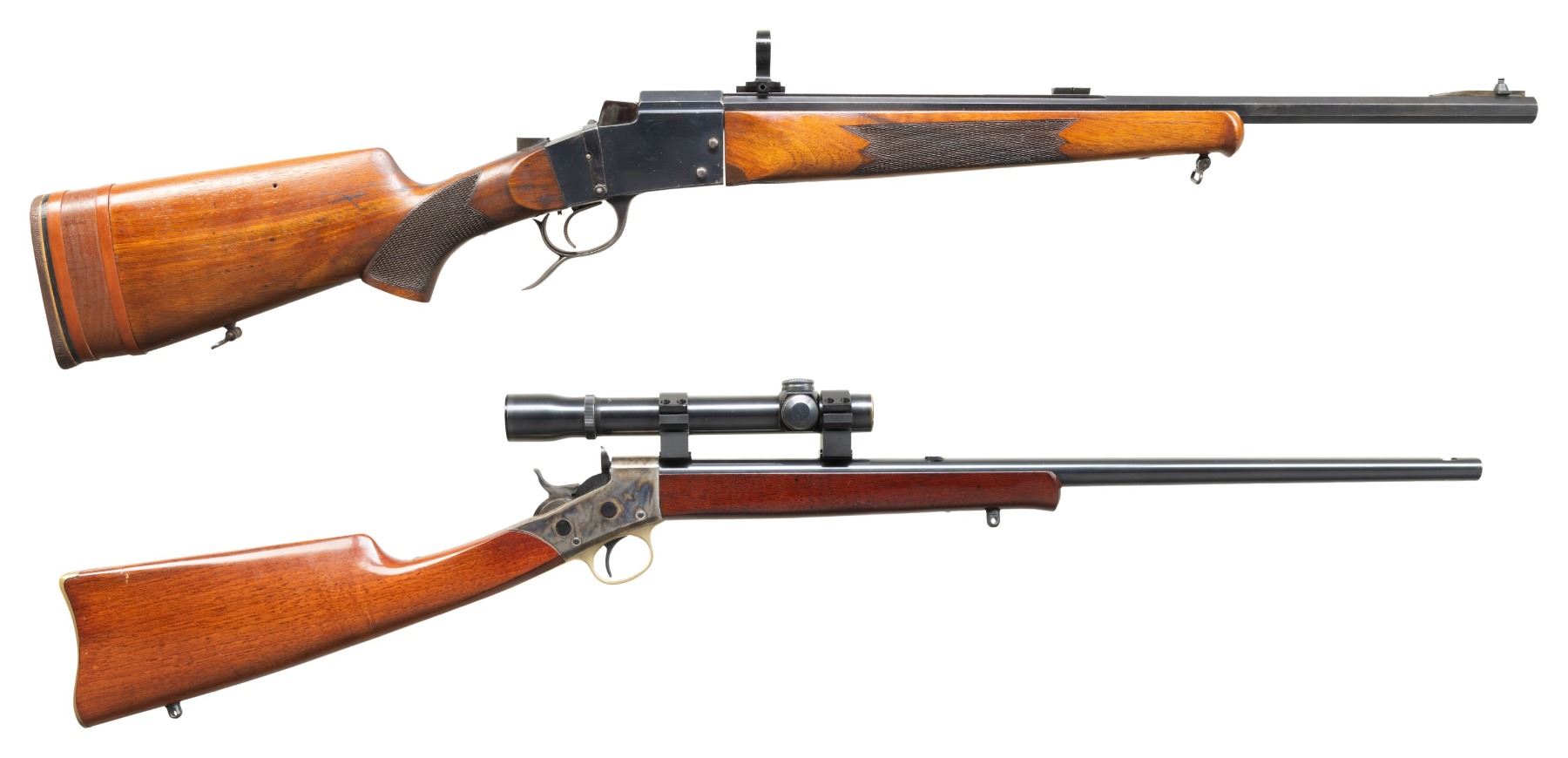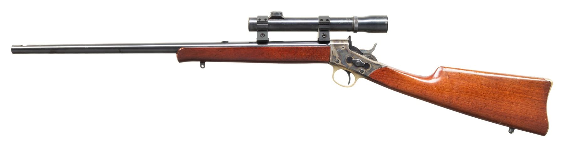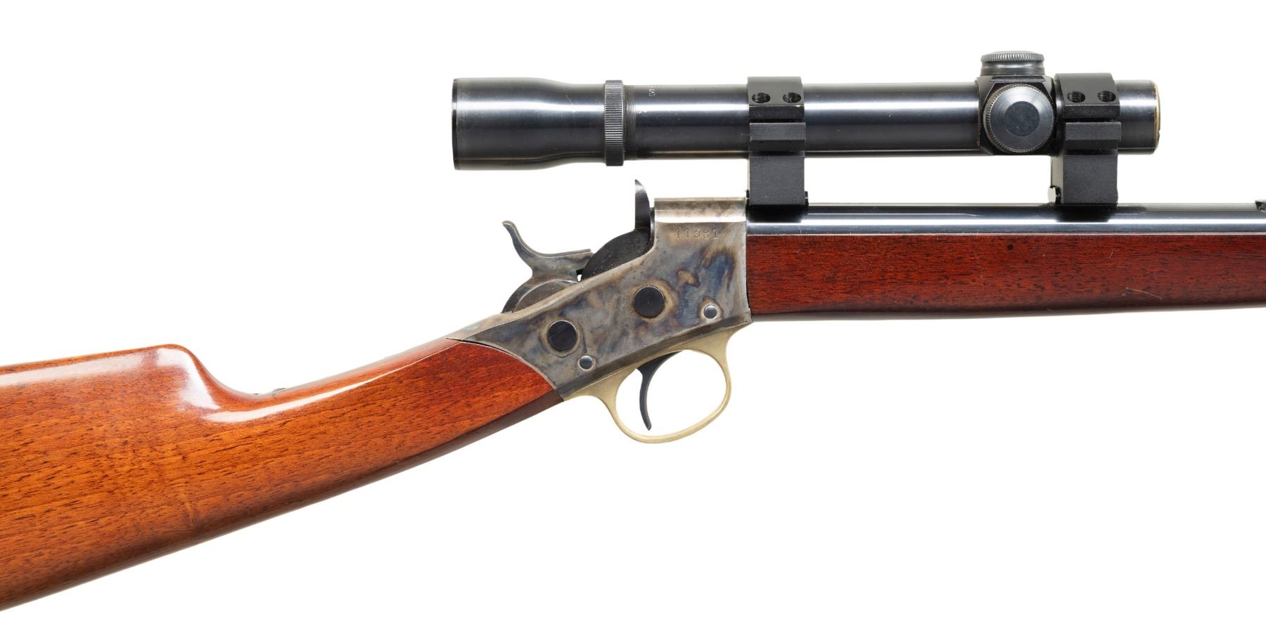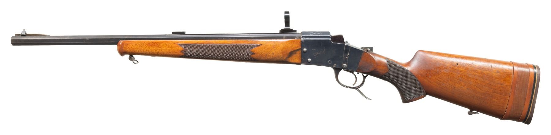 RIFLES. 1) GERMAN HAENEL KK SPORT SINGLE SHOT BREECHLOADING RIFLE. Cal. 22 LR. S# 6134. Bbl. 23 1/16". KK Sport single shot breechloading rifle mfg. in Germany by by C.G. Haenel in June of 1938. Left flat of the octagonal bbl. is stamped with a horizontal Star/H proof, followed by "BOHLERSTAHL", with "C.G.H. 6134", Crown/ B & Crown/U commercial proofs (repeated on right flat of receiver and breechblock), "Suhl", the cal. designation, and date code "638" marked on the bottom flat towards the breech. The faceted breech of the receiver is marked "HAENEL - K.K. SPORT/ Cal. .22 long rifle" on the top flat, with the Haenel arrow logo marked on the left quarter flat, and the S# marked on the left flat. Metal components exhibit a blue finish overall, save for on the trigger, which exhibits a straw finish. Checkered wood schnabel tip forend and pistol grip buttstock. Underside of forend exhibits 2 filled holes towards the rear. Buttstock exhibits a small added hole on either side towards the comb, has been shortened, and then lengthened via 3 wood spacers and Pachmayr red rubber recoil pad. Toeline of buttstock and underside of forearm feature added sling swivels. Original front sight ramp base is fitted with a contemporary dovetailed Marbles white synthetic beaded blade front sight. Top flat of the bbl. features matte grooving and is mounted with 2 scope bases (and x1 scope ring). Rear of receiver features an integral slot for a removable disc aperture rear sight. Adj. trigger features checkering along the right edge of the front face. Lever features an elongated tang as well as a checkered panel. All visible serialized parts are matching and include the frame (left side of breech & underside of tang), bbl. (underside), lever (interior), and trigger base / lower tang (interior). UNATTACHED ACCESSSORIES: unmarked rear sight adj. key. CONDITION: metal components retain the majority of their original factory blue finish, exhibiting some patches / areas of light to mild edge wear, as well as scattered spots and patches of light to mild surface oxidation and pitting. Trigger has faded to gray at contact points. Mirror bore, retaining strong rifling throughout. Proper manual mechanics. Wood furniture shows scattered superficial marks from handling and storage, with a repair present on the left side of the forearm at the lower rear edge of the receiver. (25-5855/MLW). CURIO. 2) ITALIAN I.A.R. ROLLING BLOCK RIFLE. Cal. 22 LR. S# 11381. Bbl. 22". Rolling Block pattern rifle mfg. in Italy and imported by IAR in 1997. Top of the bbl. is marked with IAR's importer information, with a pair of Italian proofs marked on the left. Left side of the receiver is marked with the catalog # "CAT. 1555" above 2 Italian proofs, a boxed "BI" (97) date code and a "GVT" logo (possibly indicating mfg. in Gardone Val Trompia), with the s# marked on the right. Bbl., breechblock, button, screws, and trigger exhibit a blue finish, with the receiver and hammer exhibiting a case colored finish. Brass trigger guard and buttplate. Plain wood forearm and straight grip buttstock. Toeline of buttstock and underside of forearm feature added sling studs. Front sight dovetail is empty, with a slot blank present in the rear sight dovetail. Bbl. has been drilled and tapped, featuring a vintage Weaver K1 scope. Bbl. matches the receiver via "381". CONDITION: receiver and breechblock retain the majority of their original factory case colored finish, exhibiting some areas of wear fading to gray patina, with scattered spots of light surface oxidation present overall. Blued parts are excellent. Bbl. exhibits several dings along the left edge of the muzzle. Mirror bore, retaining well defined rifling throughout. Proper manual mechanics. Wood furniture shows scattered marks and impressions from handling and storage, but otherwise remains sound. Scope retains a clear and sharp optic. PROVENANCE: From the PMRB Collection. (25-5901/MLW). MODERN. $600-1,000.