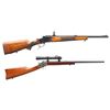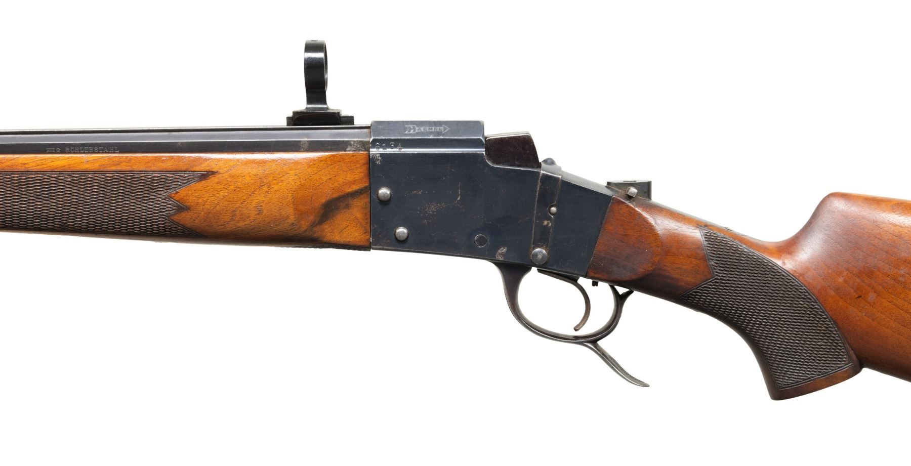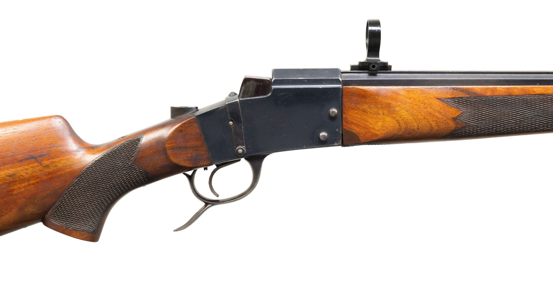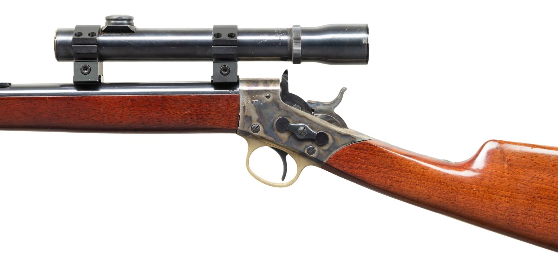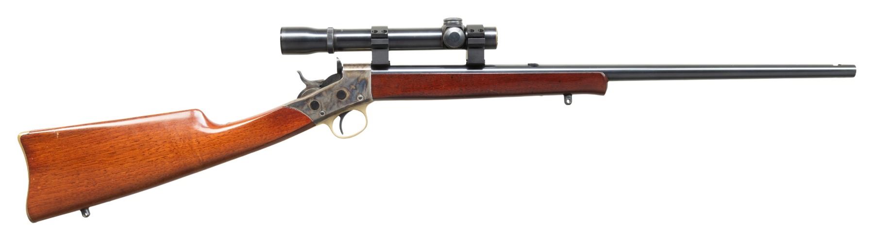 RIFLES. 1) GERMAN HAENEL KK SPORT SINGLE SHOT BREECHLOADING RIFLE. Cal. 22 LR. S# 6134. Bbl. 23 1/16". KK Sport single shot breechloading rifle mfg. in Germany by by C.G. Haenel in June of 1938. Left flat of the octagonal bbl. is stamped with a horizontal Star/H proof, followed by "BOHLERSTAHL", with "C.G.H. 6134", Crown/ B & Crown/U commercial proofs (repeated on right flat of receiver and breechblock), "Suhl", the cal. designation, and date code "638" marked on the bottom flat towards the breech. The faceted breech of the receiver is marked "HAENEL - K.K. SPORT/ Cal. .22 long rifle" on the top flat, with the Haenel arrow logo marked on the left quarter flat, and the S# marked on the left flat. Metal components exhibit a blue finish overall, save for on the trigger, which exhibits a straw finish. Checkered wood schnabel tip forend and pistol grip buttstock. Underside of forend exhibits 2 filled holes towards the rear. Buttstock exhibits a small added hole on either side towards the comb, has been shortened, and then lengthened via 3 wood spacers and Pachmayr red rubber recoil pad. Toeline of buttstock and underside of forearm feature added sling swivels. Original front sight ramp base is fitted with a contemporary dovetailed Marbles white synthetic beaded blade front sight. Top flat of the bbl. features matte grooving and is mounted with 2 scope bases (and x1 scope ring). Rear of receiver features an integral slot for a removable disc aperture rear sight. Adj. trigger features checkering along the right edge of the front face. Lever features an elongated tang as well as a checkered panel. All visible serialized parts are matching and include the frame (left side of breech & underside of tang), bbl. (underside), lever (interior), and trigger base / lower tang (interior). UNATTACHED ACCESSSORIES: unmarked rear sight adj. key. CONDITION: metal components retain the majority of their original factory blue finish, exhibiting some patches / areas of light to mild edge wear, as well as scattered spots and patches of light to mild surface oxidation and pitting. Trigger has faded to gray at contact points. Mirror bore, retaining strong rifling throughout. Proper manual mechanics. Wood furniture shows scattered superficial marks from handling and storage, with a repair present on the left side of the forearm at the lower rear edge of the receiver. (25-5855/MLW). CURIO. 2) ITALIAN I.A.R. ROLLING BLOCK RIFLE. Cal. 22 LR. S# 11381. Bbl. 22". Rolling Block pattern rifle mfg. in Italy and imported by IAR in 1997. Top of the bbl. is marked with IAR's importer information, with a pair of Italian proofs marked on the left. Left side of the receiver is marked with the catalog # "CAT. 1555" above 2 Italian proofs, a boxed "BI" (97) date code and a "GVT" logo (possibly indicating mfg. in Gardone Val Trompia), with the s# marked on the right. Bbl., breechblock, button, screws, and trigger exhibit a blue finish, with the receiver and hammer exhibiting a case colored finish. Brass trigger guard and buttplate. Plain wood forearm and straight grip buttstock. Toeline of buttstock and underside of forearm feature added sling studs. Front sight dovetail is empty, with a slot blank present in the rear sight dovetail. Bbl. has been drilled and tapped, featuring a vintage Weaver K1 scope. Bbl. matches the receiver via "381". CONDITION: receiver and breechblock retain the majority of their original factory case colored finish, exhibiting some areas of wear fading to gray patina, with scattered spots of light surface oxidation present overall. Blued parts are excellent. Bbl. exhibits several dings along the left edge of the muzzle. Mirror bore, retaining well defined rifling throughout. Proper manual mechanics. Wood furniture shows scattered marks and impressions from handling and storage, but otherwise remains sound. Scope retains a clear and sharp optic. PROVENANCE: From the PMRB Collection. (25-5901/MLW). MODERN. $600-1,000.