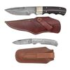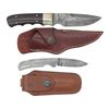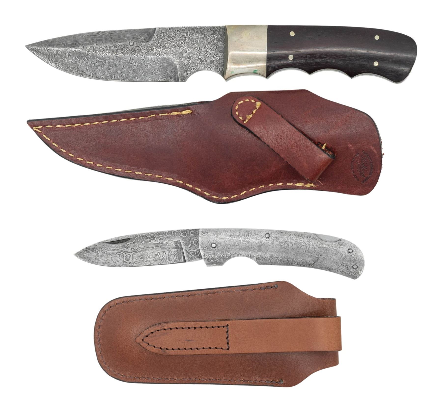 DAMASCUS KNIVES WITH SHEATHS. Lot of 2 J. Purdey & Sons knifes, including: 1) James Purdey & Sons fixed damascus drop point blade knife. Right side of the ricasso is marked "J.PURDEY & SONS/ LONDON". Blade measures 4 5/16" from the point to the bolster, and features grooved spine, which terminates in a false edge. Convex (apparent) nickel silver bolster, with 2-piece plain dark wood grip scales retained via 4 (apparent) nickel silver pins. Bolster, tang, and grip scales feature finger grooves. Complete with a Holland Sports brown leather snap button sheath. CONDITION: blade is very good, retaining strong patterning, exhibiting small spots of light to mild age related discoloration. Bolster is good, showing some spots and patches of green verdigris. Grip scales are very good overall. Leather sheath remains malleable, exhibiting some superficial marks from handling and storage. 2) James Purdey & Sons folding damascus drop point blade pocket knife. Right side of the ricasso is marked "PURDEY". Blade measures 2 3/4" from the point to the bolster area. Complete damascus steel construction, to include the 2 pinned grip scales. Complete with a brown leather Purdey snap button pouch / sheath. CONDITION: damascus retains good patterning, exhibiting some areas of wear, as well as some small scattered spots of light oxidation and/or age related discoloration. Sheath remains malleable, exhibiting a few superficial handling marks, with a patch of discoloration present on the flap. (02-25922/MLW). NON-GUN. $500-800.