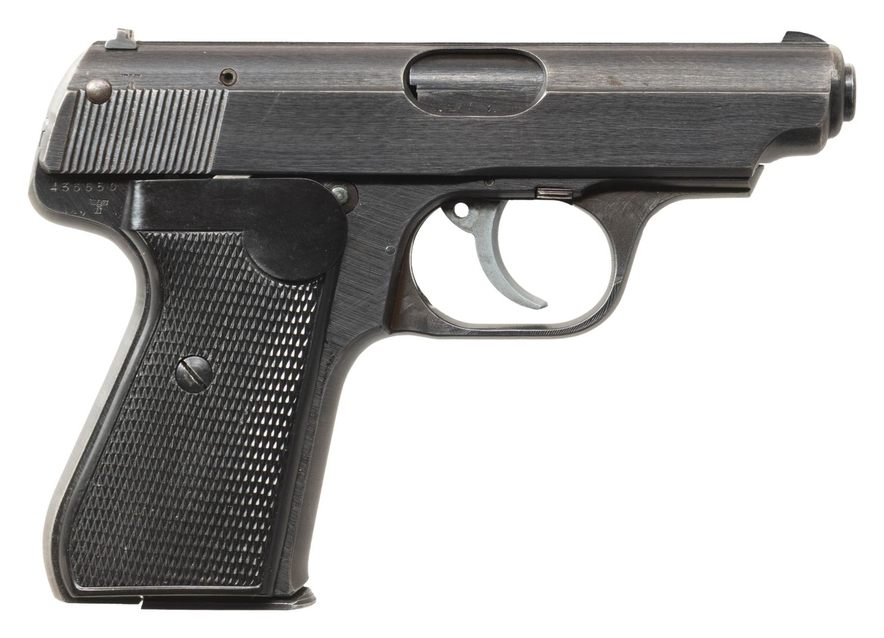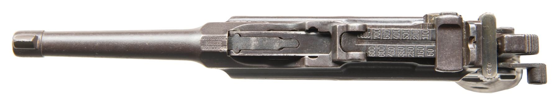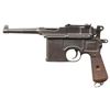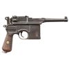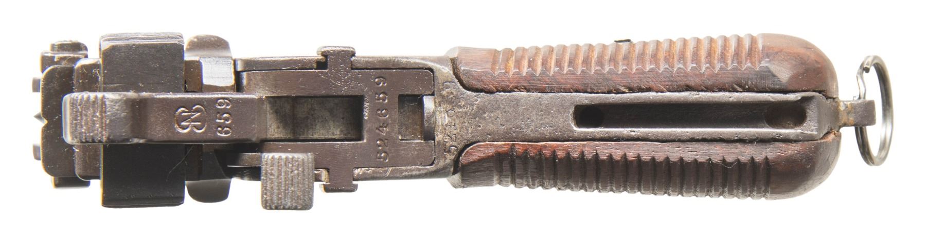 SEMI-AUTOMATIC PISTOLS. 1) CHINESE MARKED MAUSER C96 BOLO SEMI-AUTOMATIC PISTOL. Cal. 7.63mm. S# 524659. Bbl. 3 15/16". C96 Bolo semi-automatic pistol mfg. by Mauser. Top flat of the faceted chamber is marked with Mauser's 3-line address, with a double crowned "U" proof marked on the left quarter flat, and the S# marked on the left. Right side of bbl. extension is marked with 2 Chinese characters (x1 mostly illegible). Underside of bbl. is marked with a "KFS ATL GA" import mark. Left side of the frame is marked with the Mauser banner logo on the milled island, with Mauser's 2-line address marked on the right. Metal components exhibit a reapplied dull blue finish overall. Frame is mounted with 2-piece grooved wood reproduction grips, featuring an integral lanyard ring on the butt. Standard fixed blade front sight and tangent V-notch rear sight graduated 50-1000. All serialized parts are matching and include the frame, sub-frame, hammer, and floorplate, with remaining components being unnumbered. CONDITION: metal components retain large amounts of their dull reapplied blue finish, exhibiting some areas of light to mild wear and thinning, with scattered spots and patches of mild pitting present beneath the bluing. Bore exhibits consistent mild to moderate pitting, while retaining scant traces of rifling throughout. Proper manual mechanics. Reproduction grips show a few superficial handling marks, but otherwise remain sound. (25-5443/MLW). 2) J.P. SAUER & SOHN MODEL 38H SEMI-AUTOMATIC PISTOL. Cal. 7.65mm. S# 436650. Bbl. 3 3/8". Model 38H semi-automatic pistol mfg. by J.P. Sauer & Sohn for commercial sales. Left side of the slide is marked "CAL. 7,65". Right side of frame, slide, and bbl. exhibit a German Eagle/N commercial nitro proof. Metal components exhibit a blue finish overall. Frame is mounted with 2-piece checkered black synthetic grips, featuring an encircled "SUS" monogram on the left panel. Slide features a grooved matte rib with an integral fixed blade front sight and dovetailed U-notch rear sight. Slide matches the frame via "650". MAGS: x1 blued steel 8-rd. CONDITION: metal components retain the majority of their original factory blue finish, showing some spots of light to mild wear and thinning (primarily on edges), with some scattered spots of light surface oxidation present overall. Left edge of front grip strap exhibits a patch of silvering. Mirror bore, retaining well defined rifling throughout. Proper manual mechanics, to include the decocking lever. Grips show a few superficial handling marks, but otherwise remain very good overall. (25-5446/MLW). BOTH CURIO. $750-1,100.