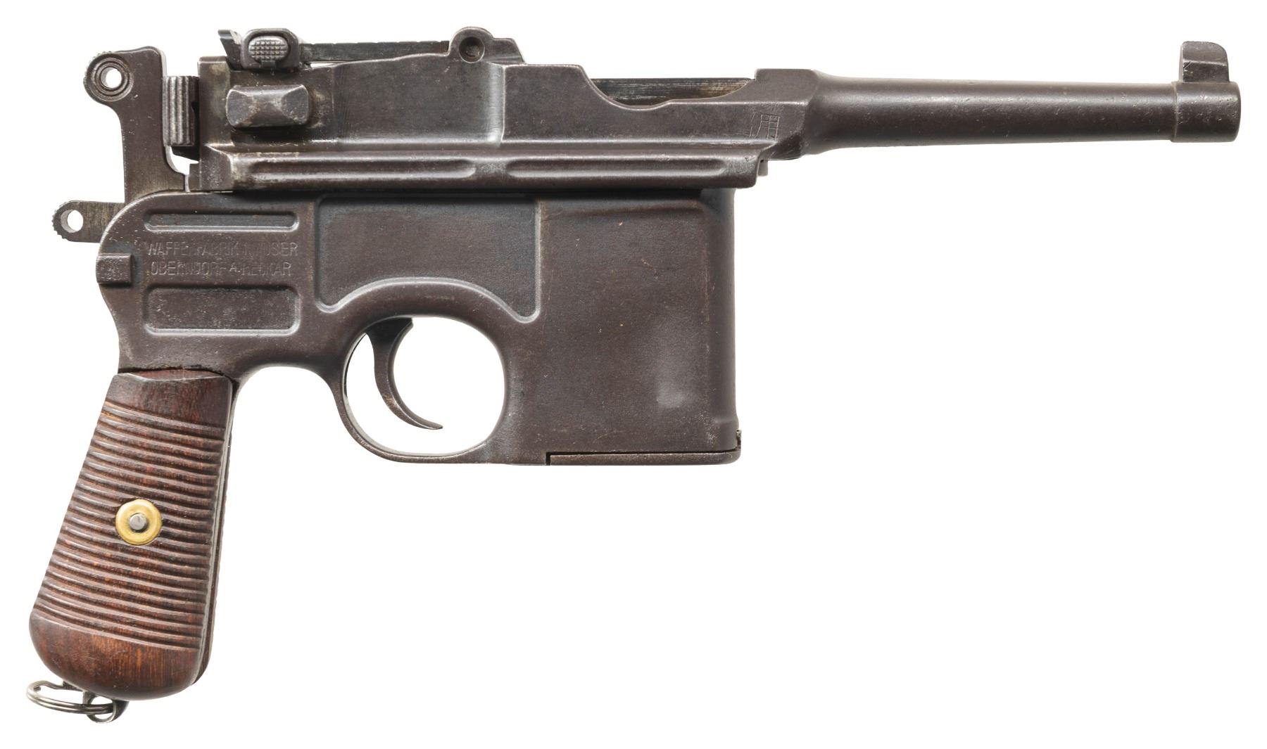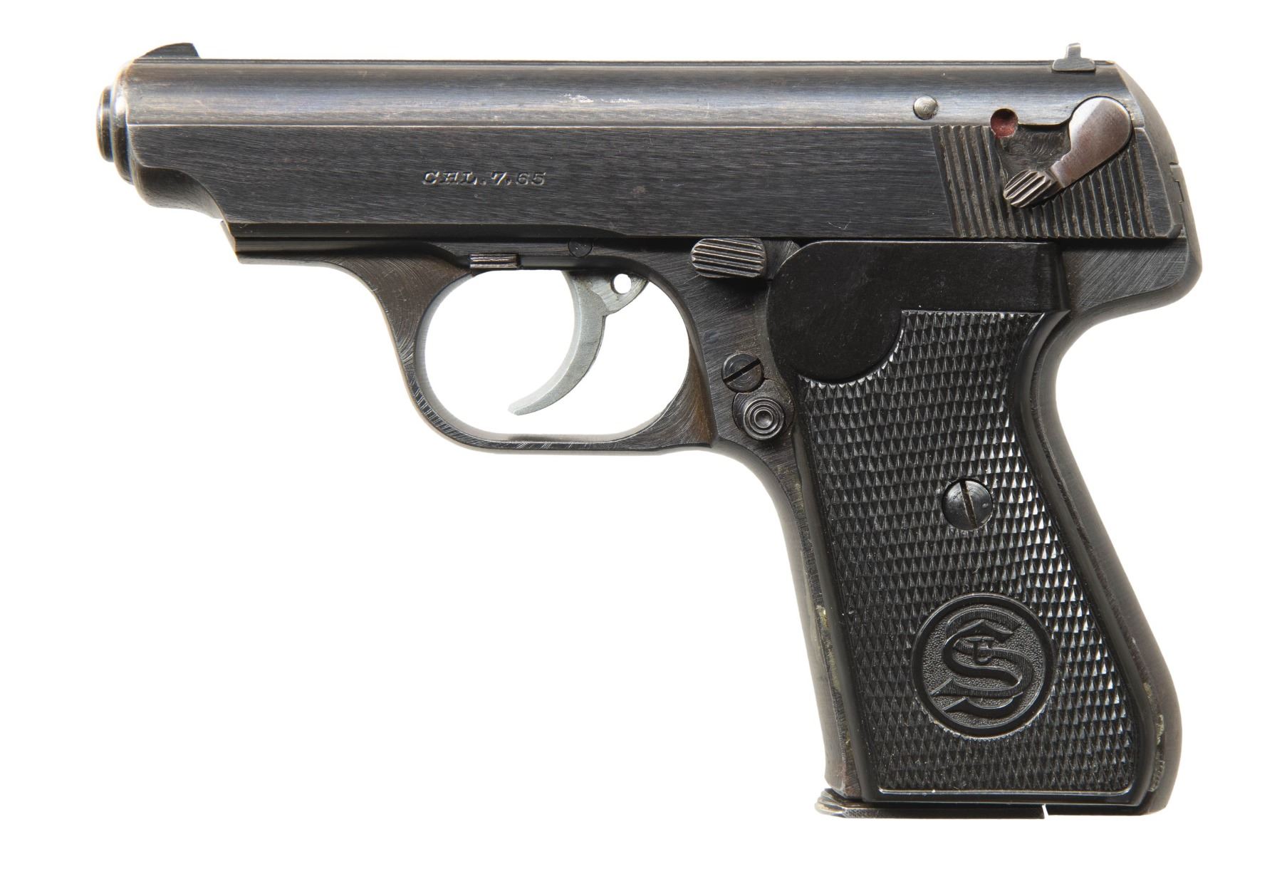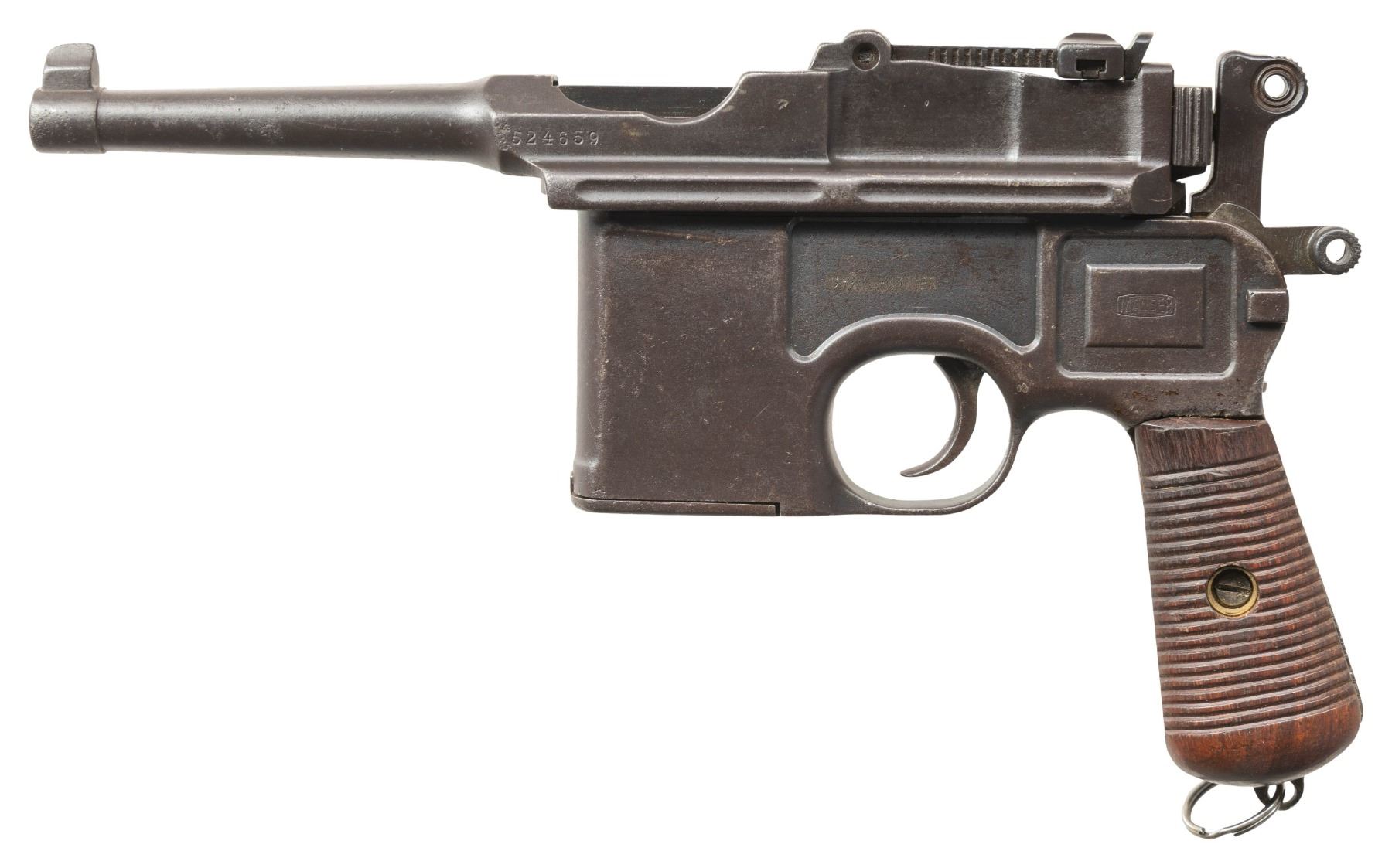 SEMI-AUTOMATIC PISTOLS. 1) CHINESE MARKED MAUSER C96 BOLO SEMI-AUTOMATIC PISTOL. Cal. 7.63mm. S# 524659. Bbl. 3 15/16". C96 Bolo semi-automatic pistol mfg. by Mauser. Top flat of the faceted chamber is marked with Mauser's 3-line address, with a double crowned "U" proof marked on the left quarter flat, and the S# marked on the left. Right side of bbl. extension is marked with 2 Chinese characters (x1 mostly illegible). Underside of bbl. is marked with a "KFS ATL GA" import mark. Left side of the frame is marked with the Mauser banner logo on the milled island, with Mauser's 2-line address marked on the right. Metal components exhibit a reapplied dull blue finish overall. Frame is mounted with 2-piece grooved wood reproduction grips, featuring an integral lanyard ring on the butt. Standard fixed blade front sight and tangent V-notch rear sight graduated 50-1000. All serialized parts are matching and include the frame, sub-frame, hammer, and floorplate, with remaining components being unnumbered. CONDITION: metal components retain large amounts of their dull reapplied blue finish, exhibiting some areas of light to mild wear and thinning, with scattered spots and patches of mild pitting present beneath the bluing. Bore exhibits consistent mild to moderate pitting, while retaining scant traces of rifling throughout. Proper manual mechanics. Reproduction grips show a few superficial handling marks, but otherwise remain sound. (25-5443/MLW). 2) J.P. SAUER & SOHN MODEL 38H SEMI-AUTOMATIC PISTOL. Cal. 7.65mm. S# 436650. Bbl. 3 3/8". Model 38H semi-automatic pistol mfg. by J.P. Sauer & Sohn for commercial sales. Left side of the slide is marked "CAL. 7,65". Right side of frame, slide, and bbl. exhibit a German Eagle/N commercial nitro proof. Metal components exhibit a blue finish overall. Frame is mounted with 2-piece checkered black synthetic grips, featuring an encircled "SUS" monogram on the left panel. Slide features a grooved matte rib with an integral fixed blade front sight and dovetailed U-notch rear sight. Slide matches the frame via "650". MAGS: x1 blued steel 8-rd. CONDITION: metal components retain the majority of their original factory blue finish, showing some spots of light to mild wear and thinning (primarily on edges), with some scattered spots of light surface oxidation present overall. Left edge of front grip strap exhibits a patch of silvering. Mirror bore, retaining well defined rifling throughout. Proper manual mechanics, to include the decocking lever. Grips show a few superficial handling marks, but otherwise remain very good overall. (25-5446/MLW). BOTH CURIO. $750-1,100.
