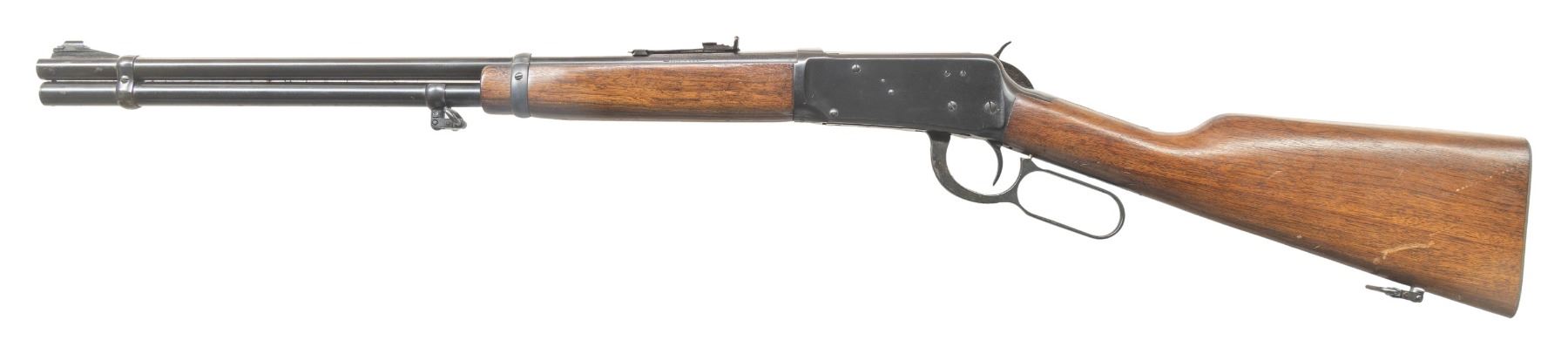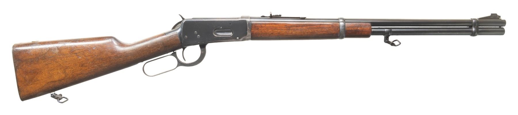 CARBINES. 1) Cal. 30-30. S# 2476400. Bbl. 20". Model 94 lever action action carbine mfg. by Winchester in 1961. Left side of the bbl. exhibits standard factory markings denoting Winchester's mfg. information, as well as the model and cal. designations. Metal components exhibit a blue finish overall. Plain wood single band fastened forearm and straight grip buttstock with matte blue finished checkered steel buttplate. Toeline of stock and underside of mag. tube feature added sling swivels. Ramped, dovetailed, and aluminum beaded blade front sight with dovetailed U-notch rear sight. Left side of receiver features added screws, likely for a Williams pattern rear sight assembly. CONDITION: metal components retain the majority of their original factory blue finish, exhibiting some scattered spots and patches of light to mild surface oxidation, as well as some superficial handling marks. Lever exhibits scattered patches of mild surface oxidation. Mirror bore, retaining well defined rifling throughout. Proper manual mechanics. Wood furniture shows scattered marks and impressions from handling and storage, but otherwise remains sound. (25-4748/MLW). 2) Cal. 30-30. S# 1731219. Bbl. 20". Mfg. in 1951. Left side of bbl. exhibits standard factory markings denoting the model and cal. designations. Metal components exhibit a blue finish overall. Plain wood forearm and straight grip stock with flat checkered steel buttplate. Comb of stock is inlaid with compass. Toeline of stock and underside of mag. tube feature added sling swivels. Ramped aluminum bead blade front sight with dovetailed U-notch rear sight. Left side of receiver features added screws, likely for a previously mounted sight / scope base. CONDITION: metal components retain large amounts to the majority of their original factory blue finish, showing areas of wear and thinning (predominately on the underside of the receiver and on edges) that are fading to gray patina, with scattered superficial handling marks, as well as a few spots of light surface oxidation and pitting present overall. Muzzle crown and mag. tube cap exhibit some light oxidation and pitting. Bright bore, exhibiting some scattered spots of light pitting and a few small spots/patches of dark moderate pitting, while retaining well defined rifling throughout. Proper manual mechanics. Wood furniture shows scattered handling marks, some minor impressions, as well as some spots/areas of flaking to the varnish, but otherwise remain sound. (25-4751/MLW). BOTH CURIO. $900-1,300.