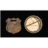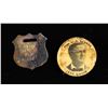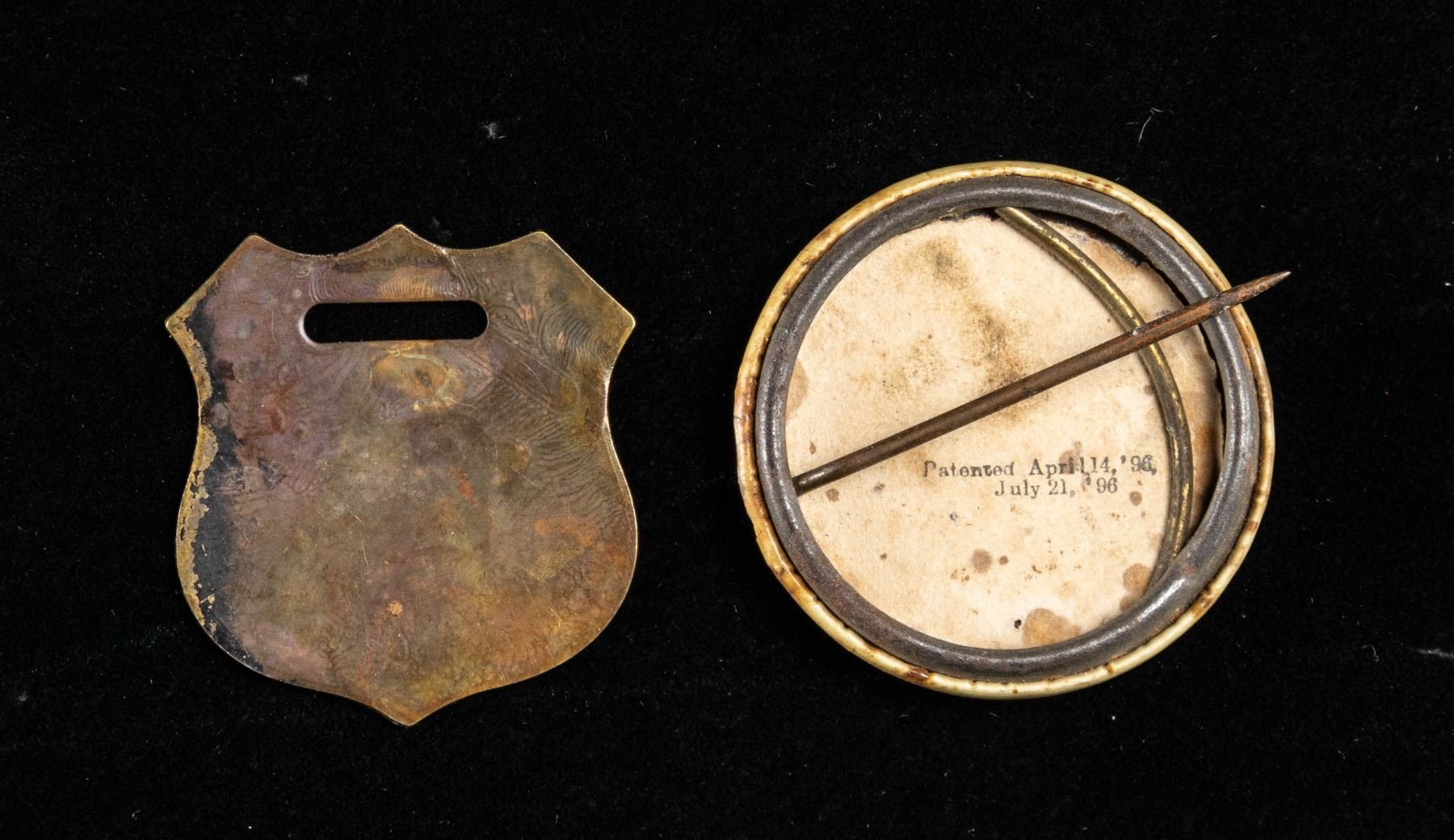 1896 JEFF DAVIS U.S. SENATOR ELECTION PINBACK BUTTON. Lot consists of: 1) Small brass shield shaped badge marked "SMITH &/ WESSON/ ARMS/ INSPECTOR/ 374" on the front. CONDITION: badge remains sound, exhibiting a mottled brown patina overall. 2) Circa. 1896 Jeff Davis Senator election pinback button. Button is marked "FOR U.S. SENATOR" above a portrait of Jeff Davis and "JEFF DAVIS". Rear of button is marked "Patented April 14, '96/ JULY 21, '96". CONDITION: badge exhibit ages related discoloration with oxidation present on metal fittings. Paper on front is torn along the edge of the upper half. PROVENANCE: Norman Olliff Estate. (02-25653/MLW). NON-GUN. $25-50.