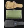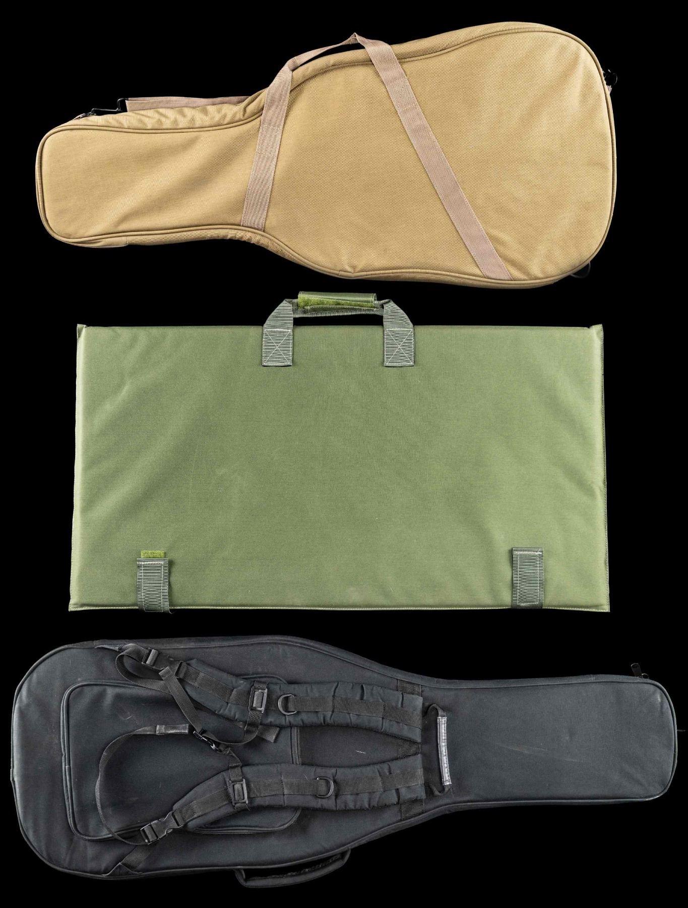 MAT. 1) Diamond Tactical TACC-1 black nylon guitar case. Padded interior with neck cradle. Exterior with molle webbing on lid. 2) LWRC discreet guitar style rifle case. Coyote nylon construction, with interior featuring padding and velcro straps. 3) Unmarked OD nylon and foam velcro foldout shooting pad. CONDUTION: items are good, with some minor exterior wear. (02-25808/MLW). NON-GUN. $300-400.