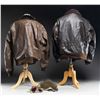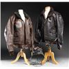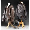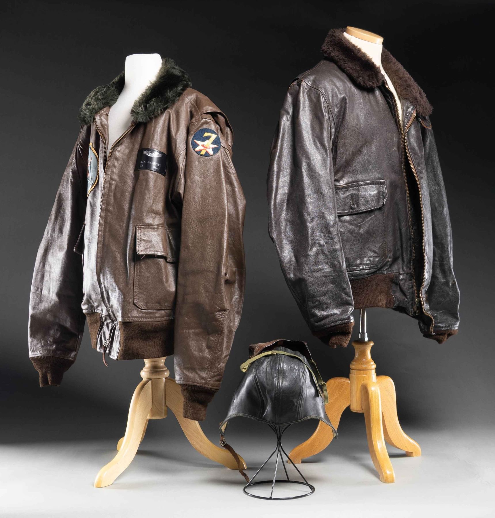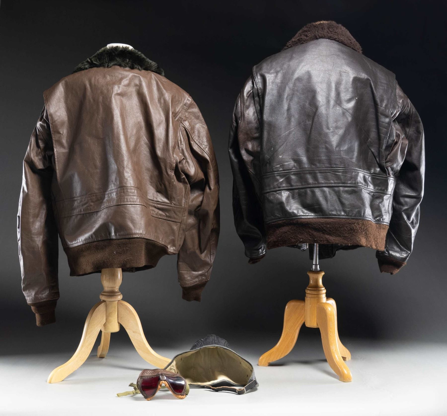 Lot of 2 U.S. bomber jackets, including: 1) USN G-1 flight jacket mfg. by Brill Bros. Brown leather construction with dark brown "fur" collar. Left sleeve with leather and suede leather 7th Army Air Force patch. Left breast with black leather name tag marked "M.V. ANDREWS/ COL USAAF". Right breast with AVG (American Volunteers Group) "Flying Tigers" leather patch. Zipper cover is marked "USN" in small holes. Interior with mfg./size label marked "JACKET, FLYING, MAN'S,/ INTERMEDIATE, TYPE G-1" above size "48" marking and mfg. information. CONDITION: leather remains malleable, exhibiting some light wear and small scattered spots of light crazing. Patches show age related cracking and crazing. 2) US WWII flight jacket. Dark brown leather construction with dark brown "fur" collar. No patches present, with no indication of patches ever having been applied. Zipper cover is marked "USN" in small holes. Mfg./size label on interior is absent. CONDITION: leather remains malleable, exhibiting some scattered small spots of crazing. 3) US aviator skull cap. Leather construction with white cloth interior. CONDITION: good with light crazing and scattered handling marks. Leather along edges has flaked off. 4) US WWII USAAF dark adaptation goggles. Leather frame with "fur" trim, celluloid lenses, and elastic strap. CONDITION: good, with strap appearing to have torn on the right side. (02-24126/MLW). NON-GUN. $200-400.