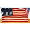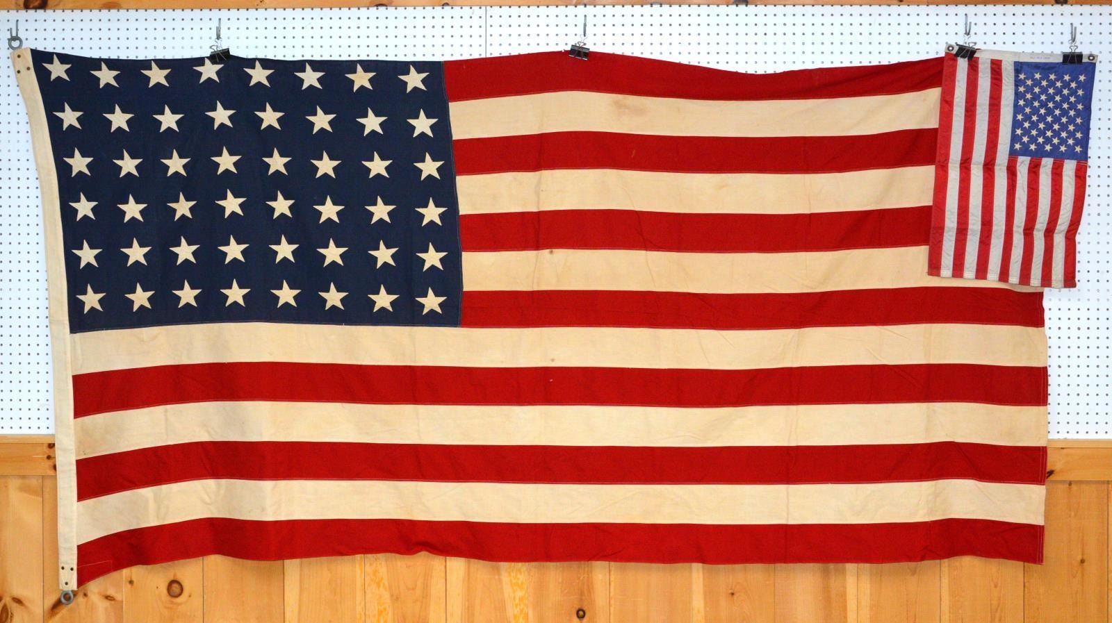 This lot consists of the following US flags: 1. 50 Star Flag. This flag measures 16x24". Flag appears to be of recent construction. CONDITION: flag label is faint, flag shows some moderate staining & a couple small holes. 2. Large 48 star flag. This flag measures 108"x52". The flag appears unmarked. CONDITION: flag shows some staining & some age wear. (02-20934/MJC). $50-75.