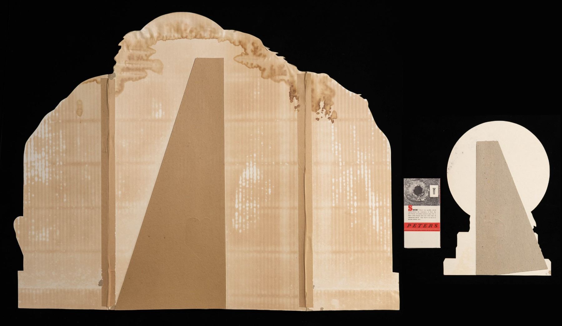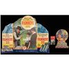 ADVERTISING STANDEES. 1) Large Peters Cartridge Company Filmkote ammunition 3-panel store advertising standee. Left panel features a blue graphic of a bird above "Keep/ your barrel clean/ by using/ FILMKOTE/ 22's/ THEY ARE RUSTLESS" above a graphic of 3 Peters Filmkote .22 caliber cartridge boxes. Center panel is marked with "Boys, you'll/ score better with/ FILMKOTE/ INVISIBLY LUBRICATED" within a circle above a scene of a man and 2 boys with Peters Filmkote ammunition, the Peters logo, and a blue banner reading "THE PETERS CARTRIDGE COMPANY". Right panel is marked with a scene of 2 rats above "Good marksmanship/ gets rid of pests/ with/ FILMKOTE/ 22's/ CLEAN/ ACCURATE/ POWERFUL" and 3 .22 caliber Peters cartridges. Standee is accompanied by its factory shipping box with label indicating shipment to "Leslie's Store" in Abilene, KS from the Peters Cartridge Company. CONDITION: standee retains clear and strong coloration, with upper edges of panels (notably the center panel) exhibiting moisture / water related damage and staining and some small losses, with staining more notable on rear face. Shipping box shows water / moisture related staining on corresponding areas to the standee. 2) Small Peters Cartridge Company store countertop advertising standee. Standee features a circular graphic of a boy and girl with rifles aimed above a stack of assorted Peters .22 caliber ammunition boxes. Standee is accompanied by a vintage Peters ammunition pamphlet. CONDITION: standee is good, showing scattered spots and patches of surface level exterior losses to the graphic predominately on the circular scene. Otherwise graphic retains clear and strong coloration. Pamphlet exhibits some minor exterior losses, but otherwise remains sound. PROVENANCE: Norman Olliff Estate. (02-25110/MLW). NON-GUN. $250-350.