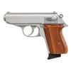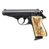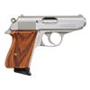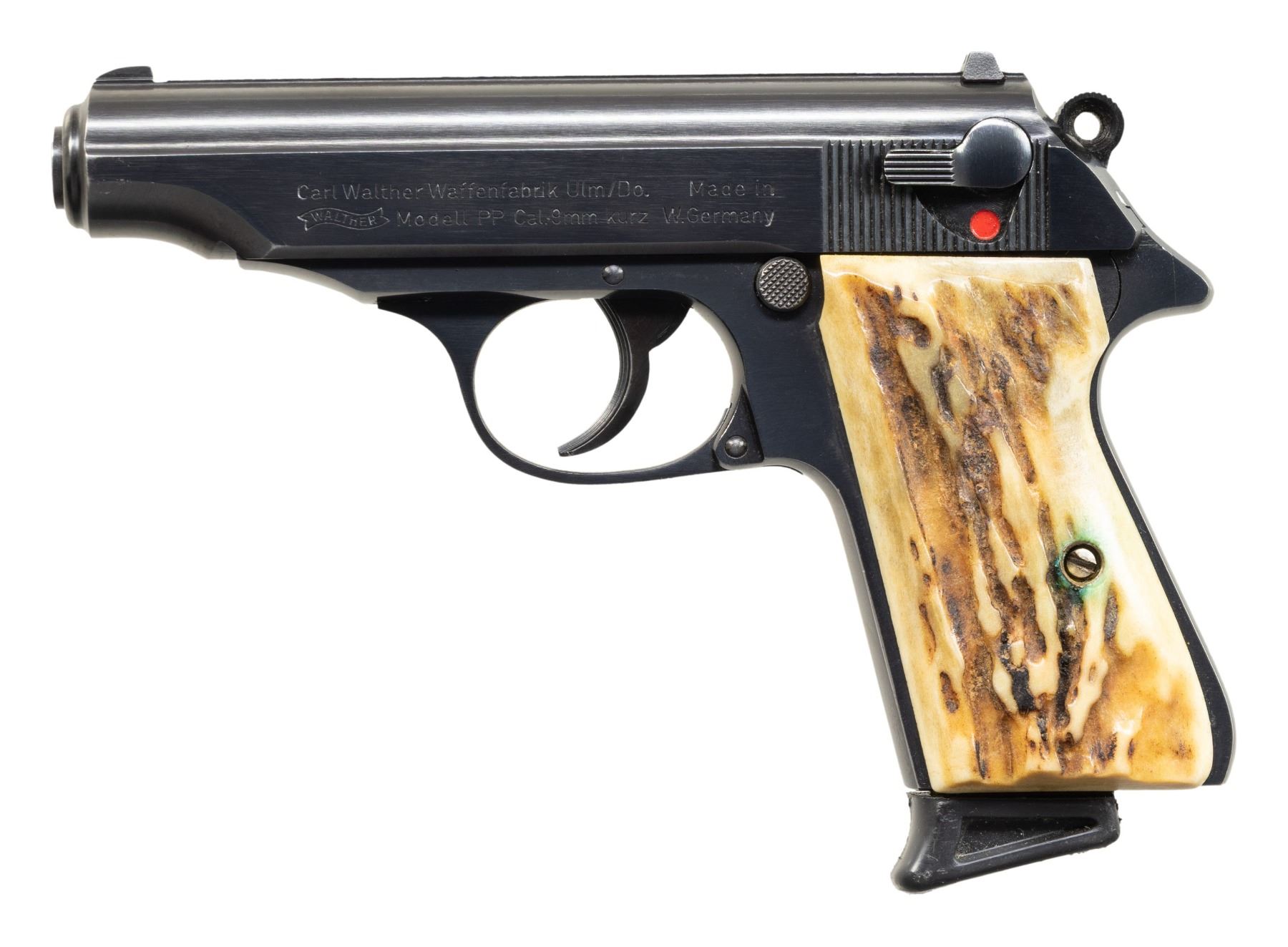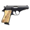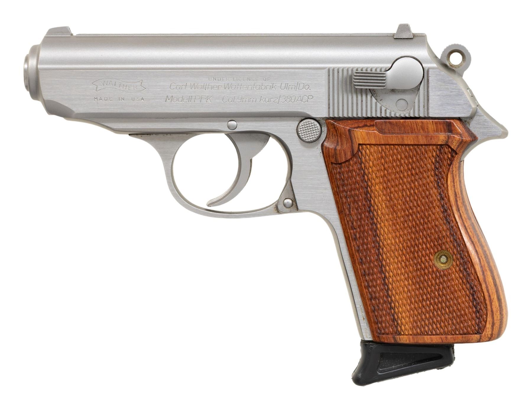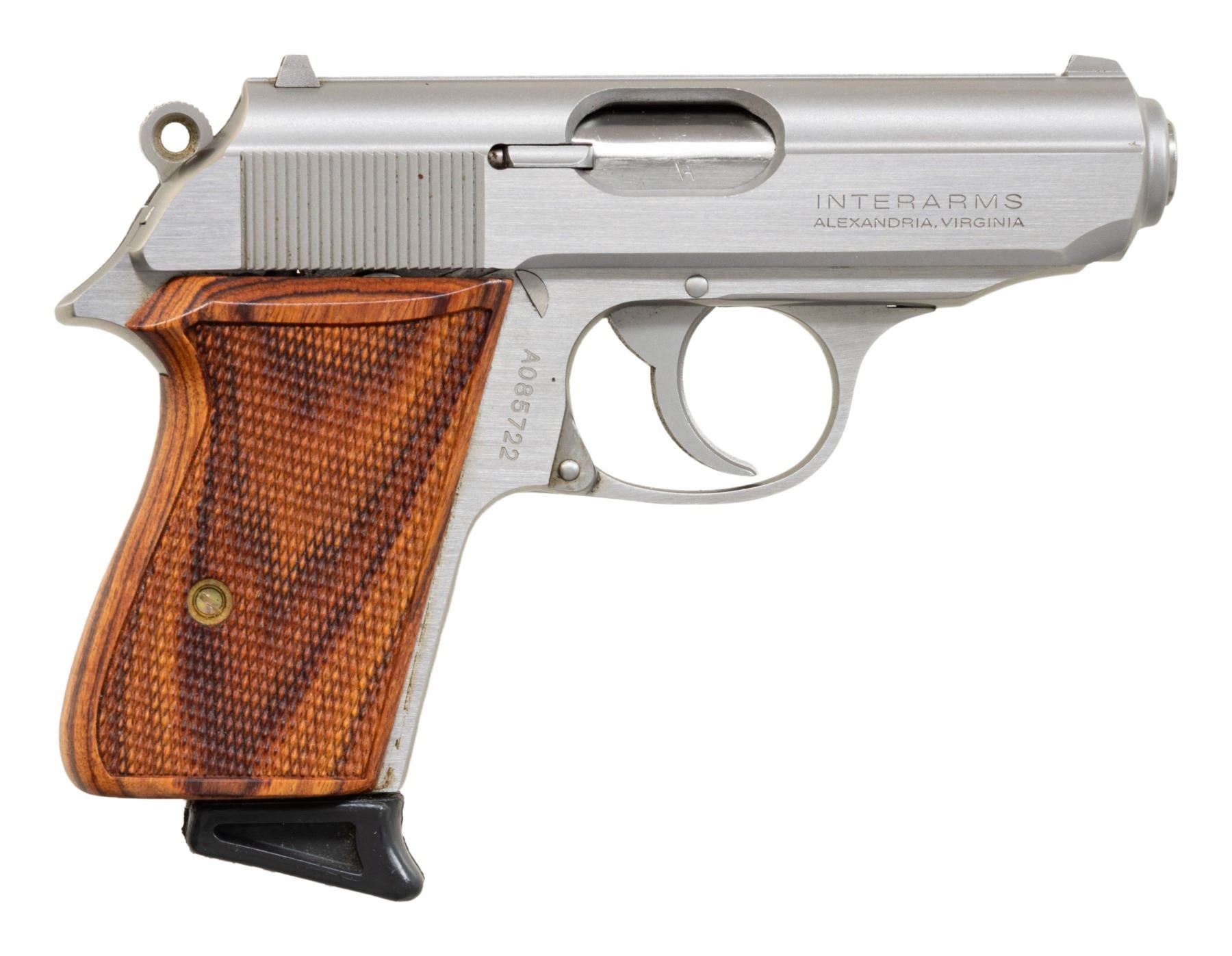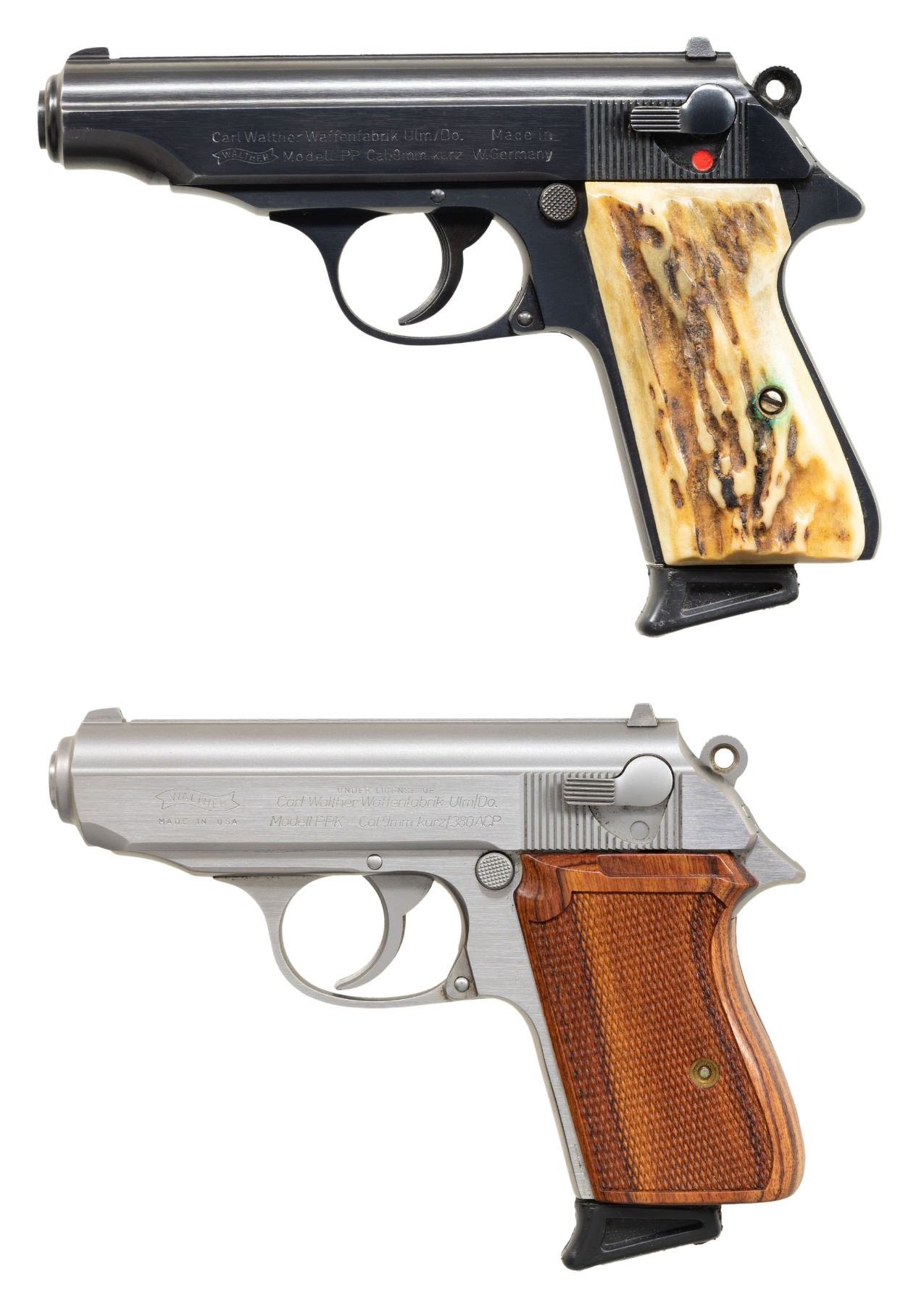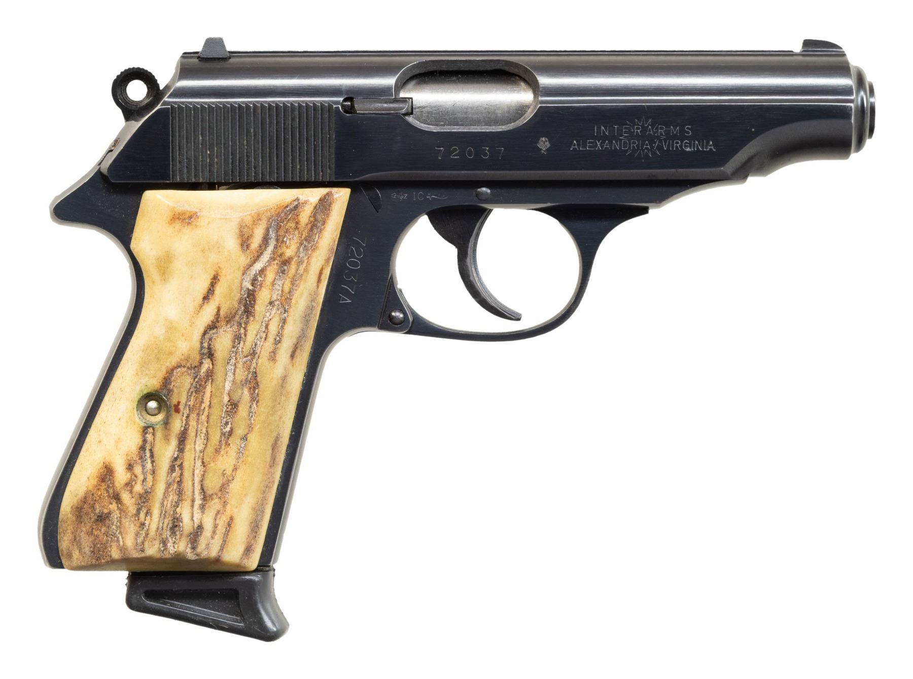 SEMI-AUTOMATIC PISTOLS. 1) Walther Model PP SEMI-AUTOMATIC PISTOL. Cal. 9mm Kurz. S# 72037A. Bbl. 3 13/16". Model PP semi-automatic pistol mfg. in West Germany by Walther in 1982. Left side of the slide is marked with Walther's mfg. information, as well as the model and cal. designations, with the S# and Interarms' importer information marked on the right. Right side of the frame is marked with an Eagle/N commercial nitro proof (repeated on right side of slide and bbl.), followed by an "IC" (82) date code, and an Ulm proof house antler. Metal components exhibit a blue finish overall, save for on the chamber area of the bbl., which is polished in-the-white. Frame is mounted with 2-piece stag grips. Slide features a grooved matte rib with an integral white dot blade front sight and dovetailed square notch rear sight. Slide matches the frame via the full S#, minus the "A" suffix. MAGS: 1 stainless steel 7-rd. with black synthetic grip extension. CONDITION: metal components retain the majority of their original factory blue finish, exhibiting some spots/patches of light to mild edge wear, as well as some superficial handling marks overall. Brilliant mirror bore, retaining well defined rifling throughout. Proper manual mechanics, to include the safety / decocking lever. Grips are very good overall. (25-4687/MLW). 2) INTERARMS MODEL PPK SEMI-AUTOMATIC PISTOL. Cal. 380 ACP. S# A085722. Bbl. 3 5/16". Model PPK semi-automatic pistol mfg. by Interarms under license from Walther. The left side of the slide is marked with the Walther banner logo, followed by "UNDER LICENSE OF", above Walther's information, as well as the model and cal. designations, with Interarms' mfg. information marked on the right. Metal components exhibit a stainless steel finish overall. Frame is mounted with 2-piece checkered laminated wood grips. Slide features a grooved matte rib with an integral blade front sight (white bead absent) and a dovetailed square notch rear sight. MAGS: 1 stainless 7-rd. with black synthetic grip extension. CONDITION: excellent, with some light scratches and superficial handling marks. Mirror bore, exhibiting some streaks of hardened grease, while retaining well defined rifling throughout. Proper manual mechanics, to include the safety / decocking lever. Grips are very good overall. (25-4707/MLW). BOTH MODERN. $800-1,200.