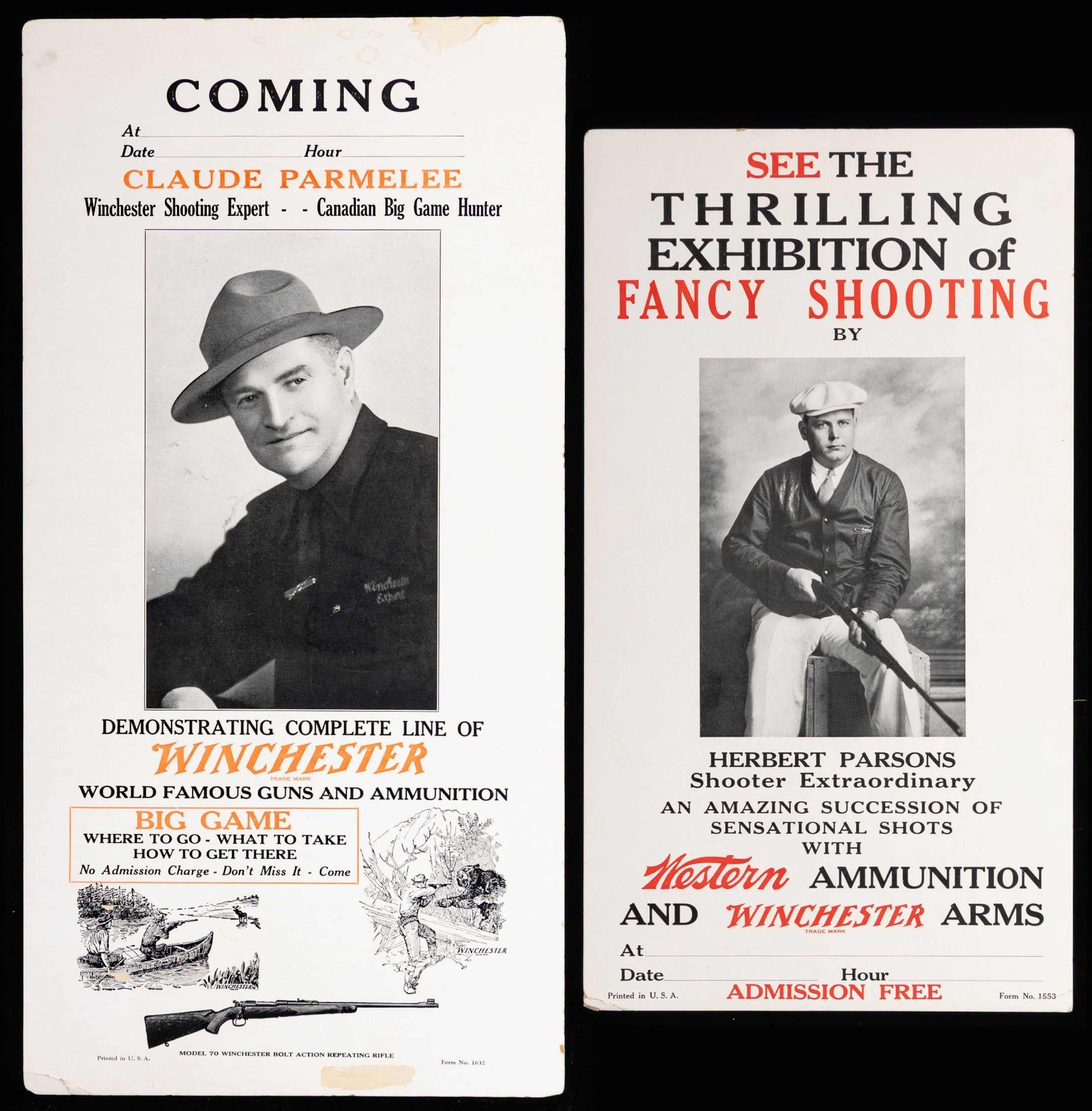 PARSONS ADVERTISING POSTERS. 1) Winchester Claude Parmelee (1891-1952) cardboard advertising poster. Poster is marked "COMING/ At (BLANK)/ Date (BLANK) Hour (BLANK)/ CLAUDE PARMELEE/ Winchester Shooting Expert - - Canadian Big Game Hunter/ (PORTRAIT OF CLAUDE PARMELEE)/ DEMONSTRATING COMPLETE LINE OF/ (WINCHESTER TRADEMARK LOGO)/ WORLD FAMOUS GUNS AND AMMUNITION" above a boxed "BIG GAME/ WHERE TO GO - WHAT TO TAKE/ HOW TO GET THERE/ No Admission Charge - Don't Miss It - Come", two Winchester hunter scenes, and a graphic of a Winchester Model 70. CONDITION: sign is good, showing some scattered spots of discoloration and moisture / water related staining. Bottom of poster exhibits a section of loss from a previously applied label / sticker, with a crease present at the bottom left corner. Poster exhibits no holes from prior hanging. 2) Winchester / Western Herbert Parsons (1908-1959) cardboard advertising sign. Sign is marked "SEE THE/ THRILLING/ EXHIBITION of/ FANCY SHOOTING/ BY/ (PORTRAIT OF HERBERT PARSONS)/ HERBERT PARSONS/ Shooter Extraordinary/ AN AMAZING SUCCESSION OF/ SENSATIONAL SHOTS/ WITH/ (WESTERN TRADEMARK LOGO) AMMUNITION/ AND (WINCHESTER TRADEMARK LOGO) ARMS/ At (BLANK)/ Date (BLANK) Hour (BLANK)/ ADMISSION FREE". CONDITION: sign is very good, showing some age related discoloration and some small scattered nicks along edges. Poster exhibits no holes from prior hanging. Bottom corners each show a small crease. PROVENANCE: Norman Olliff Estate. (02-25671/MLW). NON-GUN. $200-300.