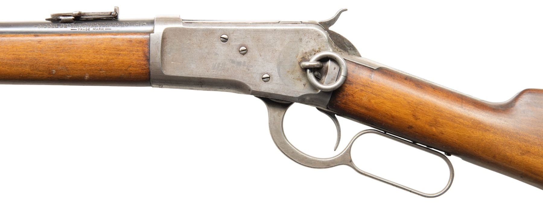 RIFLES. 1) WINCHESTER MODEL 92 LEVER ACTION SADDLE RING CARBINE. Cal. 25-20. S# 577592. Bbl. 18 1/2". Model 92 lever action saddle ring carbine mfg. by Winchester in 1910. Left side of the bbl. exhibits standard factory markings denoting the model and cal. designations, with Winchester's mfg. information marked on the right. Bbl. and mag. tube exhibit a blue finish overall. Sanded and refinished plain wood single band fastened forearm and straight grip stock with carbine buttplate. Ground blade front sight (base brazed into dovetail) and dovetail carbine ladder rear sight. Left side of receiver features a saddle ring staple and ring. CONDITION: receiver, lever, bbl. band, mag. tube band, and buttplate have been cleaned at one time, having faded to a mottled gray patina with scattered spots of light surface oxidation and pitting overall. Bbl. retains the majority of its original factory blue finish, showing some light wear and thinning fading to gray patina, as well as some scattered superficial handling marks and spots of light surface oxidation. Mag. tube shows streaks of wear fading to gray patina and scattered handling marks. Mirror bore, exhibiting some scattered spots of light pitting towards the muzzle, while retaining strong rifling throughout. Proper manual mechanics. Wood furniture shows scattered marks and impressions from handling and storage, but otherwise remains sound. (25-5341/MLW). 2) WINCHESTER MODEL 1892 LEVER ACTION RIFLE. Cal. 38 WCF. S# 286205. Bbl. 18 5/8". Model 1892 lever action rifle mfg. by Winchester in 1905. Top flat of the octagonal bbl. is marked with Winchester's 2-line mfg. and patent information, with the cal. designation marked towards the breech. Sanded and refinish plain wood forearm and straight grip buttstock with crescent steel buttplate. Aftermarket dovetailed blade front sight (bead absent) and dovetailed U-notch rear sight (elevation slide absent). Bbl. and mag. tube have been shortened, with the factory mag. tube band's dovetail having been filled in. Left side of the receiver exhibits an added hole. CONDITION: receiver has been heavily cleaned at one time, exhibiting a gray patina with cleaning striations and scattered spots/patches of light surface oxidation and pitting present overall. Remaining metal components have faded to a dark gray patina, exhibiting scattered spots and patches of dark oxidation. Bore exhibits scattered patches of dark mild to moderate pitting, while retaining fair to good rifling throughout. Proper manual mechanics. Wood furniture shows scattered marks and impressions from handling and storage, but otherwise remains sound. (25-5497/MLW). BOTH CURIO. $900-1,400.