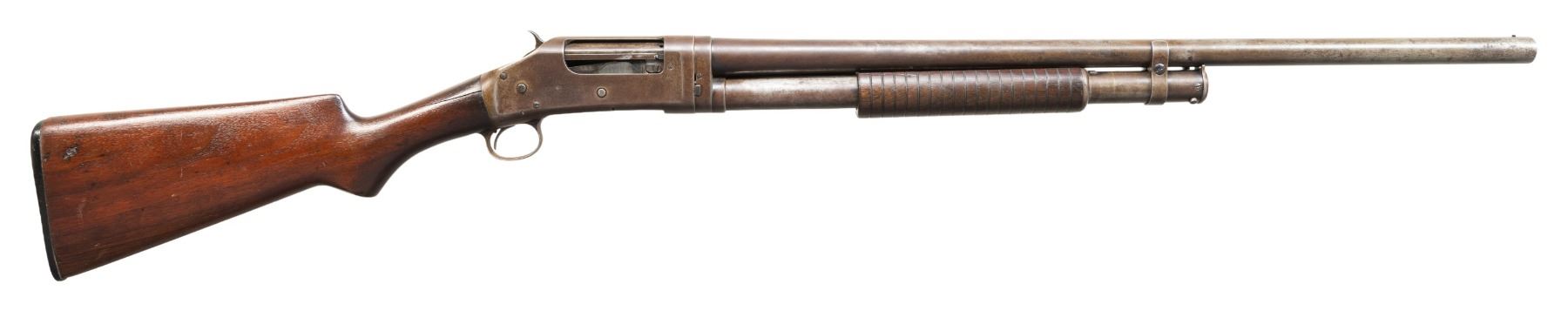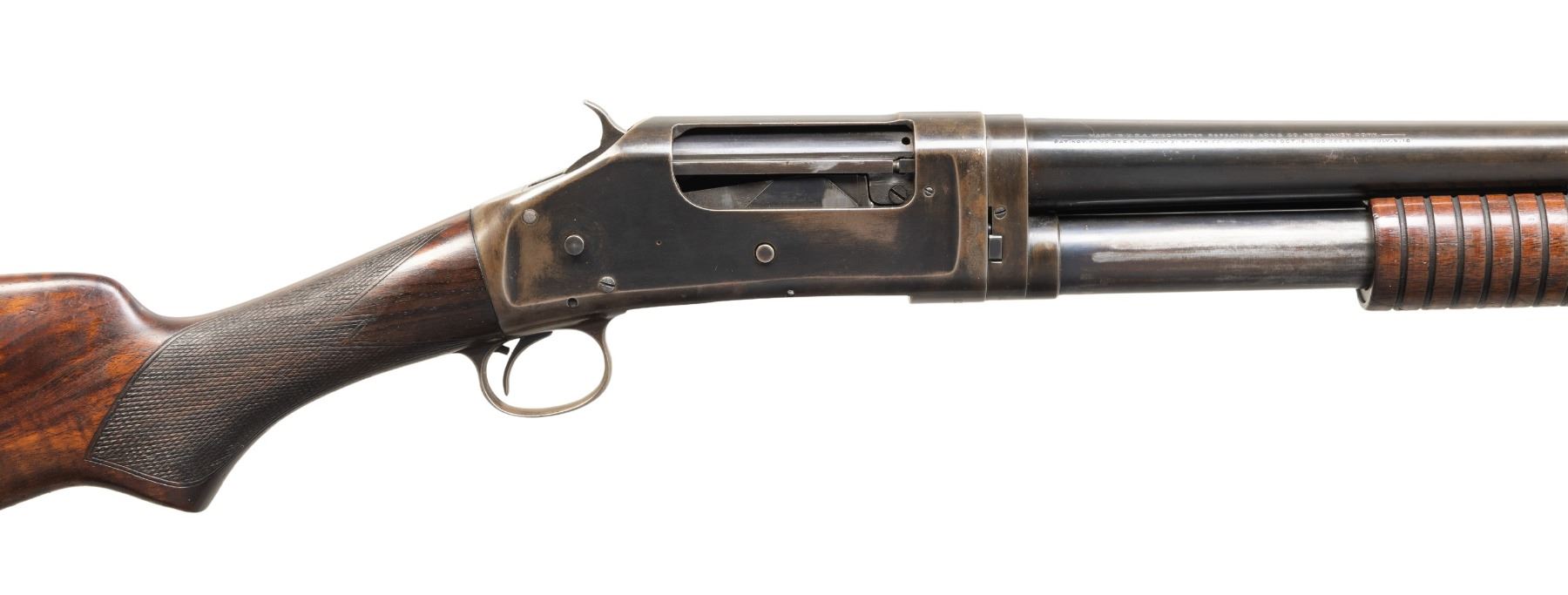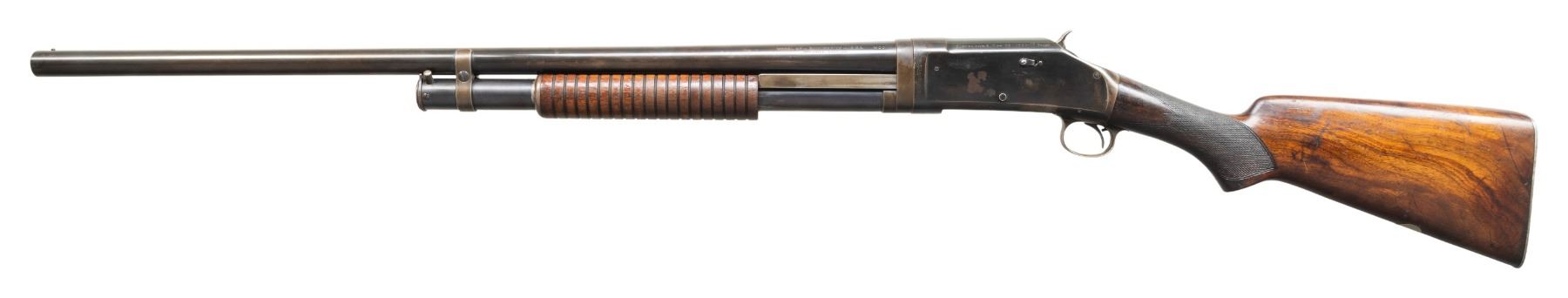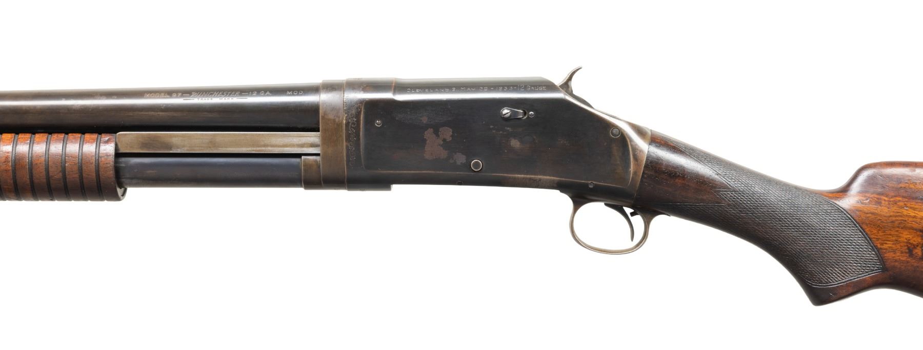 SHOTGUNS. 1) Cal. 12 GA. S# E510042. Bbl. 26". Model 1897 pump action shotgun mfg. by Winchester in 1912. Top of the bbl. is marked with Winchester's 2-line mfg. and patent information, followed by "12 GA.", with a "CYL." choke markings stamped on the left towards the breech. Left side of action slide is marked "MODEL 1897/ -WINCHESTER-". Grooved wood pump with sanded and refinished plain wood pistol grip buttstock and checkered black hard rubber buttplate. Brass bead front sight. Matching numbers are present on the receiver and receiver extension. CONDITION: metal components retain traces of their original factory blue finish, with the balance having faded to a mottled brown patina, exhibiting scattered spots of light surface oxidation and pitting, as well as spots of age related discoloration. Bright bore, exhibiting scattered spots of light surface oxidation and pitting. Proper manual mechanics. Wood furniture shows scattered marks and impressions from handling and storage, with the buttstock exhibiting a large crack on the right side of the wrist, and a small crack on the left. (25-5887/MLW). 2) Cal. 12 GA. S# E837844. Bbl. 28". Model 97 pump action shotgun mfg. by Winchester in 1936. Left side of the bbl. is marked with the model and cal. designations, followed by a "MOD." choke marking, with Winchester's 2-line mfg. and patent information marked on the right. Action slide bar is unmarked. Left side of the receiver is engraved "CLEVELAND, O., MAY 29 - 1933 - 12 GAUGE", featuring light wavy line foliate scroll style motifs on either side of the forward edges, which extend to the trigger guard bow. Metal components exhibit a reapplied blue finish overall. Grooved wood pump and checkered wood pistol grip stock with plain steel buttplate. Underside of buttstock is stamped "B", with a concentric circle inlay present on the bottom of the pistol grip, and an unengraved circular German silver escutcheon inlaid on the toeline. Buttstock appears to have bee lightly sanded and refinished, being shy at the toe of the buttplate. Aluminum bead front sight. Matching numbers are present on the receiver and receiver extension. CONDITION: metal components retain the large amounts to the majority of their reapplied blue finish, exhibiting areas of wear and thinning fading to brown patina, with some scattered spots of light surface oxidation and pitting. Very bright bore, exhibiting some scattered spots of light pitting. Proper manual mechanics. Wood furniture shows scattered marks and minor impressions from handling and storage, but otherwise remains sound. PROVENANCE: From the PMRB Collection. (25-5890/MLW). BOTH CURIO. $600-1,000.
