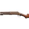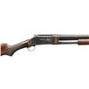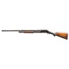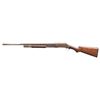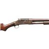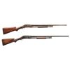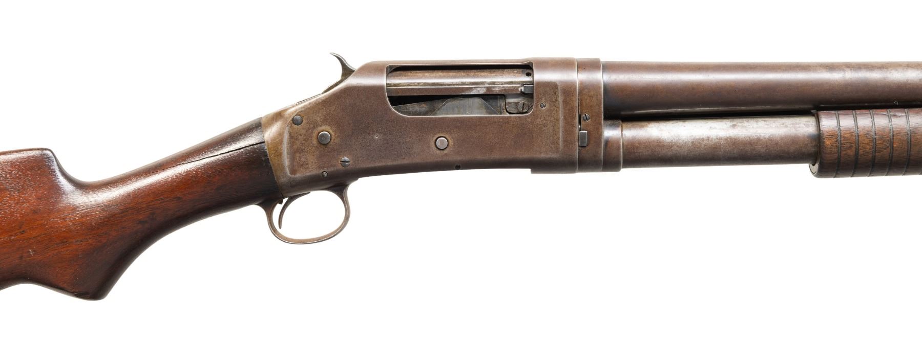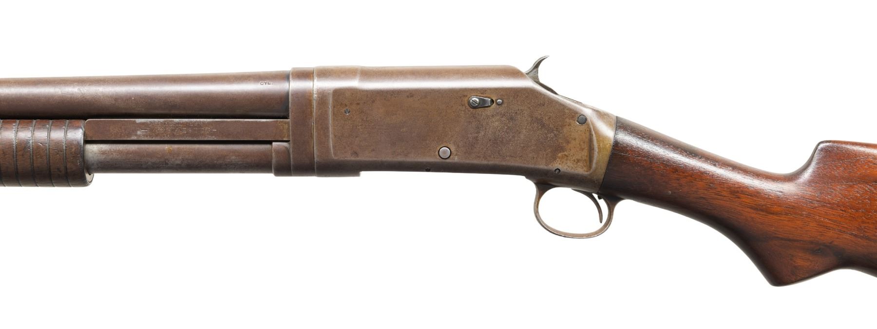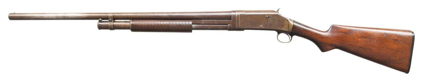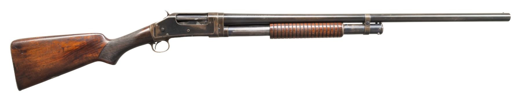 SHOTGUNS. 1) Cal. 12 GA. S# E510042. Bbl. 26". Model 1897 pump action shotgun mfg. by Winchester in 1912. Top of the bbl. is marked with Winchester's 2-line mfg. and patent information, followed by "12 GA.", with a "CYL." choke markings stamped on the left towards the breech. Left side of action slide is marked "MODEL 1897/ -WINCHESTER-". Grooved wood pump with sanded and refinished plain wood pistol grip buttstock and checkered black hard rubber buttplate. Brass bead front sight. Matching numbers are present on the receiver and receiver extension. CONDITION: metal components retain traces of their original factory blue finish, with the balance having faded to a mottled brown patina, exhibiting scattered spots of light surface oxidation and pitting, as well as spots of age related discoloration. Bright bore, exhibiting scattered spots of light surface oxidation and pitting. Proper manual mechanics. Wood furniture shows scattered marks and impressions from handling and storage, with the buttstock exhibiting a large crack on the right side of the wrist, and a small crack on the left. (25-5887/MLW). 2) Cal. 12 GA. S# E837844. Bbl. 28". Model 97 pump action shotgun mfg. by Winchester in 1936. Left side of the bbl. is marked with the model and cal. designations, followed by a "MOD." choke marking, with Winchester's 2-line mfg. and patent information marked on the right. Action slide bar is unmarked. Left side of the receiver is engraved "CLEVELAND, O., MAY 29 - 1933 - 12 GAUGE", featuring light wavy line foliate scroll style motifs on either side of the forward edges, which extend to the trigger guard bow. Metal components exhibit a reapplied blue finish overall. Grooved wood pump and checkered wood pistol grip stock with plain steel buttplate. Underside of buttstock is stamped "B", with a concentric circle inlay present on the bottom of the pistol grip, and an unengraved circular German silver escutcheon inlaid on the toeline. Buttstock appears to have bee lightly sanded and refinished, being shy at the toe of the buttplate. Aluminum bead front sight. Matching numbers are present on the receiver and receiver extension. CONDITION: metal components retain the large amounts to the majority of their reapplied blue finish, exhibiting areas of wear and thinning fading to brown patina, with some scattered spots of light surface oxidation and pitting. Very bright bore, exhibiting some scattered spots of light pitting. Proper manual mechanics. Wood furniture shows scattered marks and minor impressions from handling and storage, but otherwise remains sound. PROVENANCE: From the PMRB Collection. (25-5890/MLW). BOTH CURIO. $600-1,000.