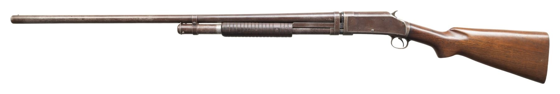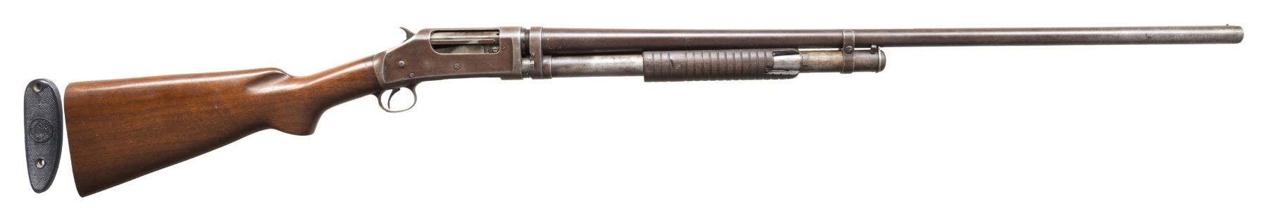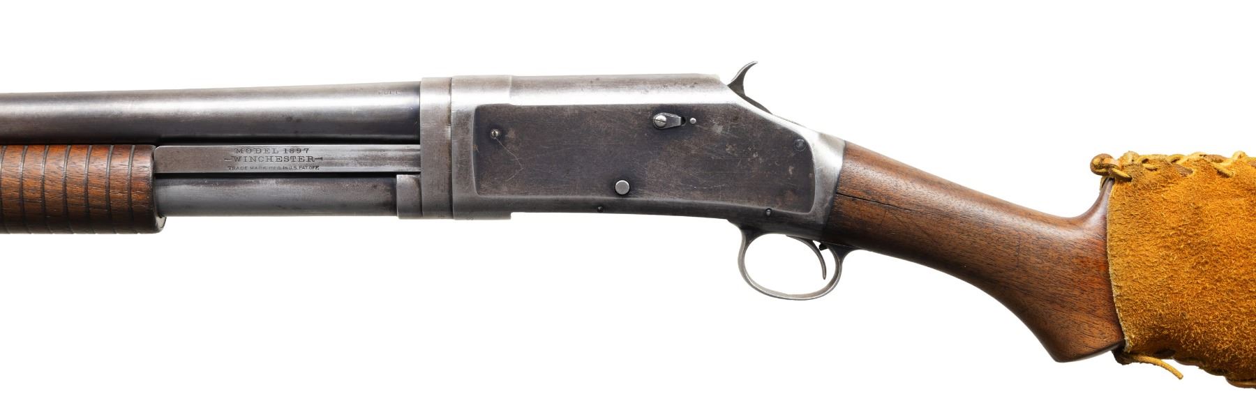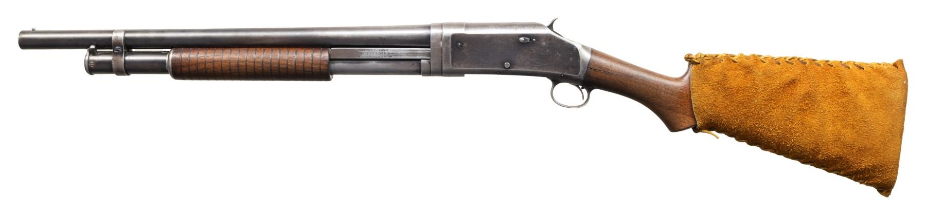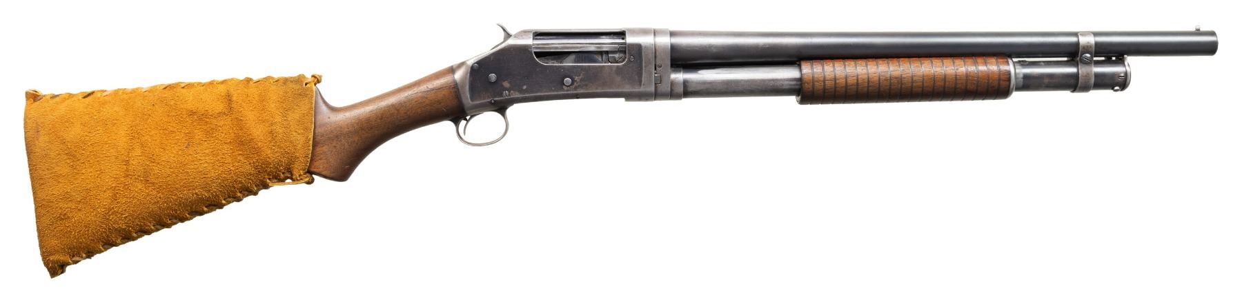 SHOTGUNS. 1) Cal. 12 GA. S# 474533. Bbl. 19". Model 1897 pump action shotgun mfg. by Winchester in 1911 as part of the E Series. Top of the bbl. is marked with Winchester's 2-line mfg. and patent information, followed by "12 GA.", with a "FULL" choke marking present on the left towards the breech. Metal components exhibit a blue finish overall. Grooved wood forearm and plain wood pistol grip buttstock. Buttstock is fitted with a suede and leather lace cover. Aluminum bead front sight. Matching numbers are present on the receiver and receiver extension. CONDITION: metal components retain fair amounts of their original factory blue finish, exhibiting areas of wear and thinning fading to gray patina, scattered marks and scratches, as well as scattered spots and patches of light to mild pitting. Relatively bright bore, exhibiting consistent light to mild pitting throughout. Proper manual mechanics. Wood furniture shows scattered marks and impressions from handling and storage, with the buttstock exhibiting a crack on either side of the wrist, stemming from the receiver. (25-5322/MLW). 2) Cal. 12 GA. S# C62779. Bbl. 32 1/4" (with improperly seated adj. bbl. sleeve). Model 1897 pump action shotgun mfg. by Winchester in 1899. Top of the bbl. is faintly marked with Winchester's 2-line mfg. and patent information, followed by "12" towards the breech. Left side of bbl. is marked with a "FULL" choke marking. Action slide is marked "WINCHESTER/ MODEL 1897". Metal components exhibit a blue finish. 3-screw grooved wood forearm with replacement plain wood pistol grip buttstock and checkered black synthetic Winchester buttplate marked "M97" on the interior. Brass bead front sight. Matching numbers are present on the receiver and receiver extension. CONDITION: metal components have faded to a mottled gray patina, exhibiting scattered spots and patches of light to mild surface oxidation and pitting, as well as scattered superficial marks and scratches. Bore exhibits consistent mild pitting, with scattered spots and patches of moderate pitting. Action cannot be tested until adj. sleeve is properly mounted. Wood furniture shows scattered marks and impressions from handling and storage. Forearm exhibits a crack on the left side, an old repaired full length crack on the underside, as well as a large chip on the right side. Buttstock exhibits a 5" crack on the left side stemming from the receiver. Buttplate is loose, with screws not threading. (25-5791/MLW). BOTH CURIO. $500-800.