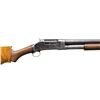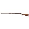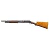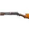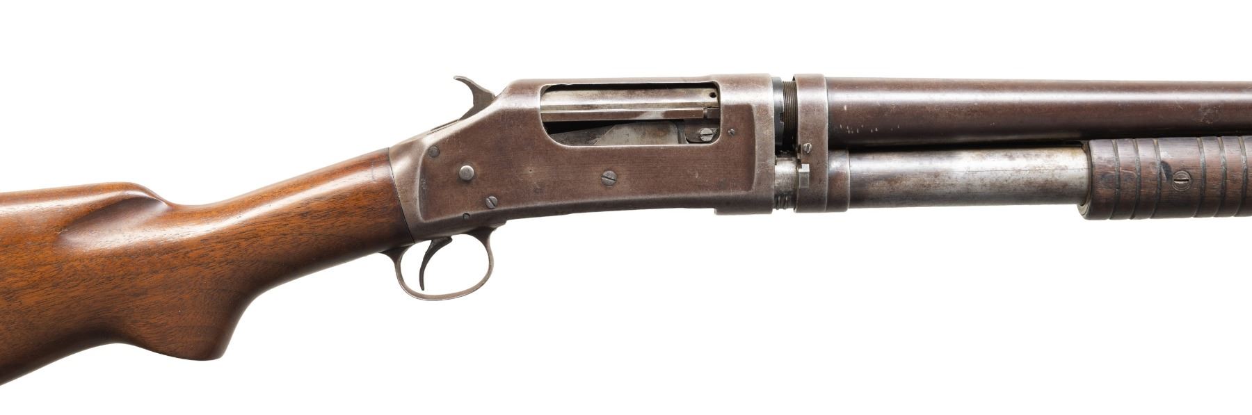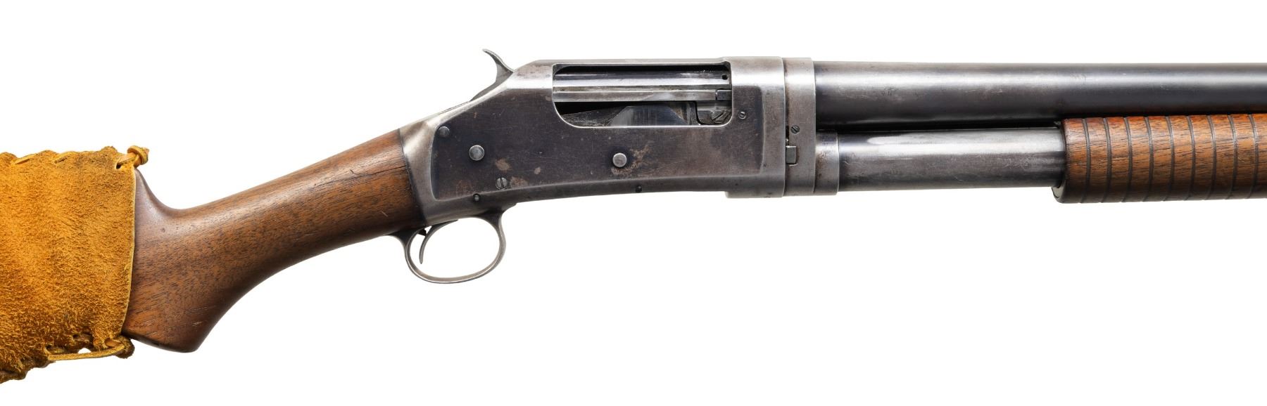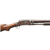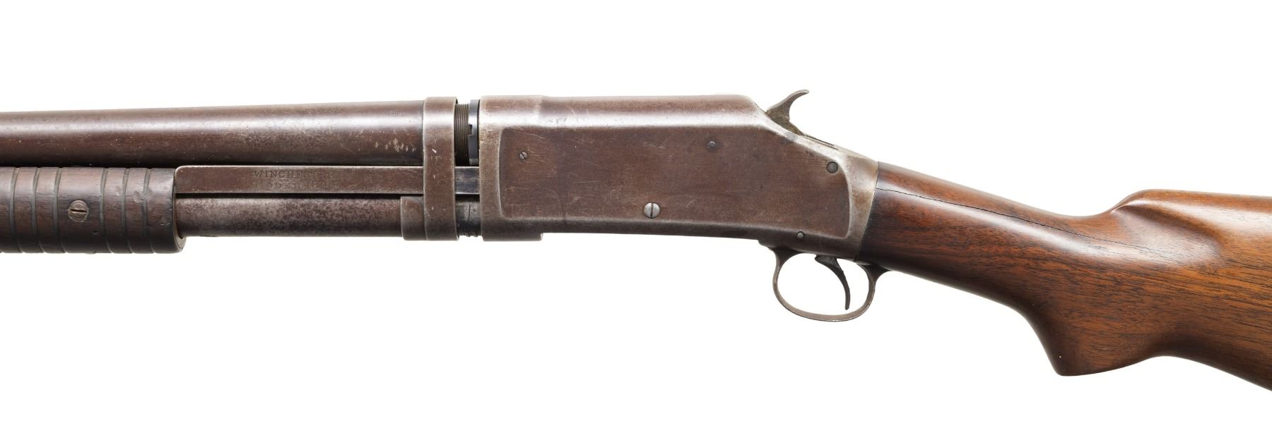 SHOTGUNS. 1) Cal. 12 GA. S# 474533. Bbl. 19". Model 1897 pump action shotgun mfg. by Winchester in 1911 as part of the E Series. Top of the bbl. is marked with Winchester's 2-line mfg. and patent information, followed by "12 GA.", with a "FULL" choke marking present on the left towards the breech. Metal components exhibit a blue finish overall. Grooved wood forearm and plain wood pistol grip buttstock. Buttstock is fitted with a suede and leather lace cover. Aluminum bead front sight. Matching numbers are present on the receiver and receiver extension. CONDITION: metal components retain fair amounts of their original factory blue finish, exhibiting areas of wear and thinning fading to gray patina, scattered marks and scratches, as well as scattered spots and patches of light to mild pitting. Relatively bright bore, exhibiting consistent light to mild pitting throughout. Proper manual mechanics. Wood furniture shows scattered marks and impressions from handling and storage, with the buttstock exhibiting a crack on either side of the wrist, stemming from the receiver. (25-5322/MLW). 2) Cal. 12 GA. S# C62779. Bbl. 32 1/4" (with improperly seated adj. bbl. sleeve). Model 1897 pump action shotgun mfg. by Winchester in 1899. Top of the bbl. is faintly marked with Winchester's 2-line mfg. and patent information, followed by "12" towards the breech. Left side of bbl. is marked with a "FULL" choke marking. Action slide is marked "WINCHESTER/ MODEL 1897". Metal components exhibit a blue finish. 3-screw grooved wood forearm with replacement plain wood pistol grip buttstock and checkered black synthetic Winchester buttplate marked "M97" on the interior. Brass bead front sight. Matching numbers are present on the receiver and receiver extension. CONDITION: metal components have faded to a mottled gray patina, exhibiting scattered spots and patches of light to mild surface oxidation and pitting, as well as scattered superficial marks and scratches. Bore exhibits consistent mild pitting, with scattered spots and patches of moderate pitting. Action cannot be tested until adj. sleeve is properly mounted. Wood furniture shows scattered marks and impressions from handling and storage. Forearm exhibits a crack on the left side, an old repaired full length crack on the underside, as well as a large chip on the right side. Buttstock exhibits a 5" crack on the left side stemming from the receiver. Buttplate is loose, with screws not threading. (25-5791/MLW). BOTH CURIO. $500-800.