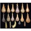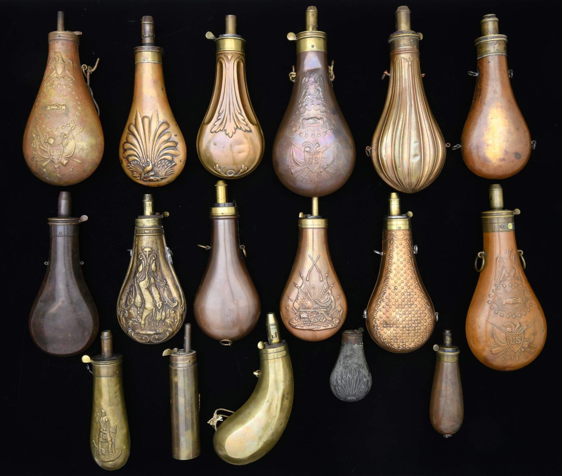 Lot of 28 assorted powder flasks. Flasks are comprised of brass, are from a variety of mfgs., and vintages, and feature an assortment of embellishments. CONDITION: flasks exhibit varying patinas that range from mellow to dark brown overall. (02-23099/MLW). $800-1,600.