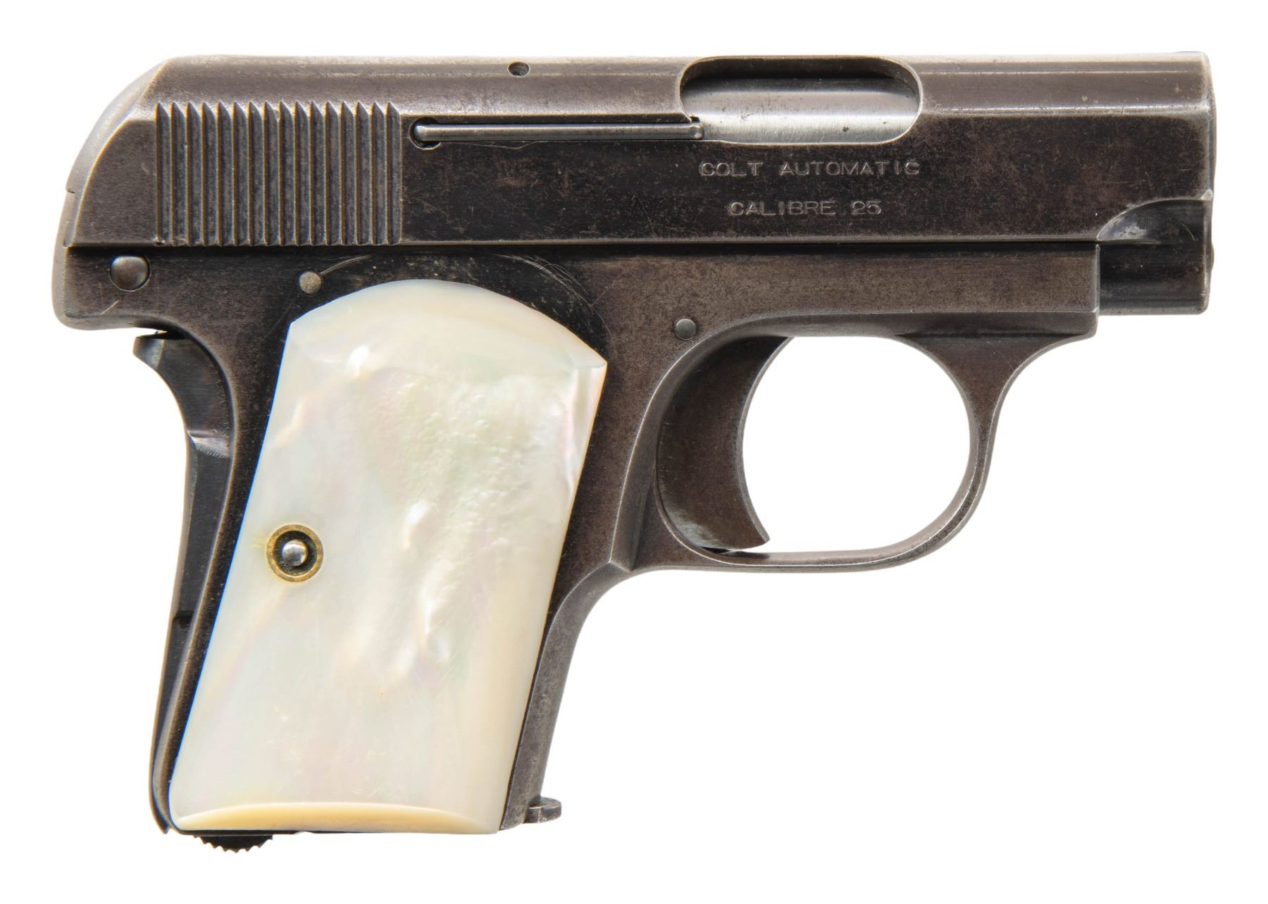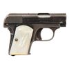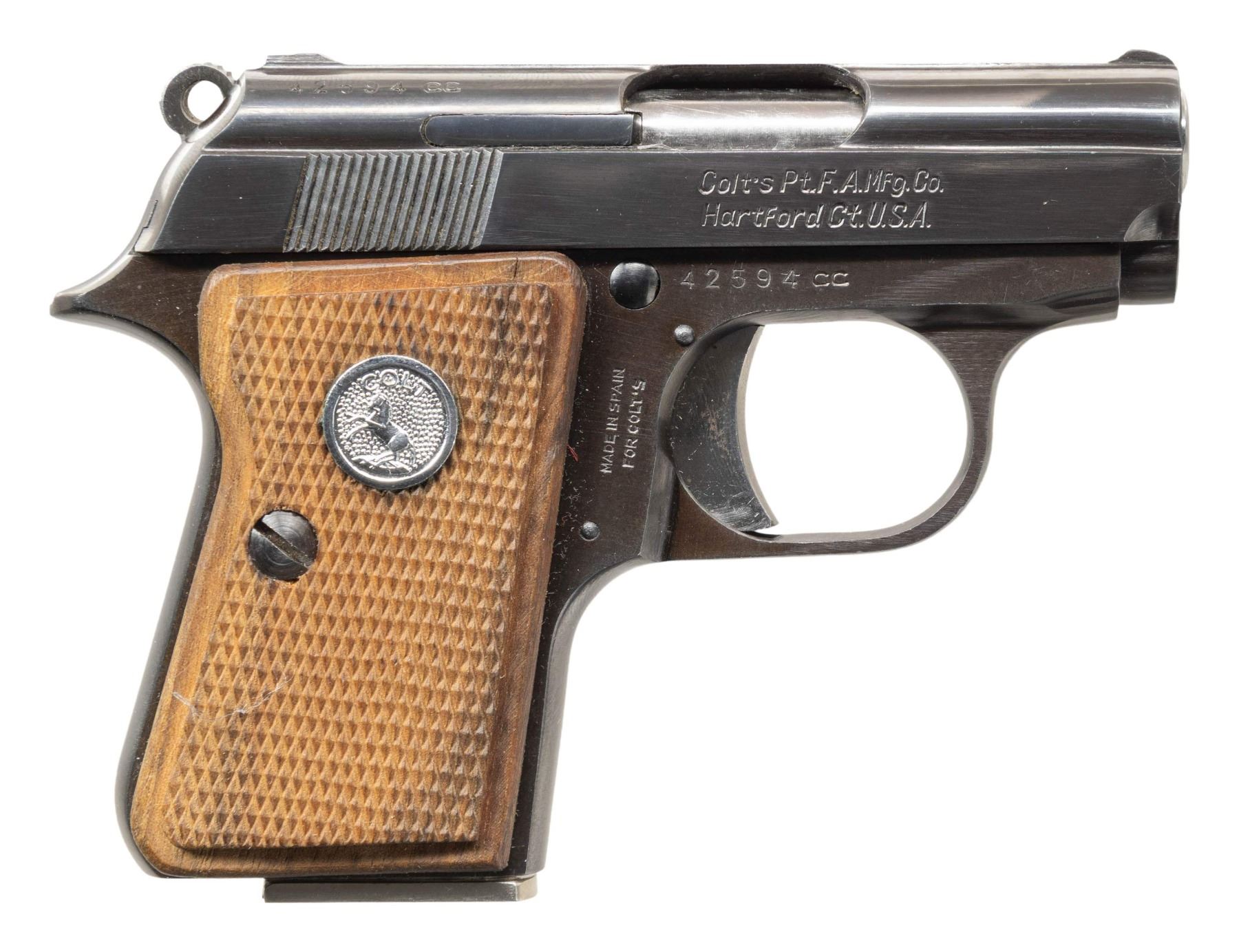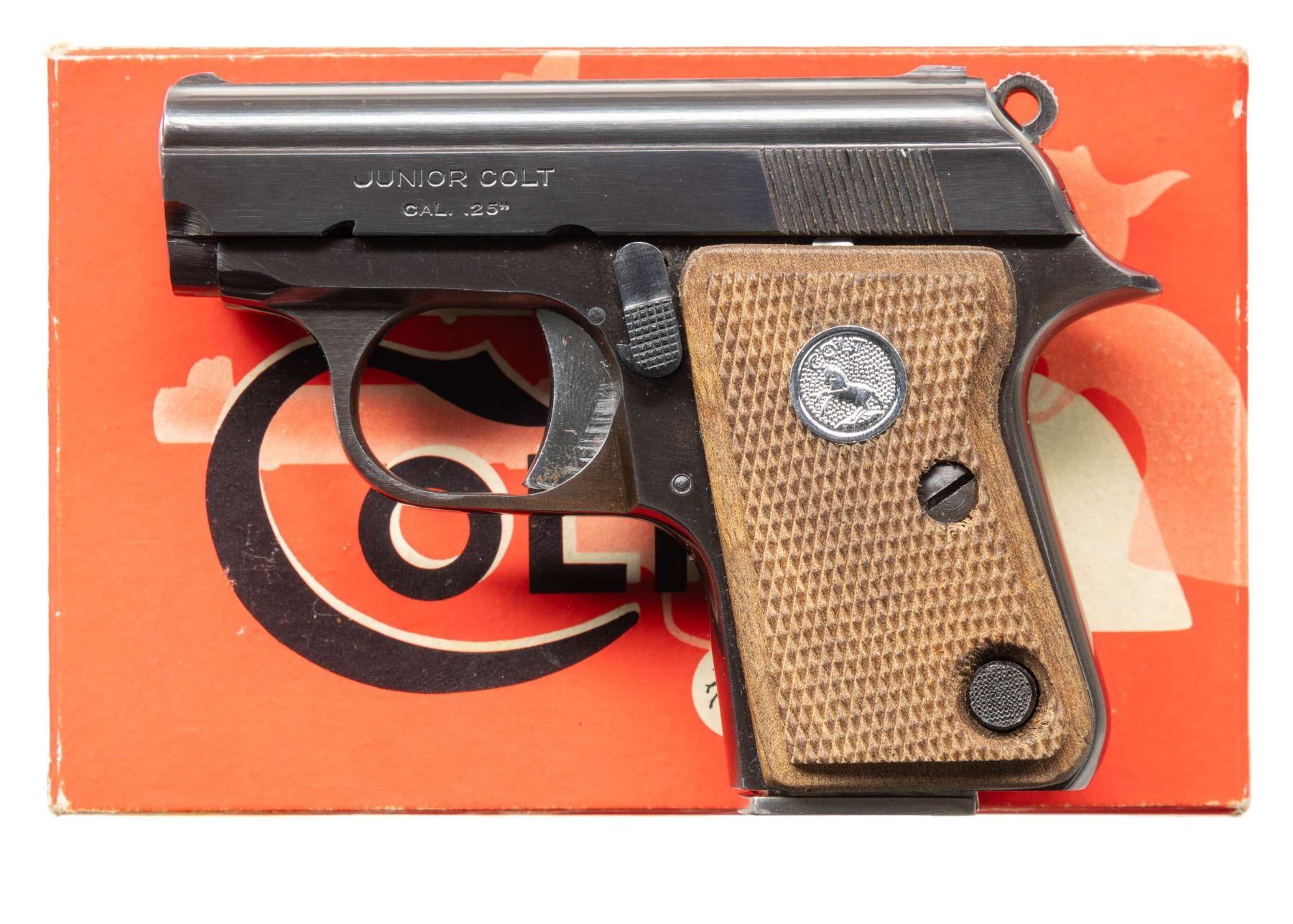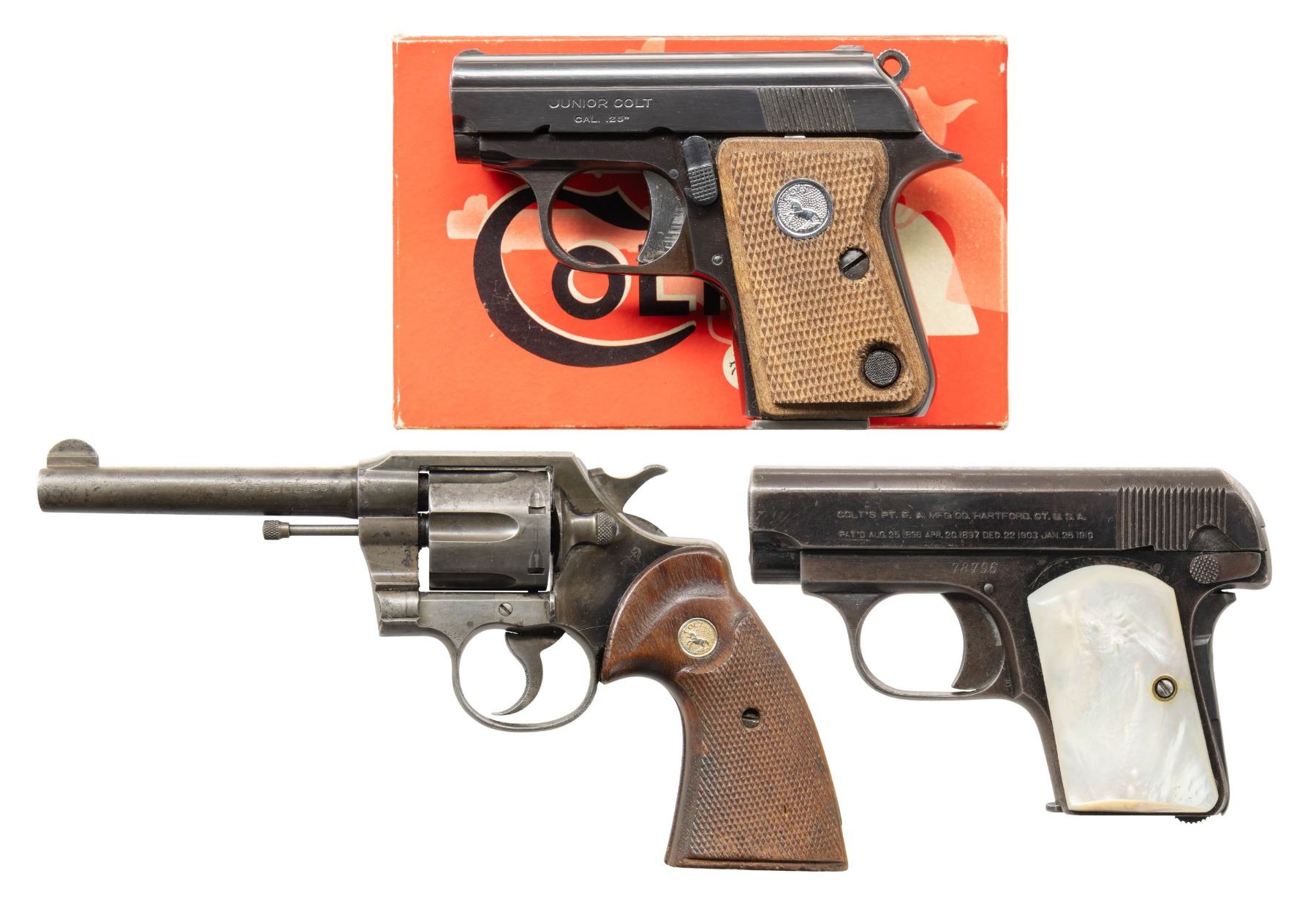 1) COLT "JUNIOR COLT" SEMI-AUTOMATIC PISTOL WITH MATCHING FACTORY BOX. Cal. 25 ACP. S# 42594cc. Bbl. 2 3/16". Junior Colt semi-automatic pistol mfg. in Spain and retailed by Colt in 1966. Left side of the slide is marked "JUNIOR COLT/ CAL. .25", with Colt's 2-line address marked on the right. Right side of the frame is marked with the S# above "MADE IN SPAIN/ FOR COLT'S". Metal components exhibit a blue finish overall, save for on the trigger and hammer, which are plated. Bbl. is polished in-the-white. Frame is mounted with 2-piece Colt silver medallion checkered wood grips. Integral blade front sight and square notch rear sight. All serialized parts are matching and include the frame, slide, and bbl. MAGS: x2 plated 7-rd. mags. UNATTACHED ACCESSORIES: matching factory box with original plain cardboard sleeve. CONDITION: fine, with metal components retaining the vast majority of their original factory blue finish, showing a few superficial handling marks overall. Plated trigger and hammer exhibit a few spots of light surface oxidation. Bore retains a thick layer of apparent factory grease, showing no indication of prior use. Proper manual mechanics. Grips are excellent. Box shows light exterior wear, with the sleeve showing age related discoloration. (25-5362/MLW). CURIO. 2) COLT MODEL 1908 VEST POCKET SEMI-AUTOMATIC PISTOL. Cal. 25 ACP. S# 78796. Bbl. 2 1/8". Model 1908 Vest Pocket semi-automatic pistol mfg. by Colt in 1912. Left side of the frame is marked with Colt's 2-line mfg. and patent information, with "COLT AUTOMATIC/ CALIBRE 25" marked on the right. Metal components exhibit a blue finish overall, save for on the bbl., which is polished in-the-white. Grip safety has been reblued at one time. Frame is mounted with 2-piece pearl grips. Slide features a grooved sight channel with an integral blade front sight and square notch rear sight. MAGS: 1 6-rd. CONDITION: metal components retain fair to good amounts of their original factory blue finish, exhibiting areas of wear fading to gray patina, with light to mild surface oxidation and pitting present overall. Bore is bright, exhibiting consistent light pitting, while retaining strong rifling throughout. Proper manual mechanics. Grips show some superficial handling marks, but otherwise remain very good overall. (25-5425/MLW). CURIO. 3) COLT OFFICIAL POLICE DOUBLE ACTION REVOLVER. Cal. 38 Spl. S# 593020. Bbl. 4 7/8". Official Police double action revolver mfg. by Colt in 1935. Left side of the bbl. is marked "COLT", followed by "OFFICIAL/ POLICE" and "38" with Colt's 2-line mfg. and patent information marked across the top. Left side of the frame is marked with the Rampant Colt logo. Metal components exhibit a blue finish overall. Frame is mounted with later production Colt gold medallion checkered wood grips. Standard fixed half-moon blade front sight and square frame notched rear sight. CONDITION: metal components retain traces of their original blue finish, exhibiting wear and thinning that is fading to gray patina, with scattered spots, patches, and areas of light to mild pitting overall. Mirror bore, exhibiting streaks of grease, while retaining well defined rifling throughout. Proper manual mechanics. Grips show mild smoothing, as well as scattered marks and impressions from handling and storage, but otherwise remain sound. (25-5457/MLW). CURIO. $800-1,300.