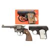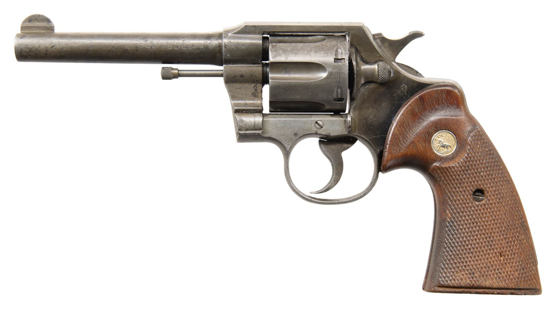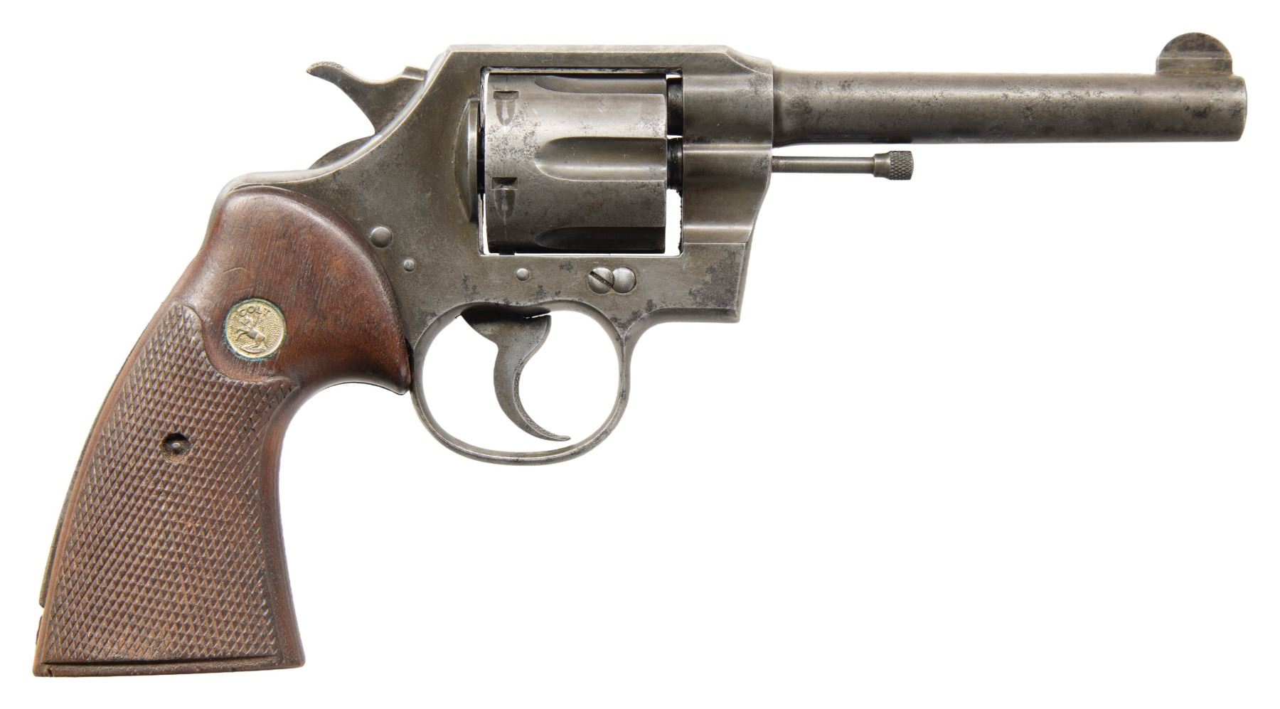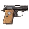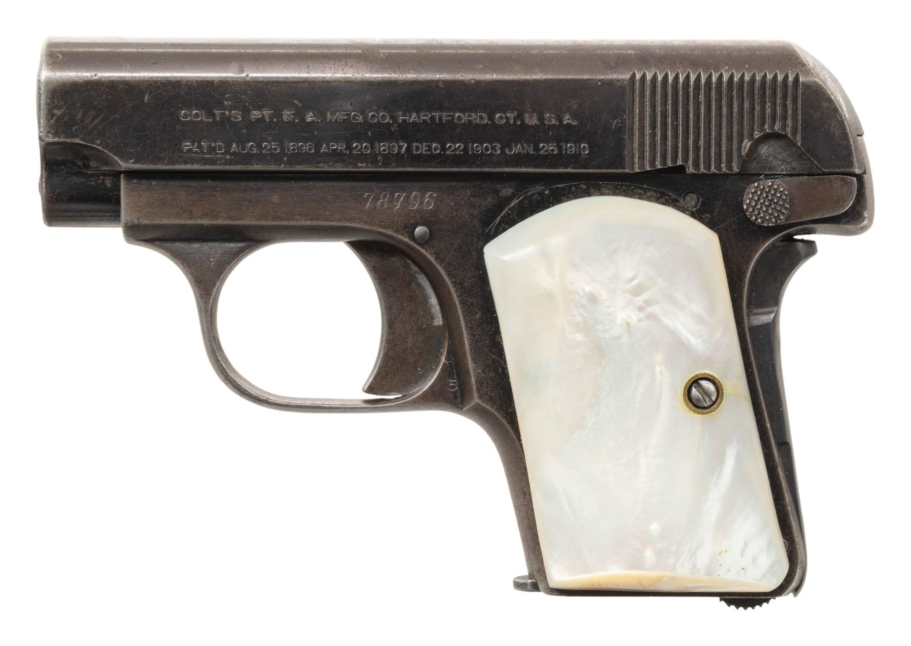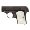 1) COLT "JUNIOR COLT" SEMI-AUTOMATIC PISTOL WITH MATCHING FACTORY BOX. Cal. 25 ACP. S# 42594cc. Bbl. 2 3/16". Junior Colt semi-automatic pistol mfg. in Spain and retailed by Colt in 1966. Left side of the slide is marked "JUNIOR COLT/ CAL. .25", with Colt's 2-line address marked on the right. Right side of the frame is marked with the S# above "MADE IN SPAIN/ FOR COLT'S". Metal components exhibit a blue finish overall, save for on the trigger and hammer, which are plated. Bbl. is polished in-the-white. Frame is mounted with 2-piece Colt silver medallion checkered wood grips. Integral blade front sight and square notch rear sight. All serialized parts are matching and include the frame, slide, and bbl. MAGS: x2 plated 7-rd. mags. UNATTACHED ACCESSORIES: matching factory box with original plain cardboard sleeve. CONDITION: fine, with metal components retaining the vast majority of their original factory blue finish, showing a few superficial handling marks overall. Plated trigger and hammer exhibit a few spots of light surface oxidation. Bore retains a thick layer of apparent factory grease, showing no indication of prior use. Proper manual mechanics. Grips are excellent. Box shows light exterior wear, with the sleeve showing age related discoloration. (25-5362/MLW). CURIO. 2) COLT MODEL 1908 VEST POCKET SEMI-AUTOMATIC PISTOL. Cal. 25 ACP. S# 78796. Bbl. 2 1/8". Model 1908 Vest Pocket semi-automatic pistol mfg. by Colt in 1912. Left side of the frame is marked with Colt's 2-line mfg. and patent information, with "COLT AUTOMATIC/ CALIBRE 25" marked on the right. Metal components exhibit a blue finish overall, save for on the bbl., which is polished in-the-white. Grip safety has been reblued at one time. Frame is mounted with 2-piece pearl grips. Slide features a grooved sight channel with an integral blade front sight and square notch rear sight. MAGS: 1 6-rd. CONDITION: metal components retain fair to good amounts of their original factory blue finish, exhibiting areas of wear fading to gray patina, with light to mild surface oxidation and pitting present overall. Bore is bright, exhibiting consistent light pitting, while retaining strong rifling throughout. Proper manual mechanics. Grips show some superficial handling marks, but otherwise remain very good overall. (25-5425/MLW). CURIO. 3) COLT OFFICIAL POLICE DOUBLE ACTION REVOLVER. Cal. 38 Spl. S# 593020. Bbl. 4 7/8". Official Police double action revolver mfg. by Colt in 1935. Left side of the bbl. is marked "COLT", followed by "OFFICIAL/ POLICE" and "38" with Colt's 2-line mfg. and patent information marked across the top. Left side of the frame is marked with the Rampant Colt logo. Metal components exhibit a blue finish overall. Frame is mounted with later production Colt gold medallion checkered wood grips. Standard fixed half-moon blade front sight and square frame notched rear sight. CONDITION: metal components retain traces of their original blue finish, exhibiting wear and thinning that is fading to gray patina, with scattered spots, patches, and areas of light to mild pitting overall. Mirror bore, exhibiting streaks of grease, while retaining well defined rifling throughout. Proper manual mechanics. Grips show mild smoothing, as well as scattered marks and impressions from handling and storage, but otherwise remain sound. (25-5457/MLW). CURIO. $800-1,300.