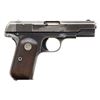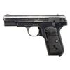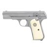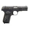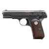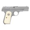 SEMI-AUTOMATIC PISTOLS. 1) COLT MODEL 1908 HAMMERLESS SEMI-AUTOMATIC PISTOL. Cal. 380 ACP. S# 91185. Bbl. 3 3/4". Model 1908 Hammerless semi-automatic pistol mfg. by Colt in 1928. Left side of the slide is marked with Colt's 2-line mfg. and patent information, followed by the Rampant Colt logo, with "COLT AUTOMATIC/ CALIBRE .380 HAMMERLESS" marked on the right. Metal components exhibit a blue finish overall, save for on the muzzle and chamber areas of the bbl., which are polished in-the-white. Frame is mounted with 2-piece Colt silver medallion checkered wood grips. Standard fixed half-moon blade front sight and dovetailed U-notch rear sight. Slide matches the frame via the full S# on the interior. MAGS: x1 dual-tone 7-rd. CONDITION: metal components retain large amounts of their original factory blue finish, exhibiting areas of wear and thinning that have faded to gray patina, with scattered spots and small patches of light surface oxidation and pitting overall. Bore is bright, exhibiting a consistent scattering of light to mild surface oxidation and pitting, while retaining good rifling throughout. Proper manual mechanics. Grips show heavy smoothing, as well as scattered marks and impressions from handling and storage, but otherwise remain sound. (25-5386/MLW). 2) COLT MODEL 1903 HAMMERLESS SEMI-AUTOMATIC PISTOL. Cal. 32 Rimless. S# 280801. Bbl. 3 3/4". Model 1903 Hammerless semi-automatic pistol mfg. by Colt in 1918. Left side of the slide is marked with Colt's patent and mfg. information, followed by the Rampant Colt logo, with "COLT AUTOMATIC/ CALIBRE 32 RIMLESS SMOKELESS" marked on the right. Metal components exhibit a blue finish overall, save for on the bbl., which is polished in-the-white. Frame is mounted with 2-piece "COLT" checkered brown hard rubber grips. Standard fixed half-moon blade front sight and dovetailed U-notch rear sight. Slide matches the frame via "801" on the interior. MAGS: x1 dual-tone 8-rd. CONDITION: metal components retain large amounts of their original factory blue finish, exhibiting areas and patches of wear fading to gray patina, with scattered spots of mild pitting present overall. Very bright bore, exhibiting consistent light pitting, while retaining good rifling throughout. Proper manual mechanics. Grips show light to mild smoothing and some superficial handling marks, with the left grip exhibiting a large chip at the upper left section of the panel. (25-5396/MLW). 3) COLT MODEL 1903 HAMMERLESS SEMI-AUTOMATIC PISTOL. Cal. 32 Rimless. S# 540693. Bbl. 3 3/4". Model 1903 Hammerless semi-automatic pistol mfg. by Colt in 1940. Left side of the slide is marked with Colt's 2-line mfg. and patent information (Rampant Colt logo obliterated), with "COLT AUTOMATIC/ CALIBRE 32 RIMLESS SMOKELESS" marked on the right. Metal components exhibit a reapplied nickel plated finish overall, save for on the bbl., which is blued, as well as polished in-the-white at the muzzle and chamber areas. Frame is mounted with 2-piece Ajax aftermarket Colt silver medallion faux ivory grips. Standard fixed blade front sight and dovetailed square notch rear sight. Slide matches the frame via the full S# on the interior. MAGS: x1 reapplied nickel plated 8-rd. CONDITION: metal components retain the majority of their reapplied nickel finish, showing scattered spots and patches of flaking that show through to gray patina, with scattered patches of mild to moderate pitting. Relatively bright bore, exhibiting consistent light to mild pitting, while retaining good rifling throughout. Proper manual mechanics. Grips show some superficial handling marks, but otherwise remain sound. Interior of right grip panel is chipped around the screw slot, with a previous glued repair having broken free. (25-5410/MLW). ALL CURIO. $850-1,300.