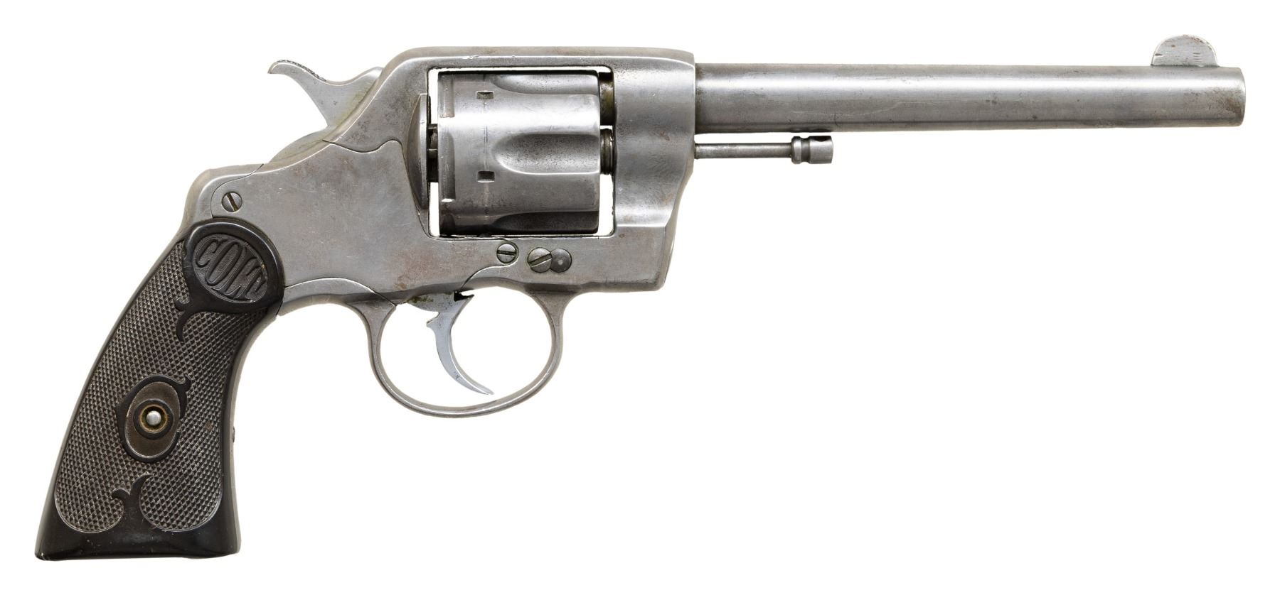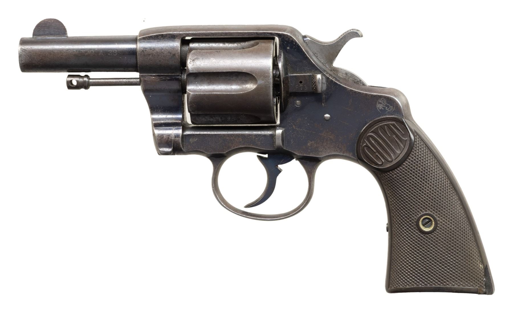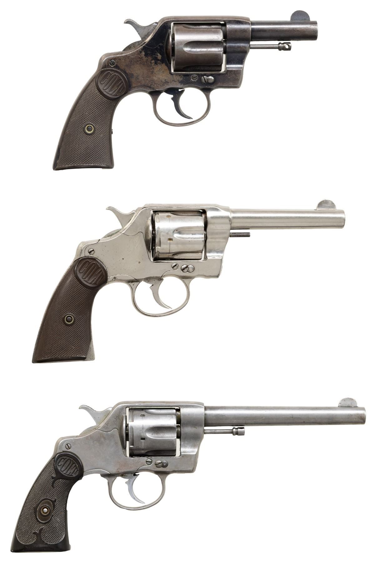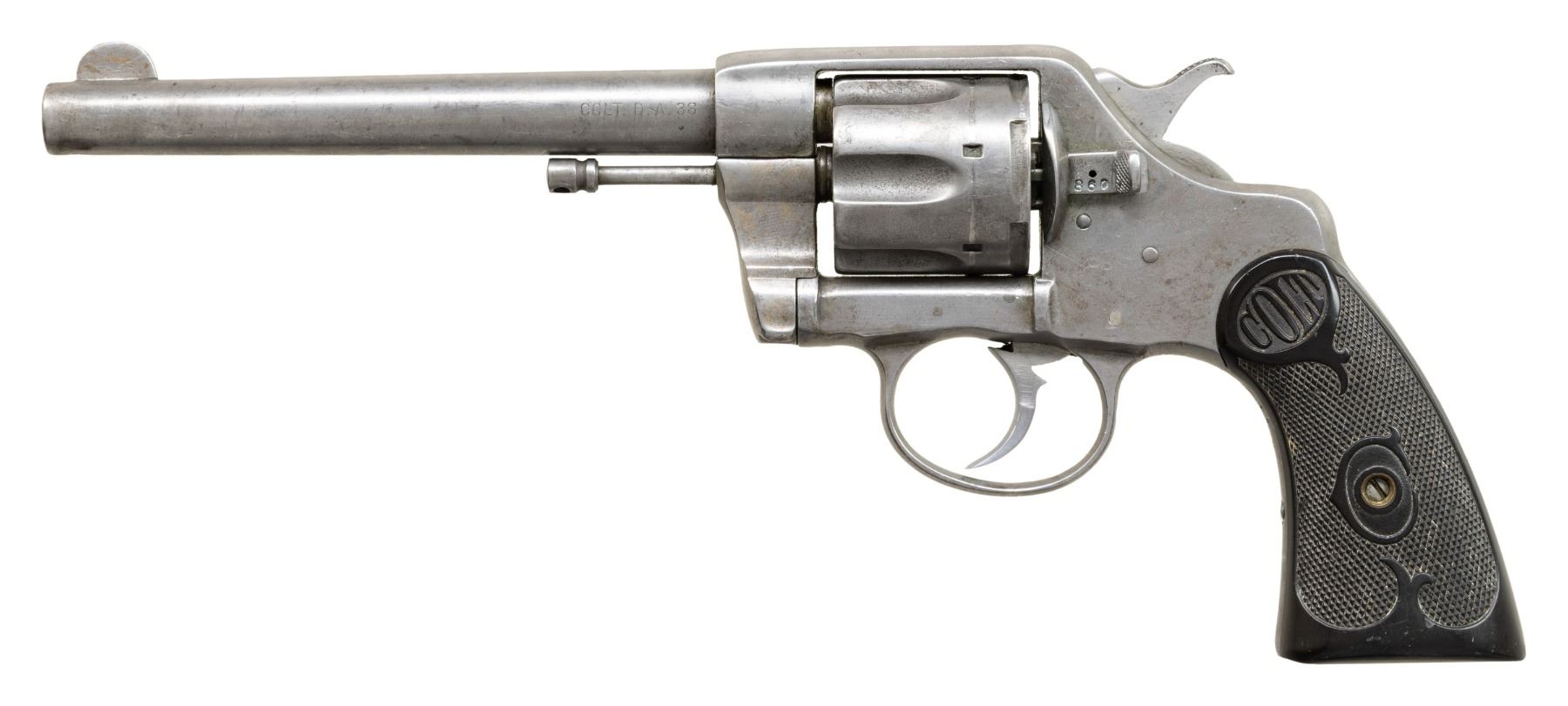 REVOLVERS. 1) Cal. 38 Colt. S# 31586. Bbl. 3". New Army / Navy double action revolver mfg. by Colt in 1895. Left side of the bbl. is marked "COLT D.A. 38", with Colt's 3-line mfg. and patent information marked across the top. Left side of the frame is marked with the encircled Rampant Colt logo. Metal components exhibit a blue finish overall, with the trigger and top strap of the hammer exhibiting a nitre blue finish. Sides of the hammer are polished in-the-white. Frame is mounted with 2-piece "COLT" Navy pattern checkered brown hard rubber grips. Standard fixed half-moon blade front sight and frame U-notched rear sight. Matching assembly # "875" is present on the frame, cyl. crane, and cyl. latch, with "875" also inscribed on the interior of the grips. CONDITION: metal components retain fair to good amounts of their original factory blue finish, exhibiting areas of wear and thinning fading to gray patina, with scattered spots and patches of light to moderate surface oxidation and pitting overall. Relatively bright bore, exhibiting scattered spots and small patches of moderate pitting, while retaining strong rifling throughout. Proper manual mechanics, with some cyl. play. Grips show light to mild smoothing and scattered superficial handling marks, with a large chip present on either panel at the bottom of the rear grip strap. (01-28905/MLW). ANTIQUE. 2) Cal. 38 Spl. S# 260264. Bbl. 4 1/2". New Army / Navy double action revolver mfg. by Colt in 1906 and later converted to .38 Special. Original markings have been obliterated, save for traces of the encircled Rampant Colt logo on the left side of the frame and the S# on the butt. Metal components exhibit a reapplied nickel plated finish overall. Frame is mounted with 2-piece "COLT" Navy pattern checkered brown hard rubber grips. Standard fixed half-moon blade front sight and frame U-notched rear sight. Matching assembly # "198" is present on the frame, and is inscribed on the interior of the grips. Cyl. crane assembly # is mismatched via "1009". CONDITION: metal components retain the majority of their reapplied nickel plated finish, showing some flaking and small spots of oxidation overall. Relatively bright bore, exhibiting scattered spots and patches of mild to moderate pitting, while retaining good to strong rifling throughout. Action does not function in DA, with the trigger getting stuck in the rearward position and with the cyl. pushing past the latch in DA mode. Firing pin on hammer has broken and does not protrude through the frame. Left side of the frame exhibits 3 added holes, 1 also going through the cyl. latch. Bbl. is blown out at the chamber area. Cyl. ejector rod head is absent, with threaded section having been removed. Ejector ratchet is improperly seated, blocking the cyl. from being loaded. Grips show mild smoothing, as well as scattered marks from handling and storage, with 1 chip on the base on the left panel, and 2 chips on the base of the right. (25-5399/MLW). CURIO. 3) Cal. 38 Colt. S# 194204. Bbl. 6". New Army / Navy double action revolver mfg. by Colt in 1903. Left side of the bbl. is marked "COLT. D.A. 38", with Colt's 2-line mfg. and patent information marked across the top. Left side of the frame is marked with a partially visible encircled Rampant Colt logo. Frame is mounted with 2-piece "COLT" checkered brown hard rubber grips. Standard fixed half-moon blade front sight and frame U-notched rear sight. Matching assembly # "860" is present on the frame, cyl. crane, and cyl. latch. CONDITION: metal components have been cleaned, exhibiting a dull gray patina, with areas of light pitting present overall. Relatively bright bore, exhibiting scattered spots and patches of mild to moderate pitting, while retaining strong rifling throughout. Proper manual mechanics, with significant cyl. play. Grips show some mild smoothing and scattered superficial handling marks, with the right panel exhibiting a small chip at the rear edge of the back strap. (25-5403/MLW). CURIO. $700-1,200.