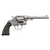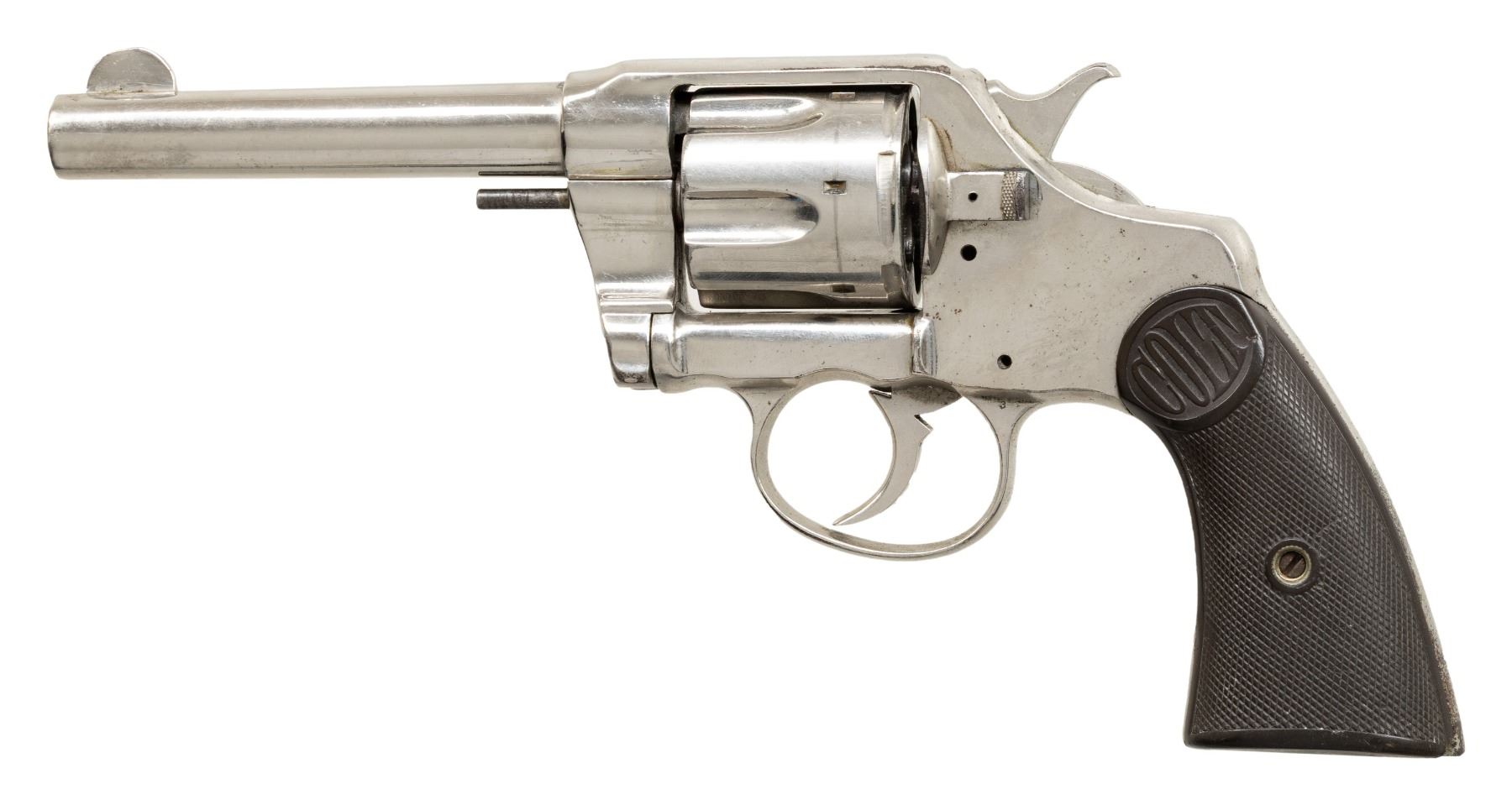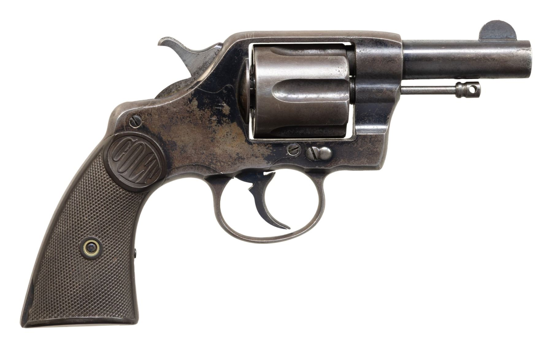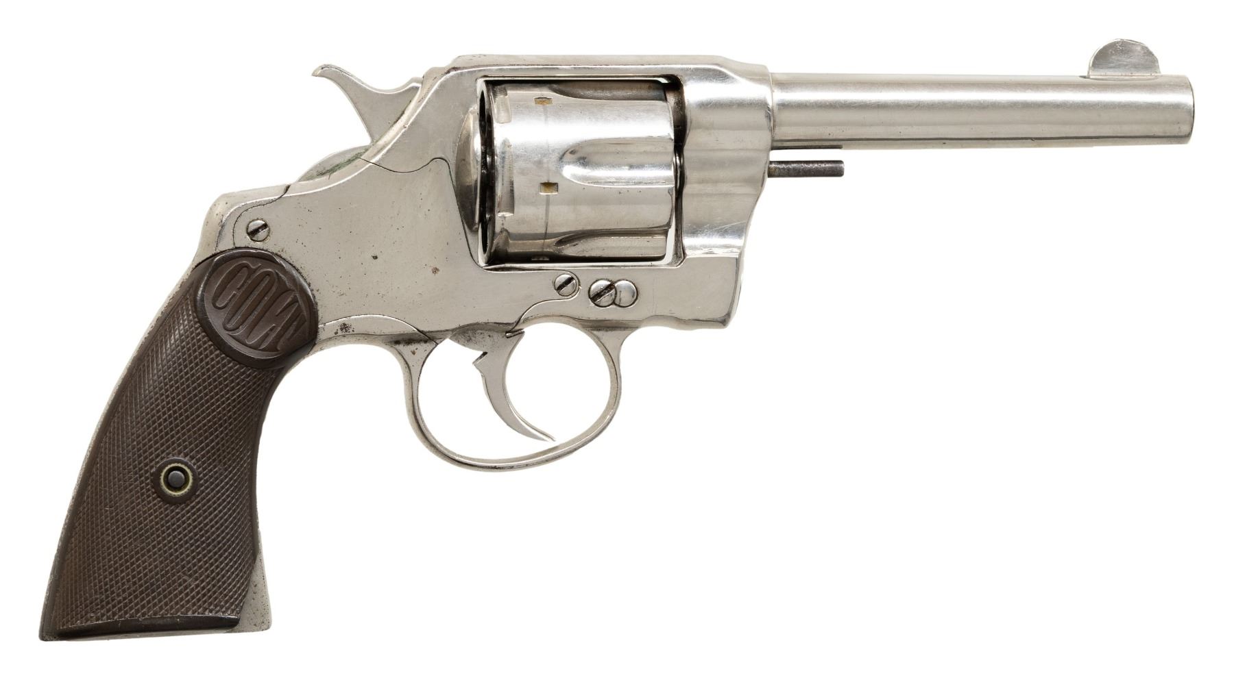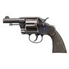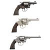 REVOLVERS. 1) Cal. 38 Colt. S# 31586. Bbl. 3". New Army / Navy double action revolver mfg. by Colt in 1895. Left side of the bbl. is marked "COLT D.A. 38", with Colt's 3-line mfg. and patent information marked across the top. Left side of the frame is marked with the encircled Rampant Colt logo. Metal components exhibit a blue finish overall, with the trigger and top strap of the hammer exhibiting a nitre blue finish. Sides of the hammer are polished in-the-white. Frame is mounted with 2-piece "COLT" Navy pattern checkered brown hard rubber grips. Standard fixed half-moon blade front sight and frame U-notched rear sight. Matching assembly # "875" is present on the frame, cyl. crane, and cyl. latch, with "875" also inscribed on the interior of the grips. CONDITION: metal components retain fair to good amounts of their original factory blue finish, exhibiting areas of wear and thinning fading to gray patina, with scattered spots and patches of light to moderate surface oxidation and pitting overall. Relatively bright bore, exhibiting scattered spots and small patches of moderate pitting, while retaining strong rifling throughout. Proper manual mechanics, with some cyl. play. Grips show light to mild smoothing and scattered superficial handling marks, with a large chip present on either panel at the bottom of the rear grip strap. (01-28905/MLW). ANTIQUE. 2) Cal. 38 Spl. S# 260264. Bbl. 4 1/2". New Army / Navy double action revolver mfg. by Colt in 1906 and later converted to .38 Special. Original markings have been obliterated, save for traces of the encircled Rampant Colt logo on the left side of the frame and the S# on the butt. Metal components exhibit a reapplied nickel plated finish overall. Frame is mounted with 2-piece "COLT" Navy pattern checkered brown hard rubber grips. Standard fixed half-moon blade front sight and frame U-notched rear sight. Matching assembly # "198" is present on the frame, and is inscribed on the interior of the grips. Cyl. crane assembly # is mismatched via "1009". CONDITION: metal components retain the majority of their reapplied nickel plated finish, showing some flaking and small spots of oxidation overall. Relatively bright bore, exhibiting scattered spots and patches of mild to moderate pitting, while retaining good to strong rifling throughout. Action does not function in DA, with the trigger getting stuck in the rearward position and with the cyl. pushing past the latch in DA mode. Firing pin on hammer has broken and does not protrude through the frame. Left side of the frame exhibits 3 added holes, 1 also going through the cyl. latch. Bbl. is blown out at the chamber area. Cyl. ejector rod head is absent, with threaded section having been removed. Ejector ratchet is improperly seated, blocking the cyl. from being loaded. Grips show mild smoothing, as well as scattered marks from handling and storage, with 1 chip on the base on the left panel, and 2 chips on the base of the right. (25-5399/MLW). CURIO. 3) Cal. 38 Colt. S# 194204. Bbl. 6". New Army / Navy double action revolver mfg. by Colt in 1903. Left side of the bbl. is marked "COLT. D.A. 38", with Colt's 2-line mfg. and patent information marked across the top. Left side of the frame is marked with a partially visible encircled Rampant Colt logo. Frame is mounted with 2-piece "COLT" checkered brown hard rubber grips. Standard fixed half-moon blade front sight and frame U-notched rear sight. Matching assembly # "860" is present on the frame, cyl. crane, and cyl. latch. CONDITION: metal components have been cleaned, exhibiting a dull gray patina, with areas of light pitting present overall. Relatively bright bore, exhibiting scattered spots and patches of mild to moderate pitting, while retaining strong rifling throughout. Proper manual mechanics, with significant cyl. play. Grips show some mild smoothing and scattered superficial handling marks, with the right panel exhibiting a small chip at the rear edge of the back strap. (25-5403/MLW). CURIO. $700-1,200.