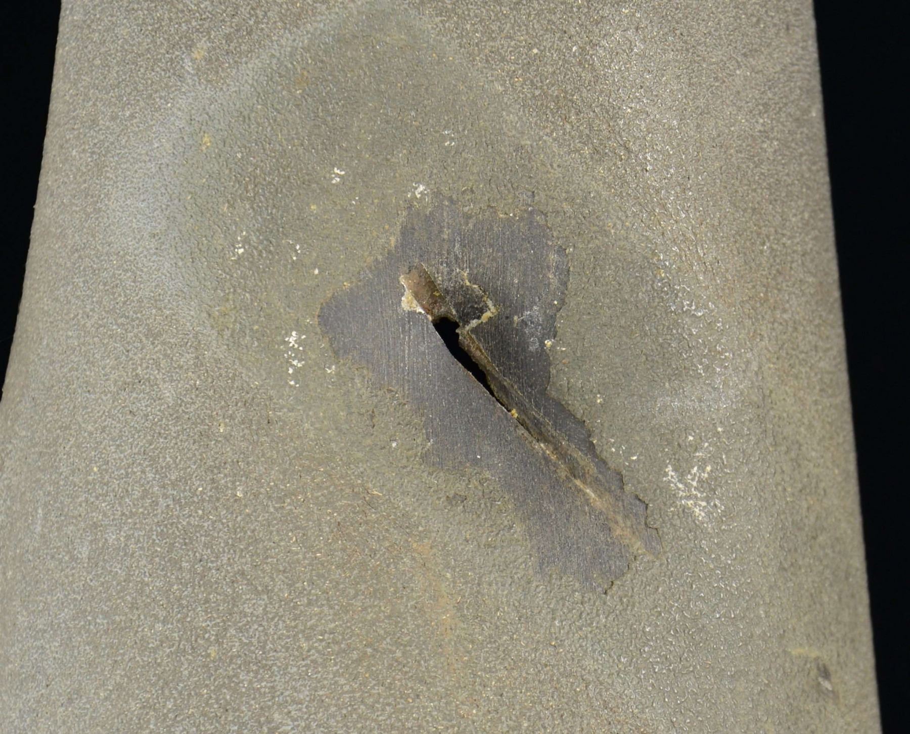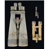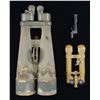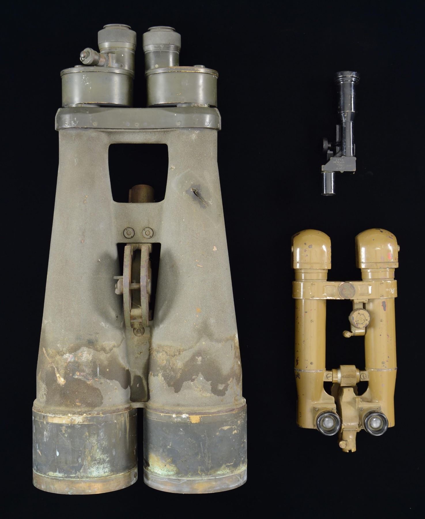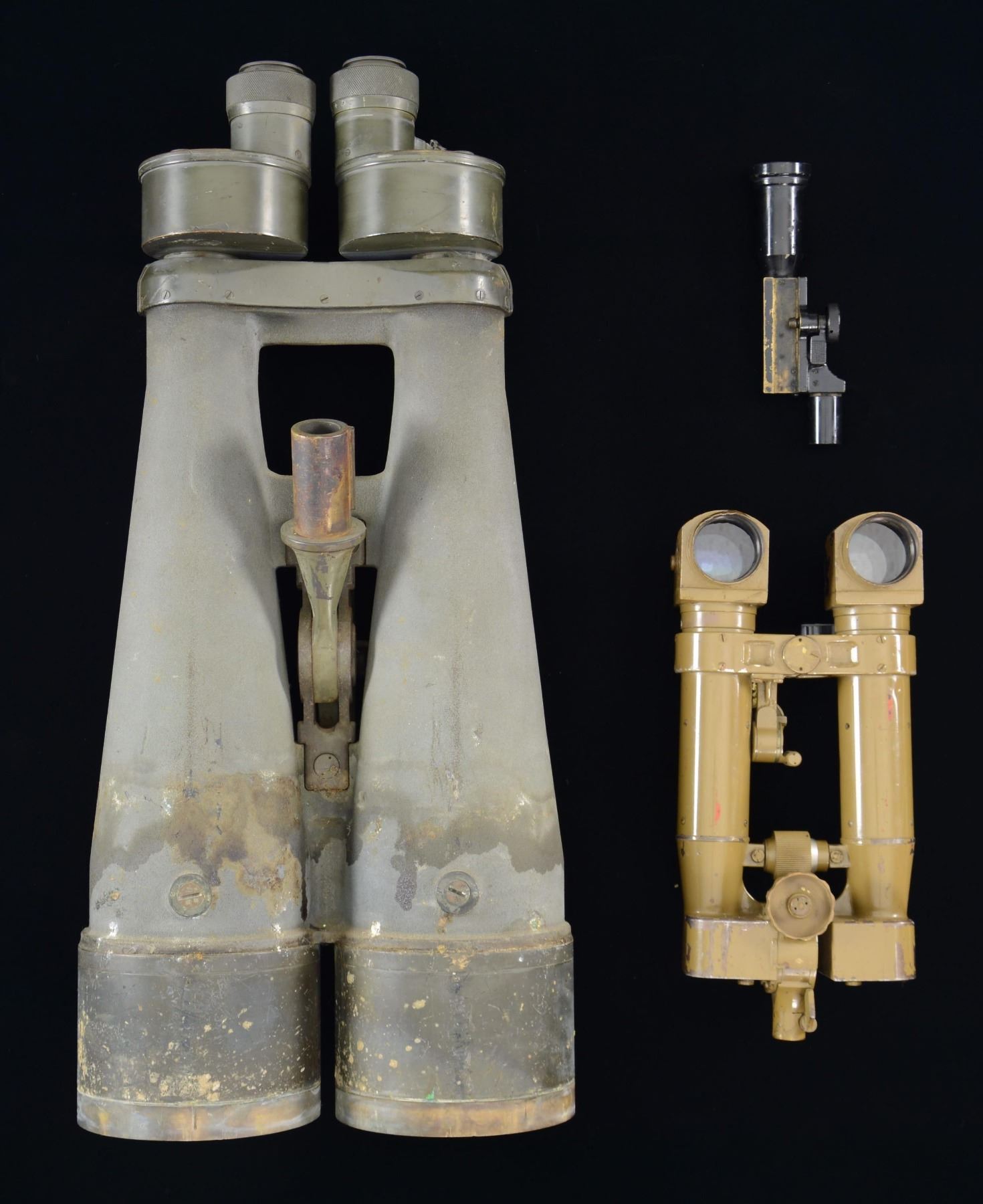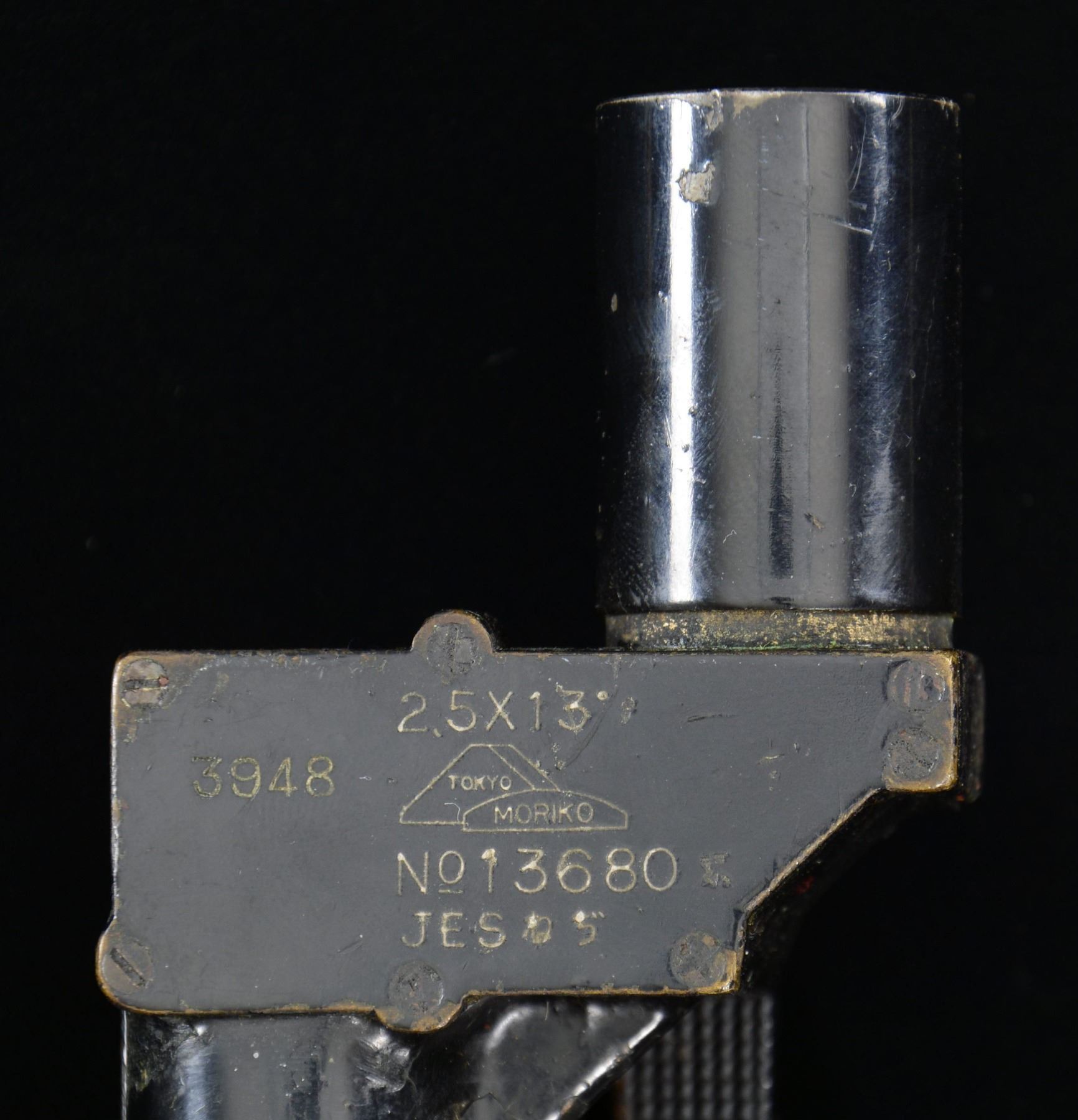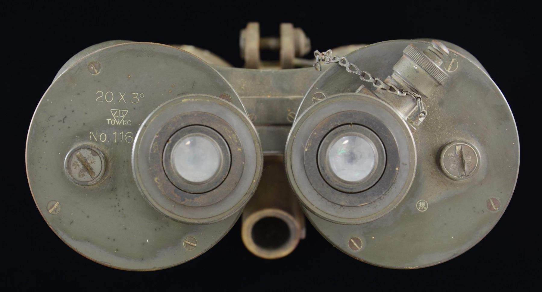 BINOCULARS, PERISCOPE, & TYPE 96/ TYPE 99 LIGHT MACHINE GUN SCOPE. 1) Japanese 20x120 naval observation binoculars, mfg. by Tokyo Optical Company. Rear of the left optic is marked "20 x 3/ (Tokyo Optical Company logo)/ No. 1165," with two encircled Kanji characters marked on the rear of the right optic. Aluminum construction, with brass lens shields, and what appears to be an original green painted exterior. Steel elevation adj. assembly and brass socket mount are present. Left optic housing exhibits what appears to be a shrapnel strike, which pierced the housing, with a second smaller shrapnel strike present nearby that did not fully pierce the housing. CONDITION: exterior retains the majority of its green painted exterior, exhibiting mild wear, scattered superficial handling marks, as well as areas of water-related staining and oxidation towards the forward end of the housings. Optics are unserviceable, exhibiting dirt and/or moisture buildup on the interiors, but otherwise remain intact. 2) Japanese military 8x periscope. Exterior if unmarked, save for a few Kanji characters, with a mostly illegible "8x62" over the S# preset on the rear. Primarily brass construction, with what appears to be an original brown painted exterior. CONDITION: exterior retains the majority of its brown painted finish, exhibiting scattered spots/areas of flaking that show through to either a layer of red paint or bare gray metal overall. Adj. knobs all appear to function properly. Optic is hazy, exhibiting scattered spots of dirt overall. Eye cups exhibit a single crack on their sides. 3) Japanese Type 96 / 99 light machine gun 2.5x machine gun scope, mfg. by Tokyo Moriko. Top of scope is marked "2.5x13/ 3948 (Tokyo Moriko logo)/ No. 13680/ JES (Kanji characters). Brass and steel construction, with a black painted exterior finish. CONDITION: exterior retains the majority of its original black painted finish, exhibiting scattered spots of flaking, with some edge wear present overall. Scope retains a clear and sharp optic, with a few small black spots. A very attractive assortment of Imperial Japanese optical equipment. (02-22968/MLW). $1,000-2,000.