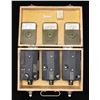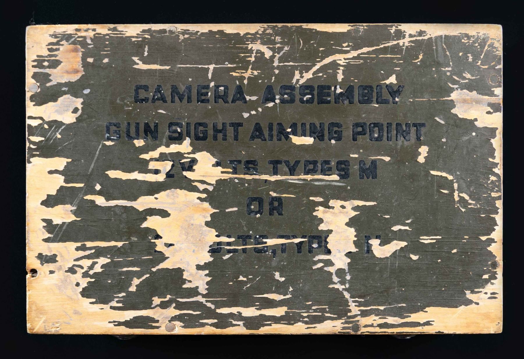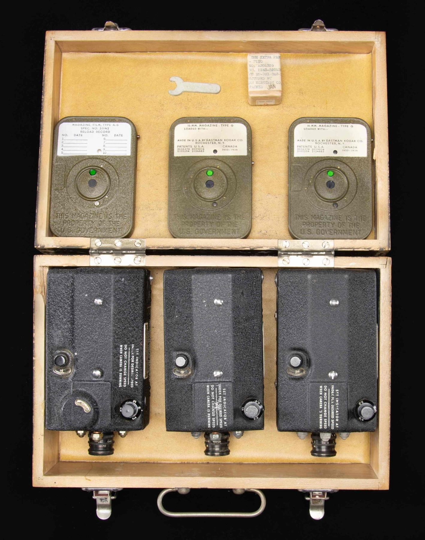 CAMERAS WITH TRANSIT CHEST. Lot consists of 3 U.S. WWII N-6 & AN-N6 35mm aviation cameras. These cameras were primarily utilized on P-51, P-47, and P-38 fighter aircraft, while also being fitted on the B-29 heavy bomber. 1) x2 N-6 35mm aviation cameras mfg. by The Lackner Co., Inc. Cameras exhibit white ink markings, with data plates mounted on the side. 1 S# "AC44-50159", the other S# "AC44-52542. Alloy construction with black "wrinkle" finish. 2) x1 AN-N6 35mm aviation camera mfg. by Fairchild Camera & Instrument Corp. Camera exhibits white ink markings, with a data plate on one side. S# "AF-41333". UNATTACHED ACCESSORIES: green painted wood transit chest containing 3 Kodak mfg. film reel canisters (x1 A-6, x2 Type G 16mm) and 1 spare plug cardboard box containing small screws. CONDITION: cameras are very good, with some light external wear. Transit chest shows scattered spots and areas of flaking overall, with a few cracks on corners. (02-25140/MLW). NON-GUN. $300-500.