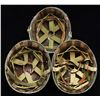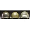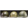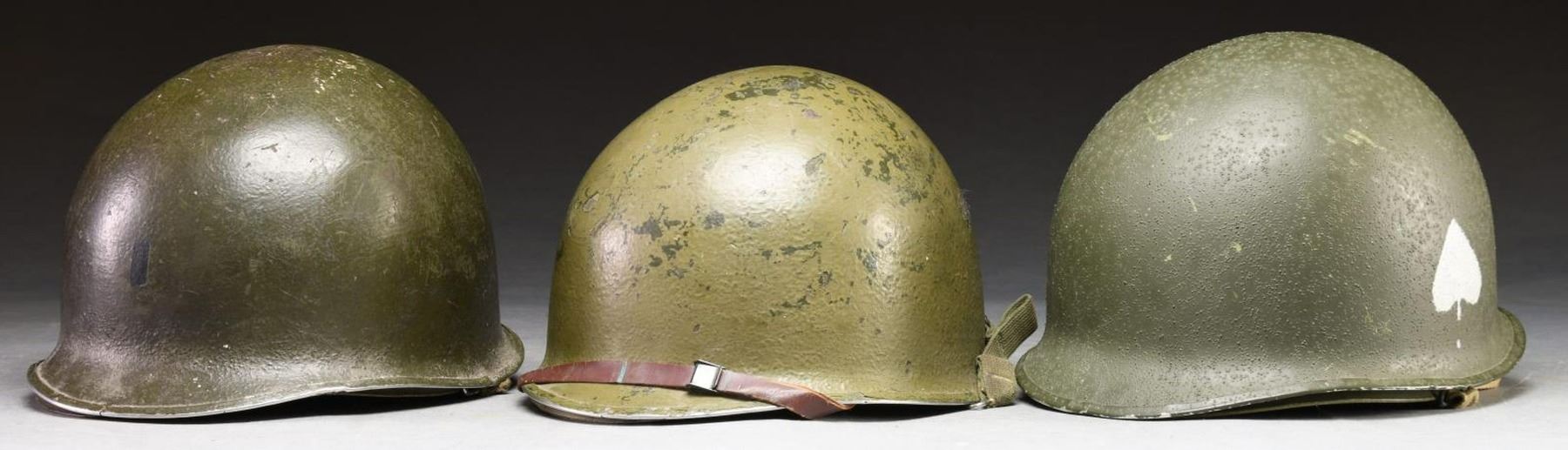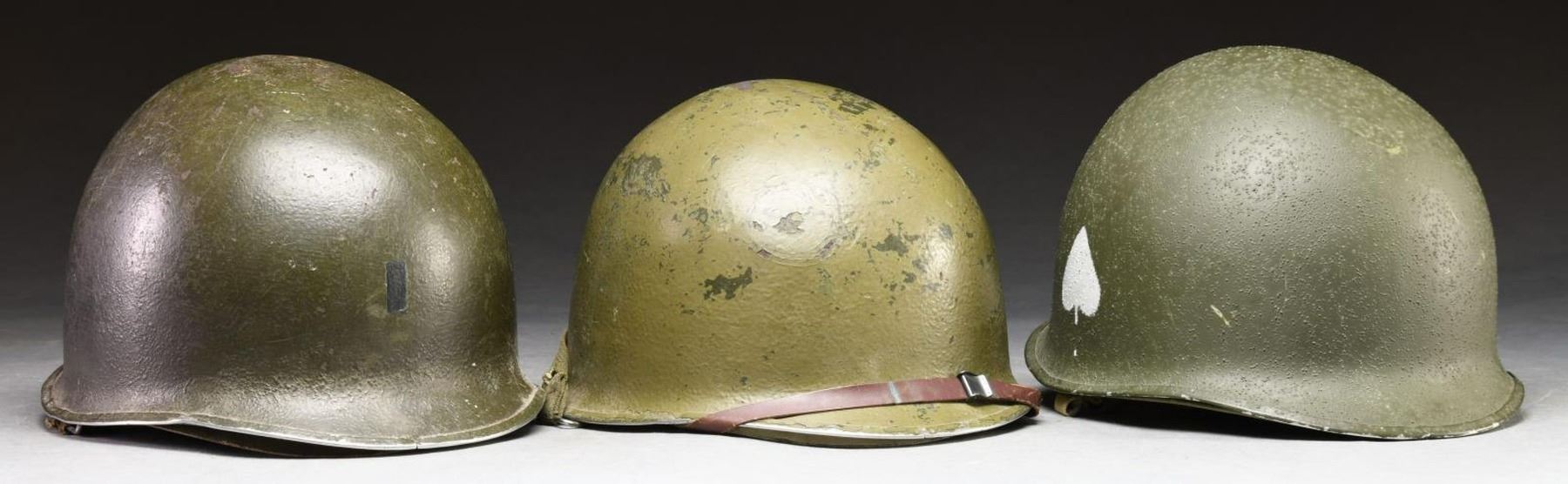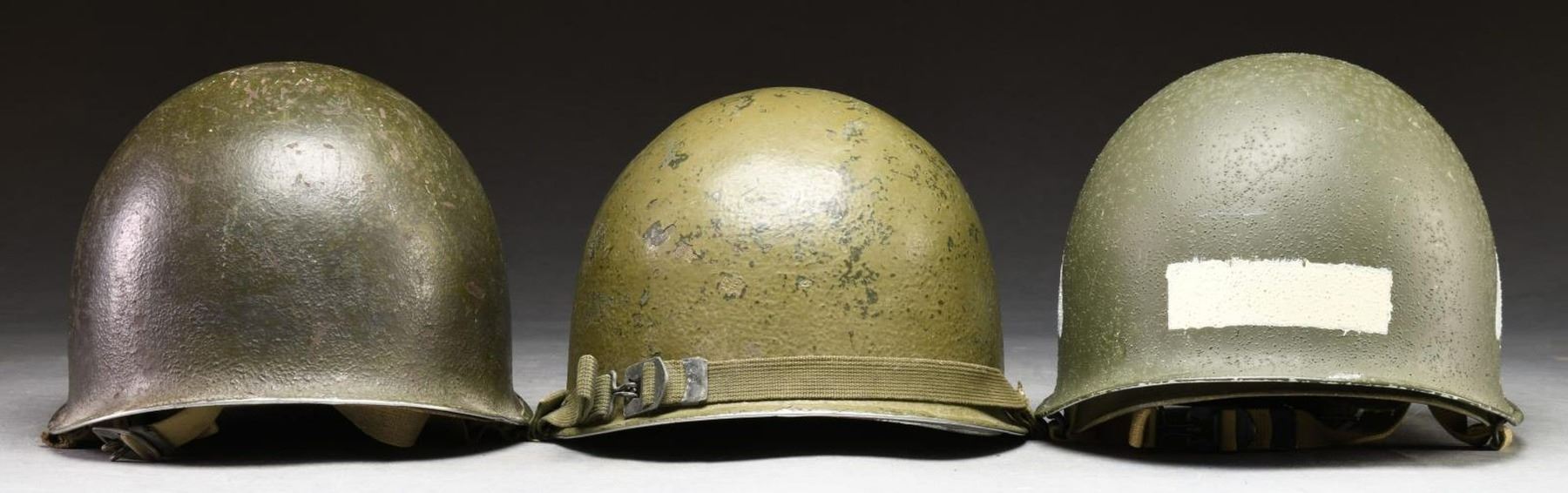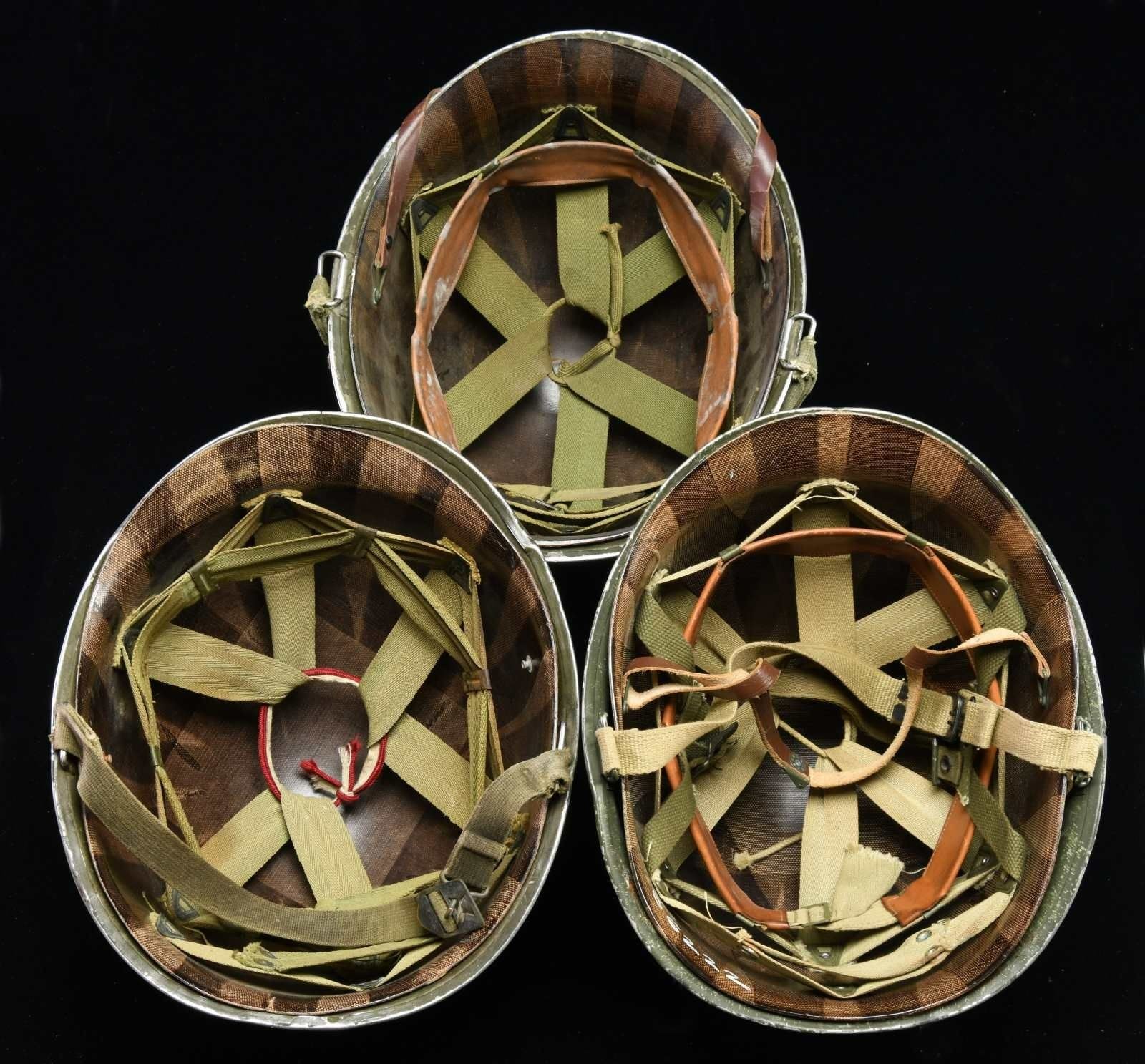 This lot consists of the following US M1 Helmets: 1. Front seam fixed bale helmet. Dark green painted front seam fixed WW2 M1 helmet w/ fixed bales. Front of helmet has what appears to be a black painted lieutenant insignia. Green chinstrap. Westinghouse liner. CONDITION: helmet shows scattered flaking w/ some oxidation. 2. Front seam Swivel Bale M1 Helmet. Medium green painted WW2 front seam swivel bale M1 Helmet. Firestone liner. Front of liner has name "RING" scratched into it. Green canvas chinstrap. Additional brown leather chinstrap mounted on inside of liner. CONDITION: paint shows scattered flaking & oxidation. 3. 506th PIR Front Seam Swivel Bale M1 Helmet. Front seam swivel bale M1 Helmet w/ white painted 506th paratrooper infantry regiment spade insignia. We are unable to determine the authenticity of these white painted insignias & ask the buyer to draw their own conclusions. In-person inspection is highly recommended. Dark green sanded finish w/ white stripe at rear. Inside of helmet has black "B-6222" markings at front & rear. Tan canvas chinstrap w/ name "BRIM" in dark ink. Capac airborne liner w/ white paint "B6222" at rear. CONDITION: paint shows scattered flaking, scuffing & some oxidation. (02-20936/MJC). $1000-2000.